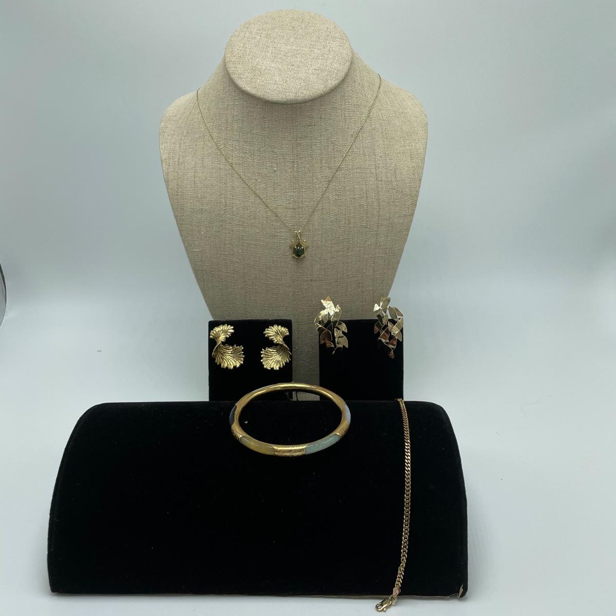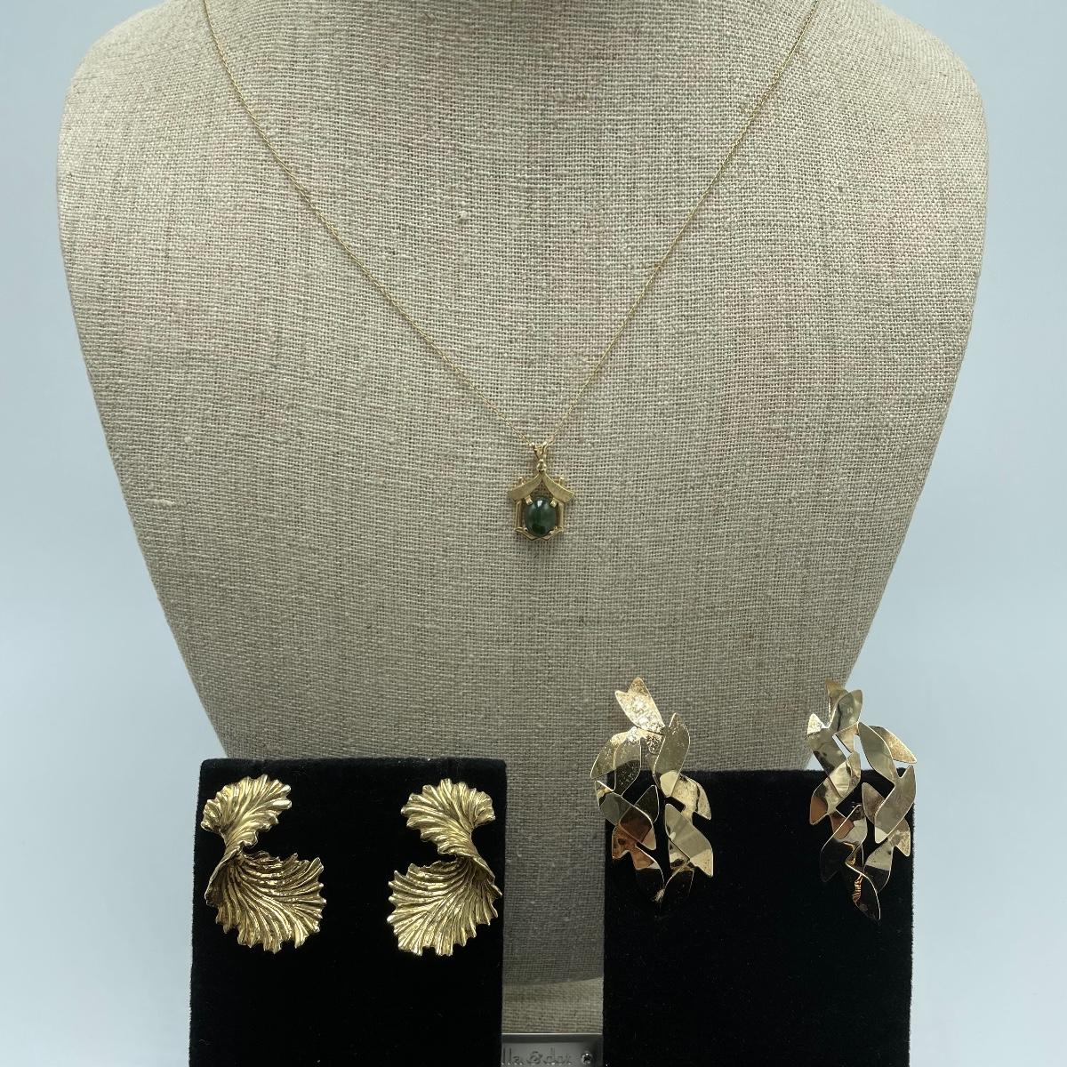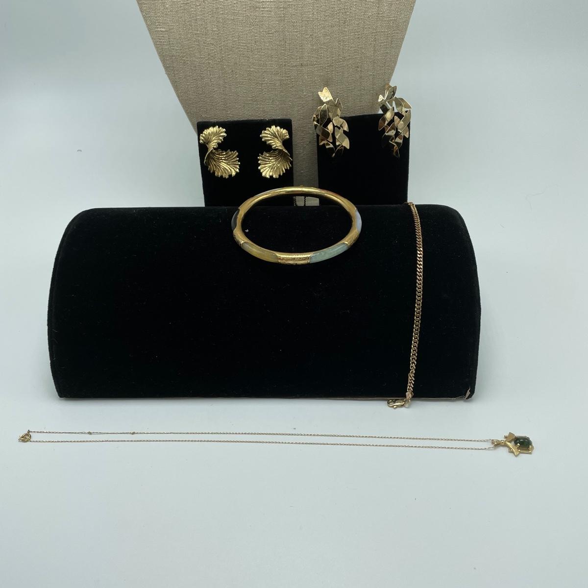 A beautiful lot filled with 14K gold and bracelet with stones. The necklace has an eastern Asian tone along with a multicolored jade bracelet. Two sets of large earrings will make a statement, both marked 14K and a simple, yet elegant 9K chain bracelet marked 375. See images. Shipping available.