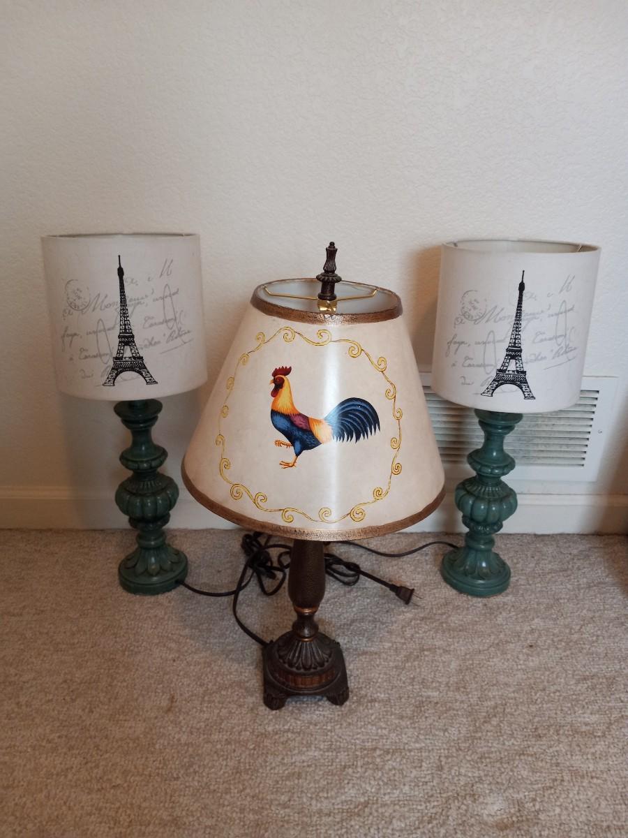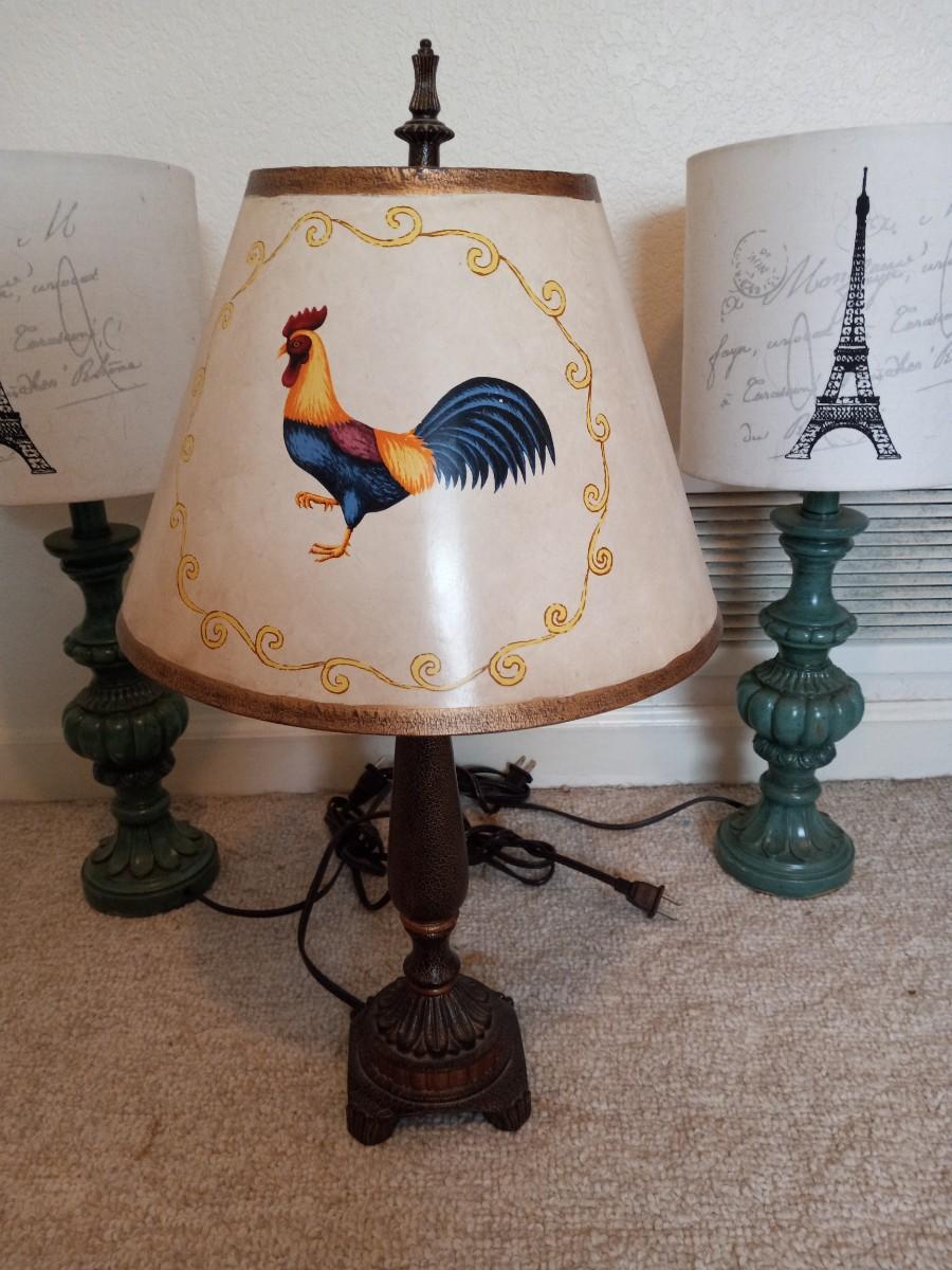 THREE SMALLER TABLE LAMPS THE ROOSTER ONE IS 22" THE OTHER TWO ARE 24"