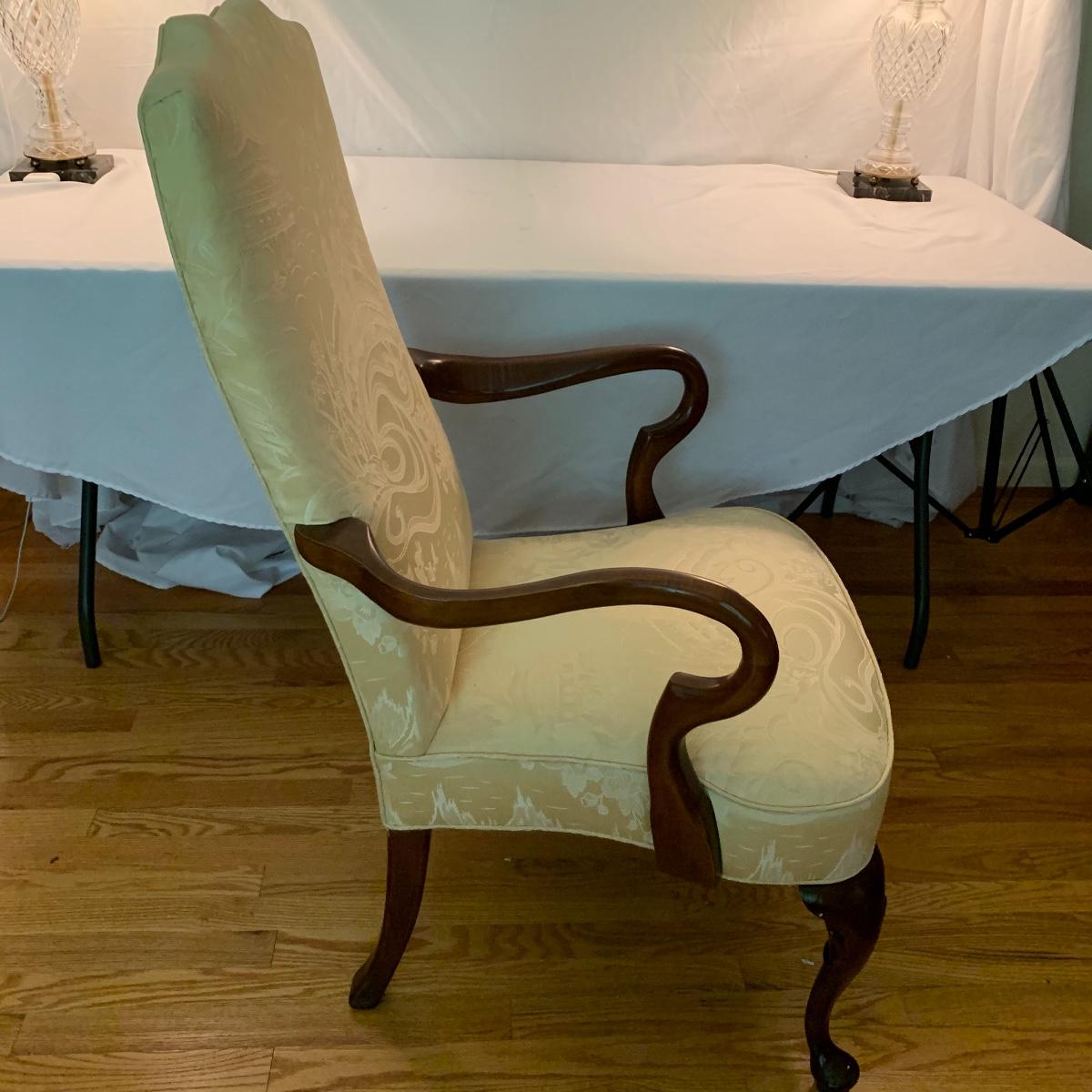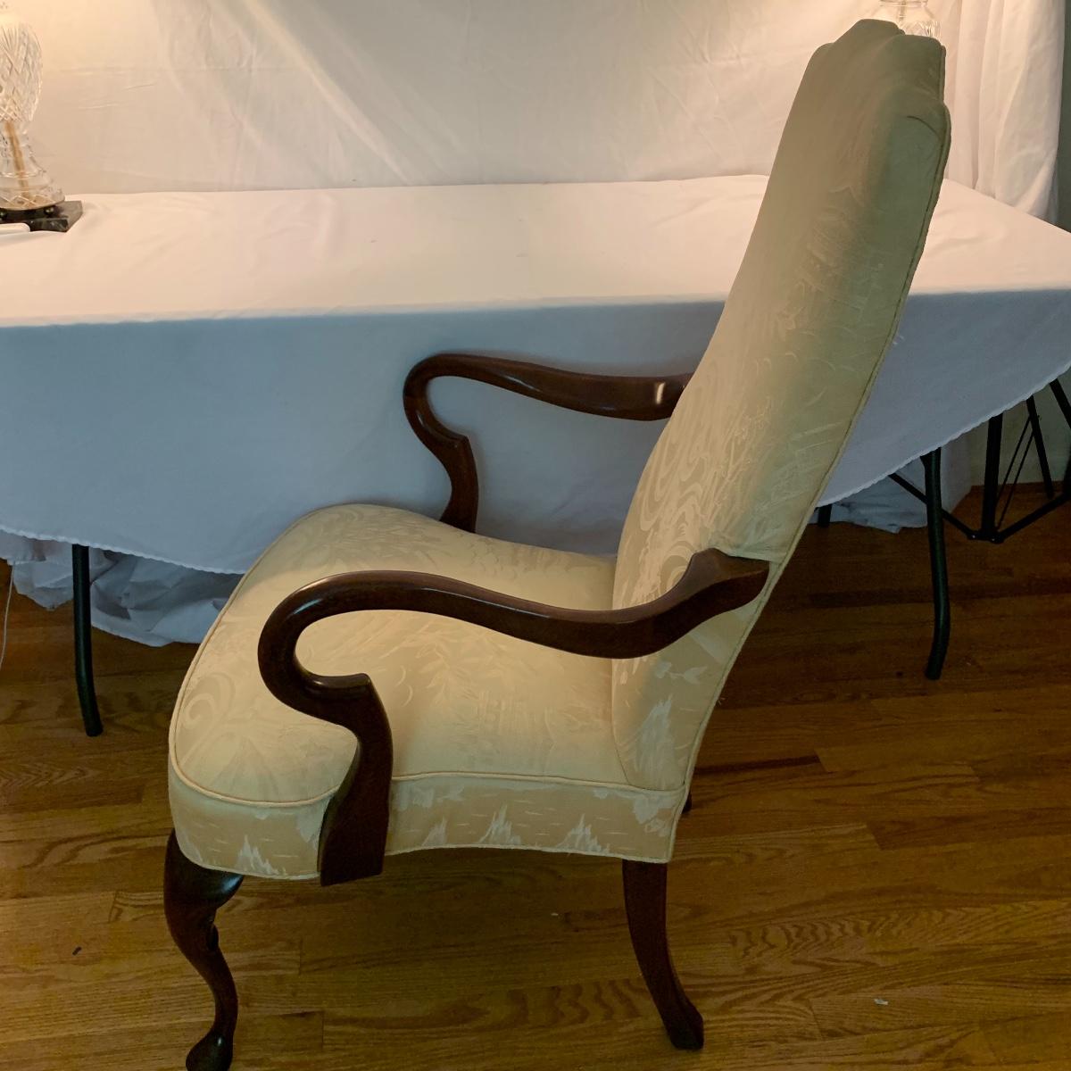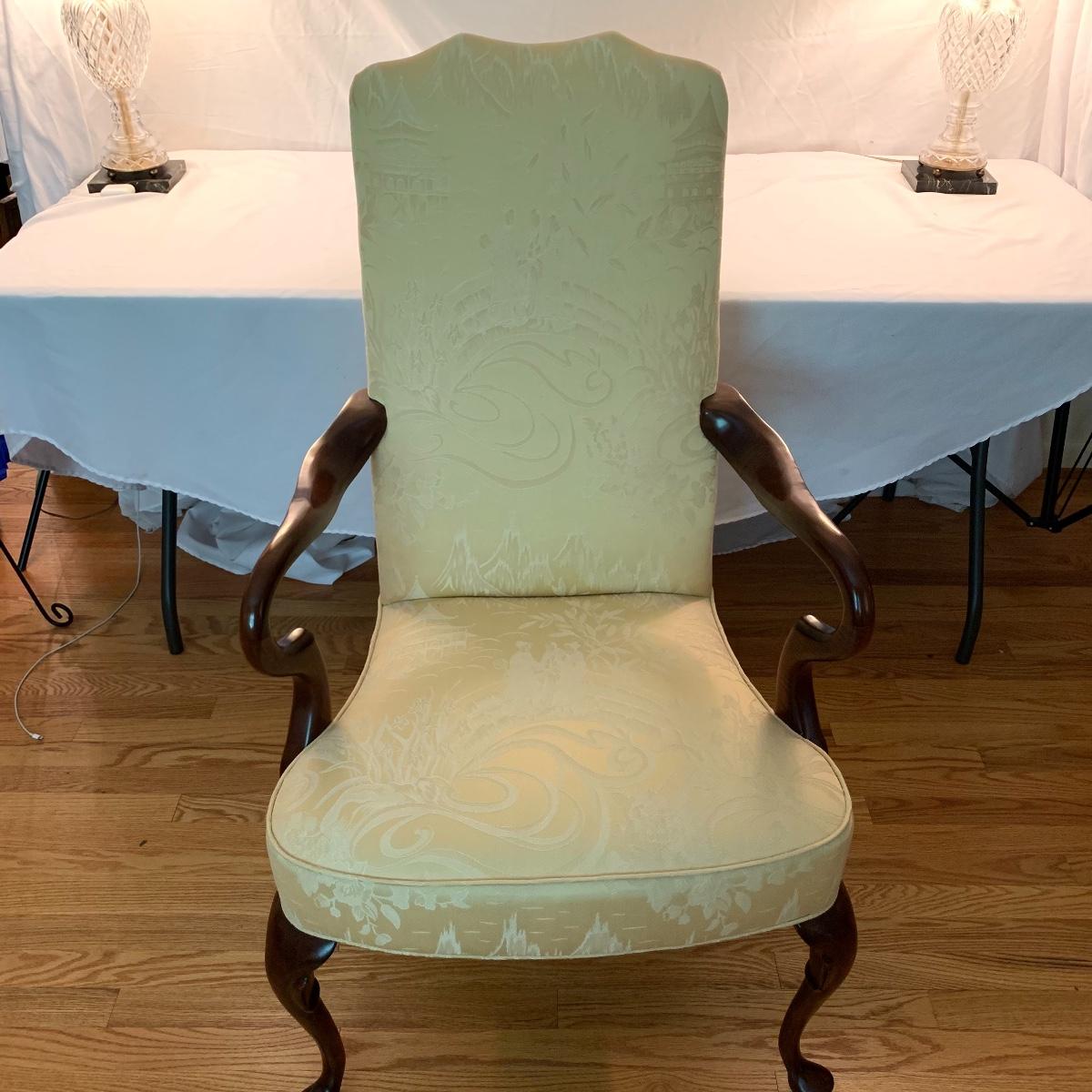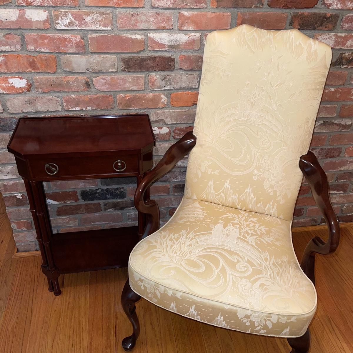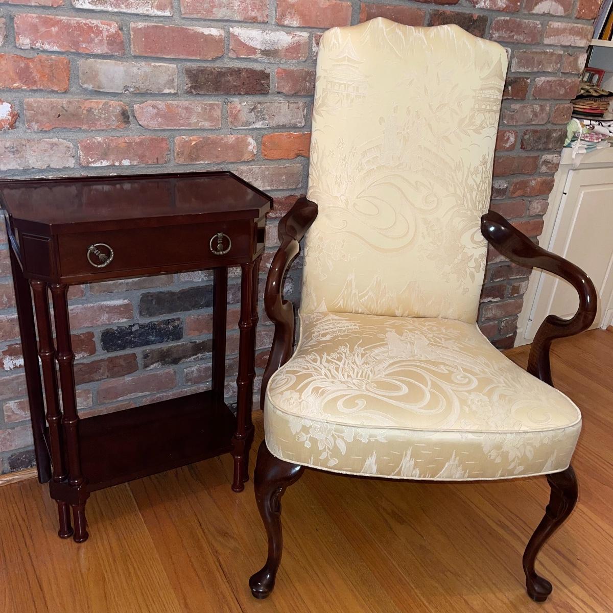 This lot includes one ivory Asian print arm chair and one slim, dark wood side table. The arm chair is from the brand Southwood. The chair is lightly embroidered with Asian scenery and is clean, free of blemishes. The legs and arms of the chair are made with a sturdy dark wood. The chair measures about 22in x 24in x 43in. The Bombay dark wood side table is pretty lightweight. There does not appear to be any major scratches or marks on the table. It measures 11in x 19.5in x 29in. Local pick up only.