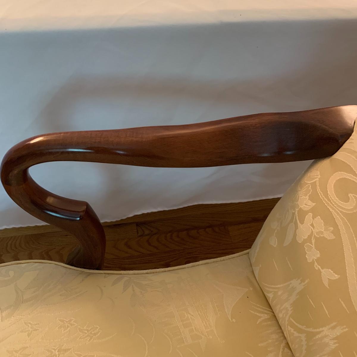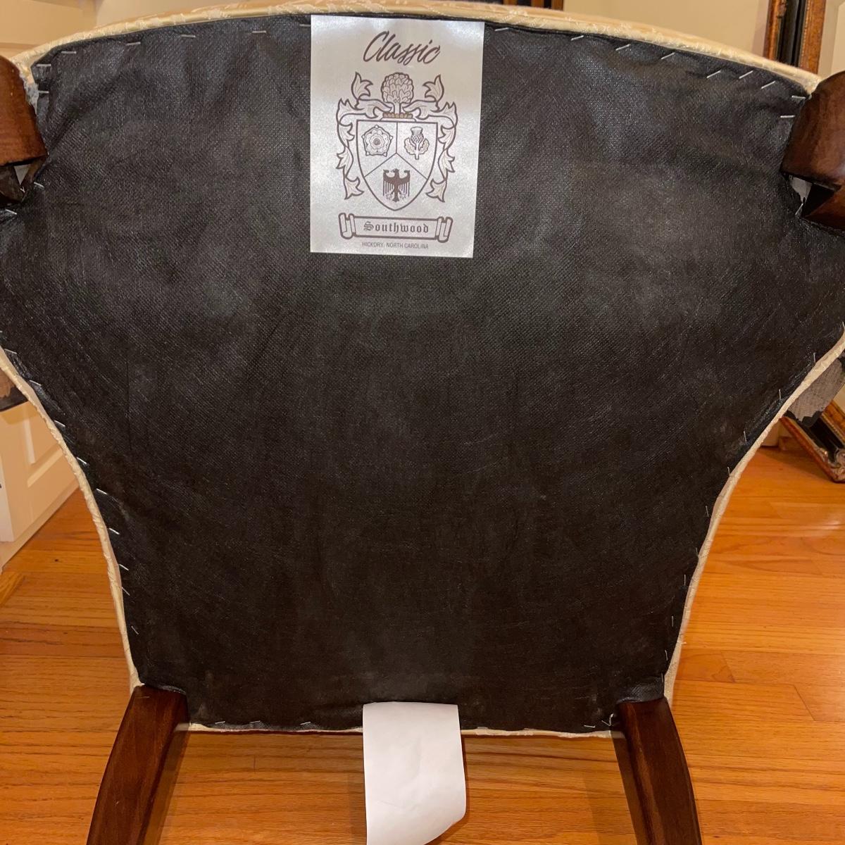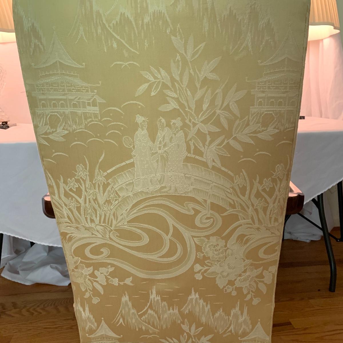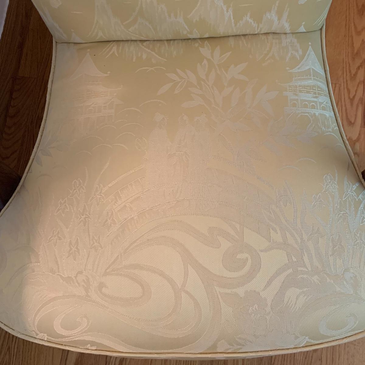 This lot includes one ivory Asian print arm chair and one slim, dark wood side table. The arm chair is from the brand Southwood. The chair is lightly embroidered with Asian scenery and is clean, free of blemishes. The legs and arms of the chair are made with a sturdy dark wood. The chair measures about 22in x 24in x 43in. The Bombay dark wood side table is pretty lightweight. There does not appear to be any major scratches or marks on the table. It measures 11in x 19.5in x 29in. Local pick up only.