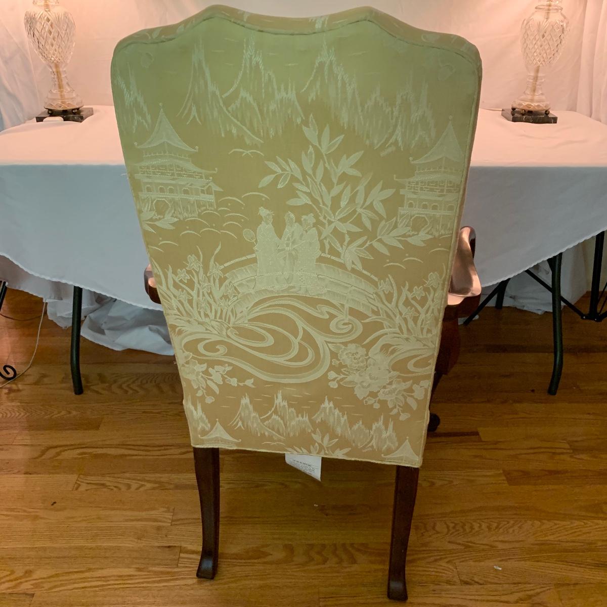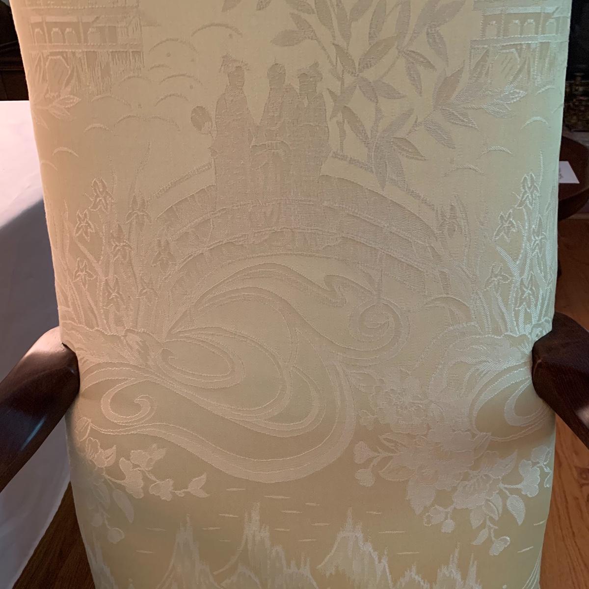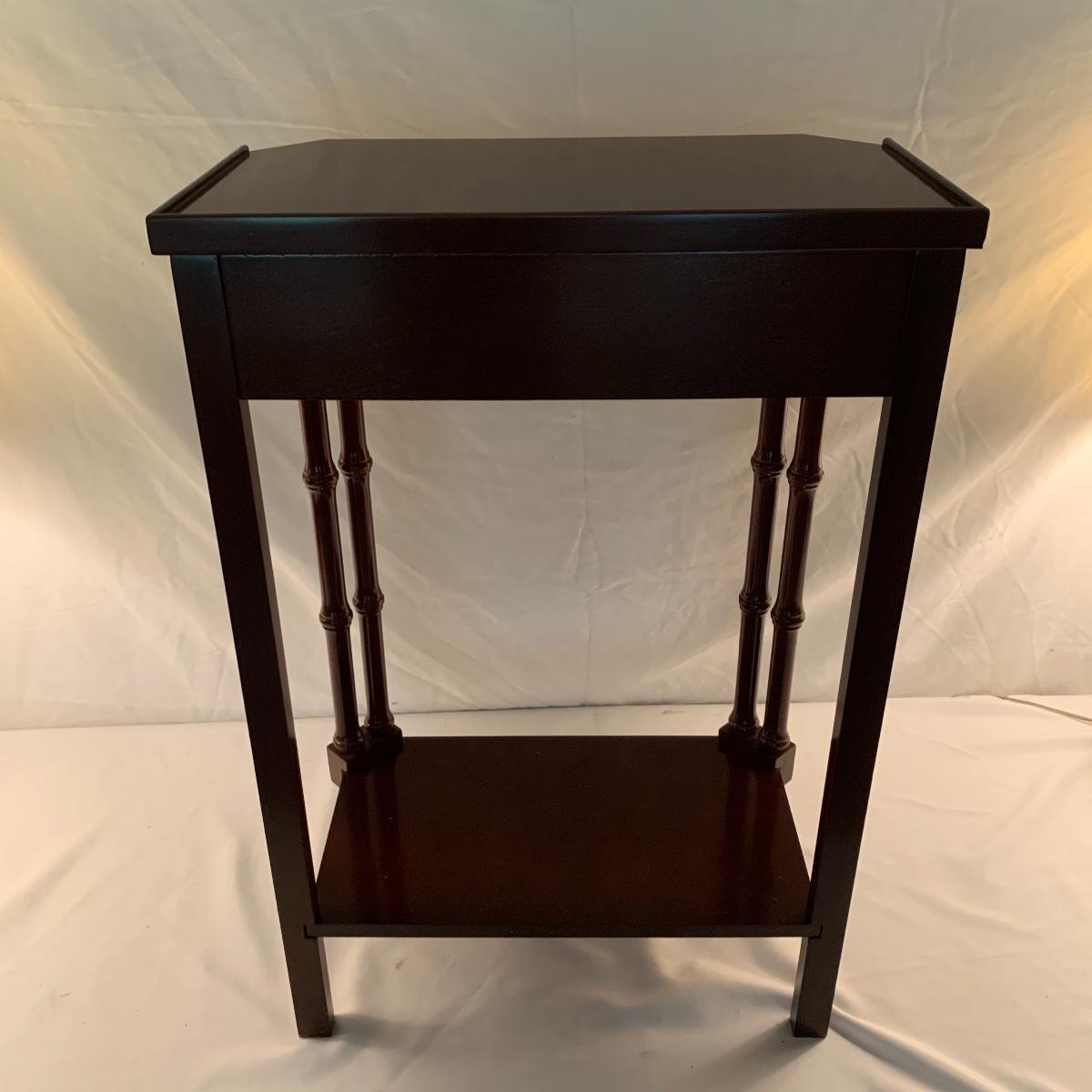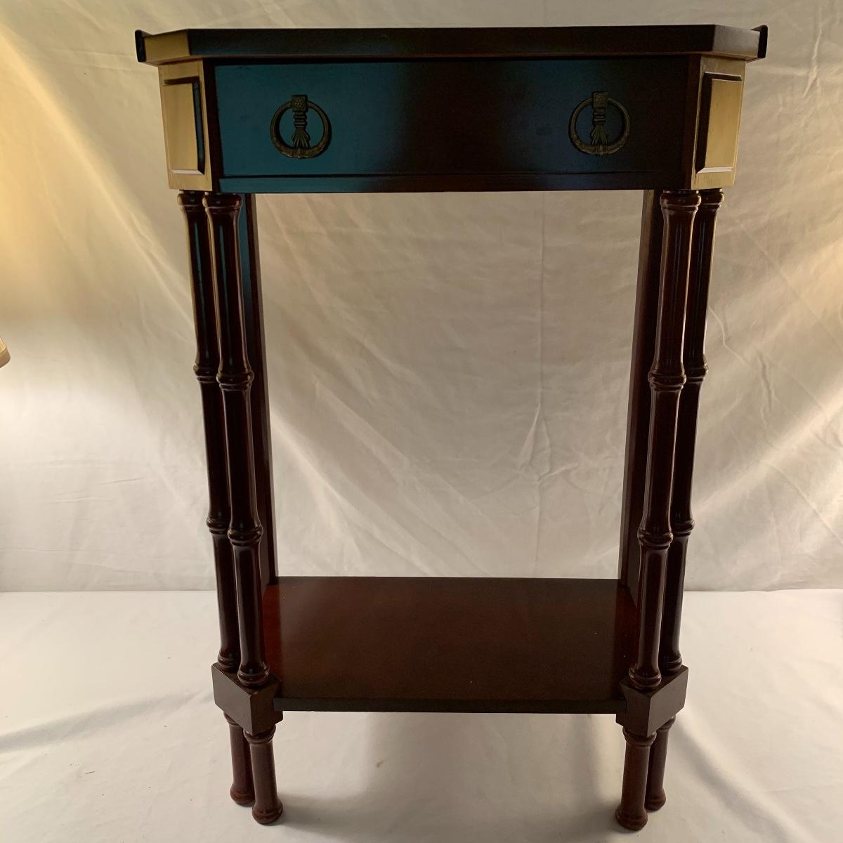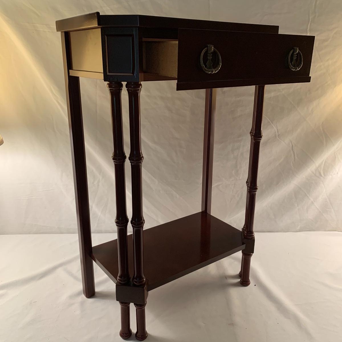 This lot includes one ivory Asian print arm chair and one slim, dark wood side table. The arm chair is from the brand Southwood. The chair is lightly embroidered with Asian scenery and is clean, free of blemishes. The legs and arms of the chair are made with a sturdy dark wood. The chair measures about 22in x 24in x 43in. The Bombay dark wood side table is pretty lightweight. There does not appear to be any major scratches or marks on the table. It measures 11in x 19.5in x 29in. Local pick up only.