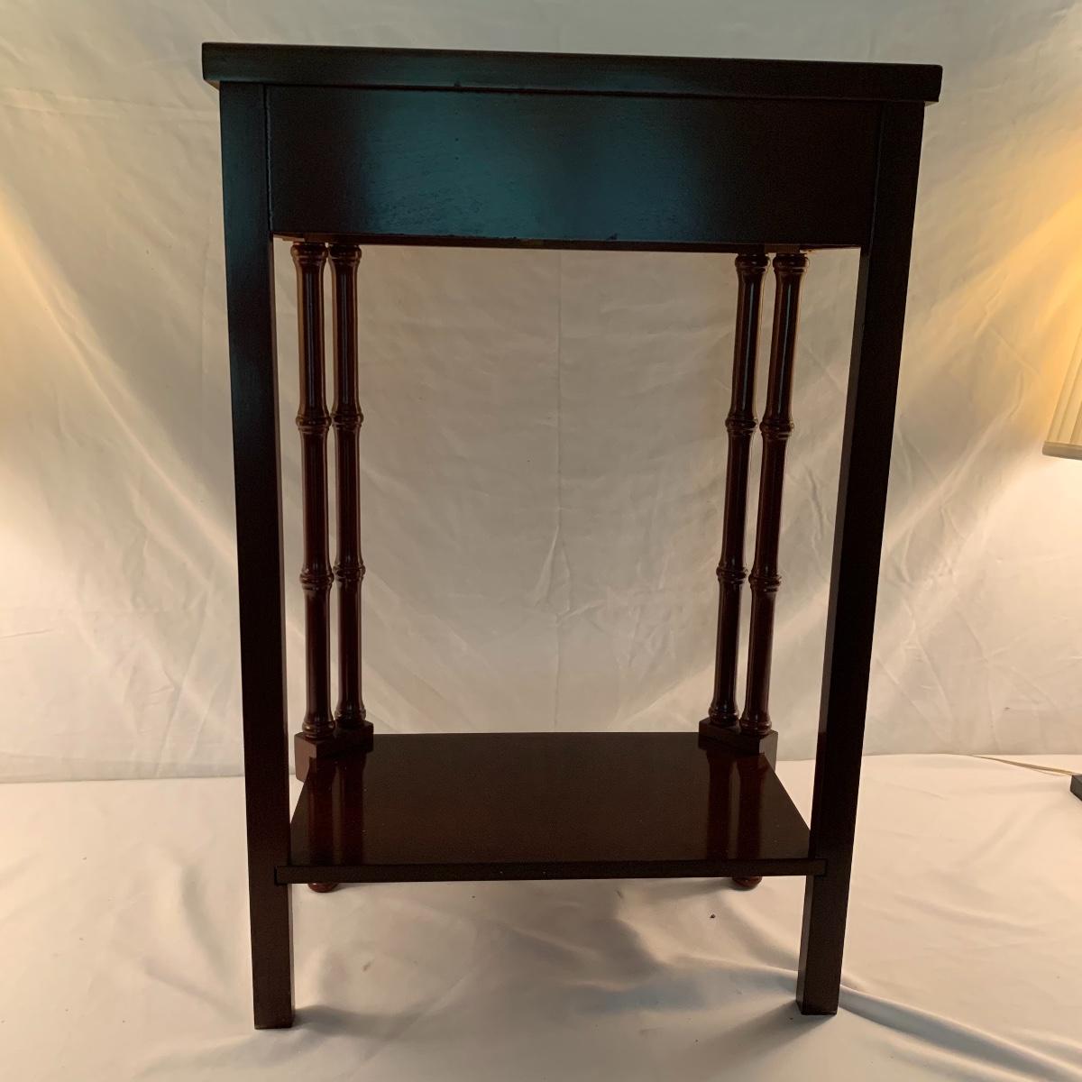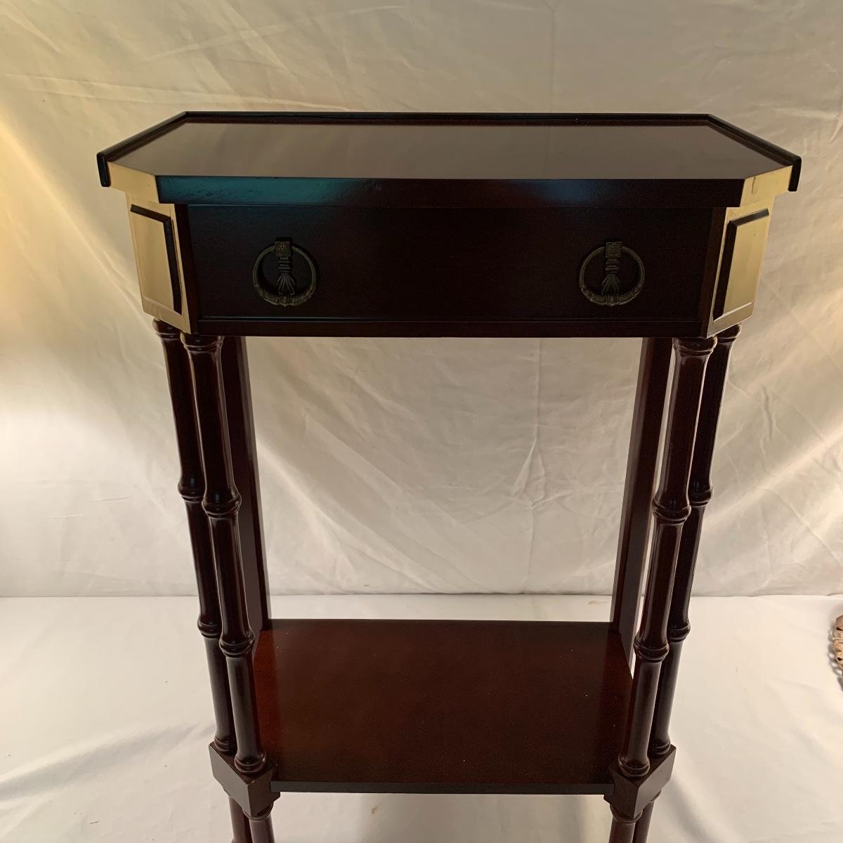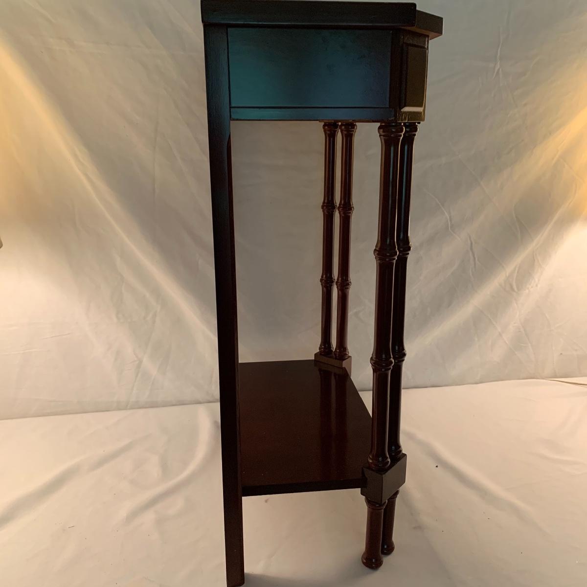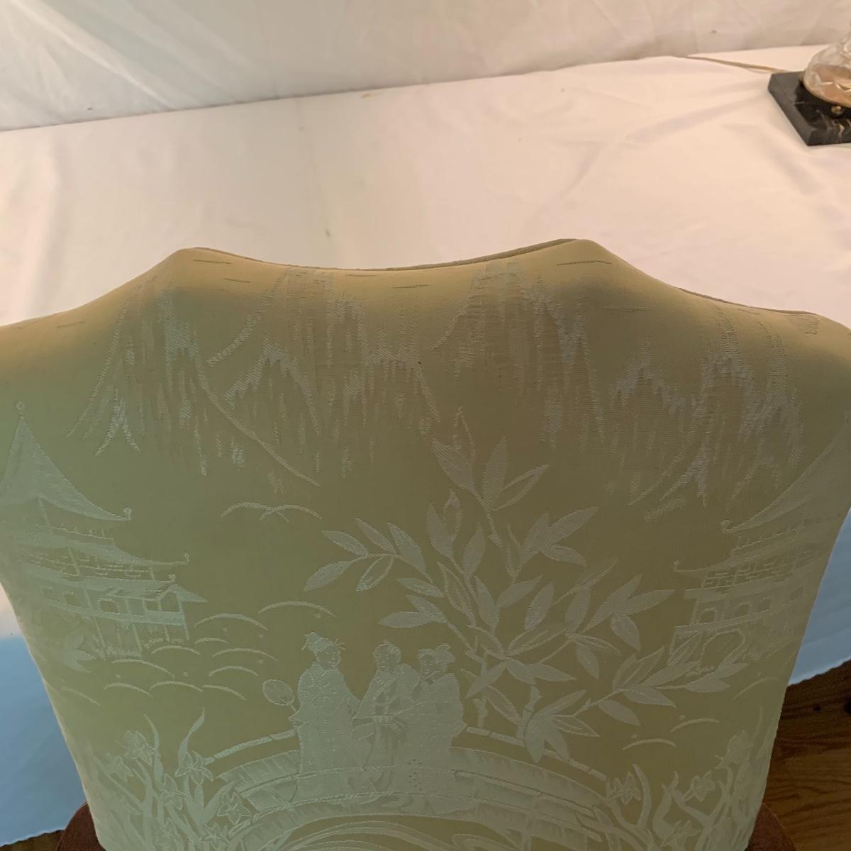 This lot includes one ivory Asian print arm chair and one slim, dark wood side table. The arm chair is from the brand Southwood. The chair is lightly embroidered with Asian scenery and is clean, free of blemishes. The legs and arms of the chair are made with a sturdy dark wood. The chair measures about 22in x 24in x 43in. The Bombay dark wood side table is pretty lightweight. There does not appear to be any major scratches or marks on the table. It measures 11in x 19.5in x 29in. Local pick up only.