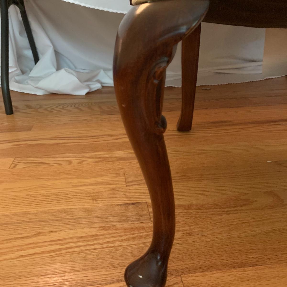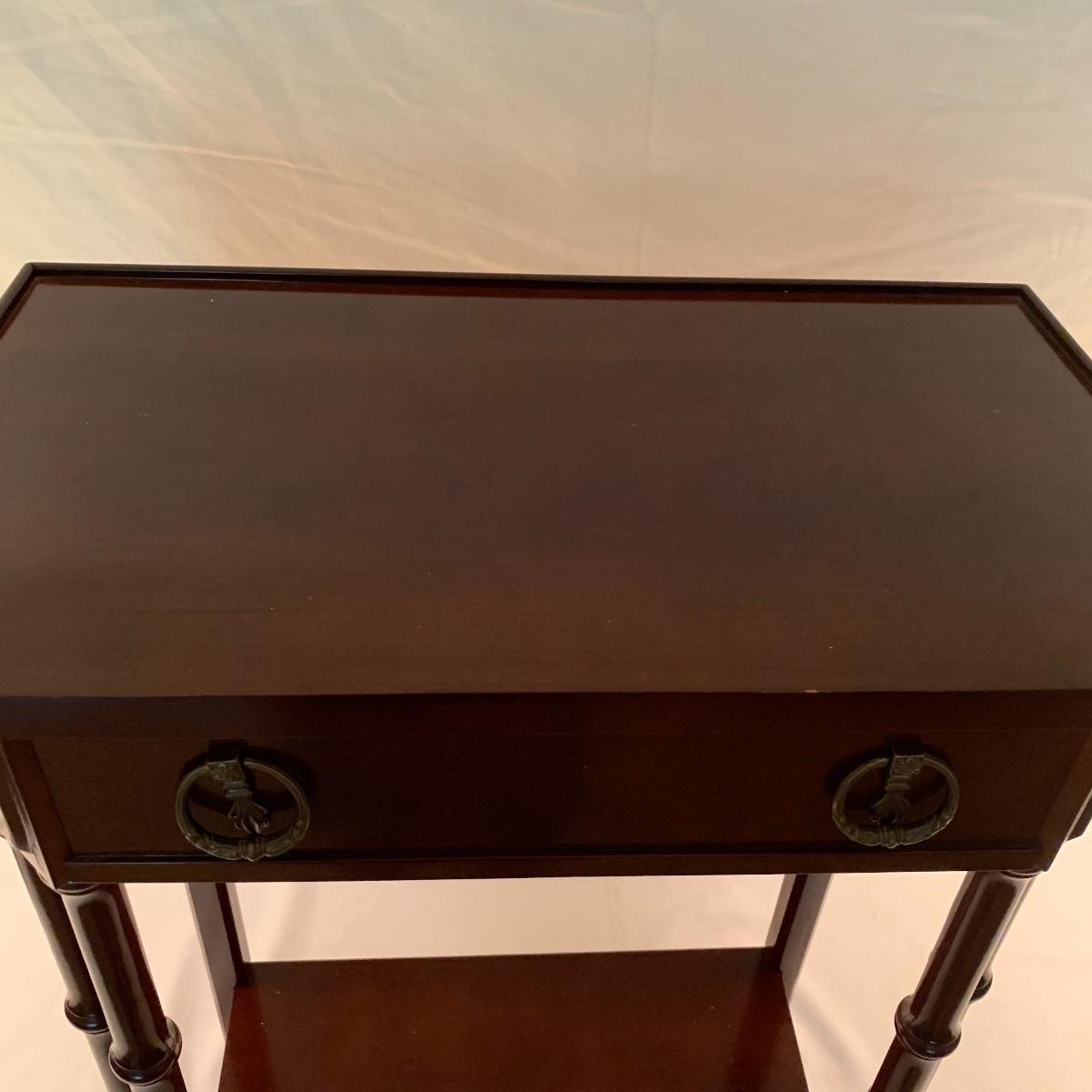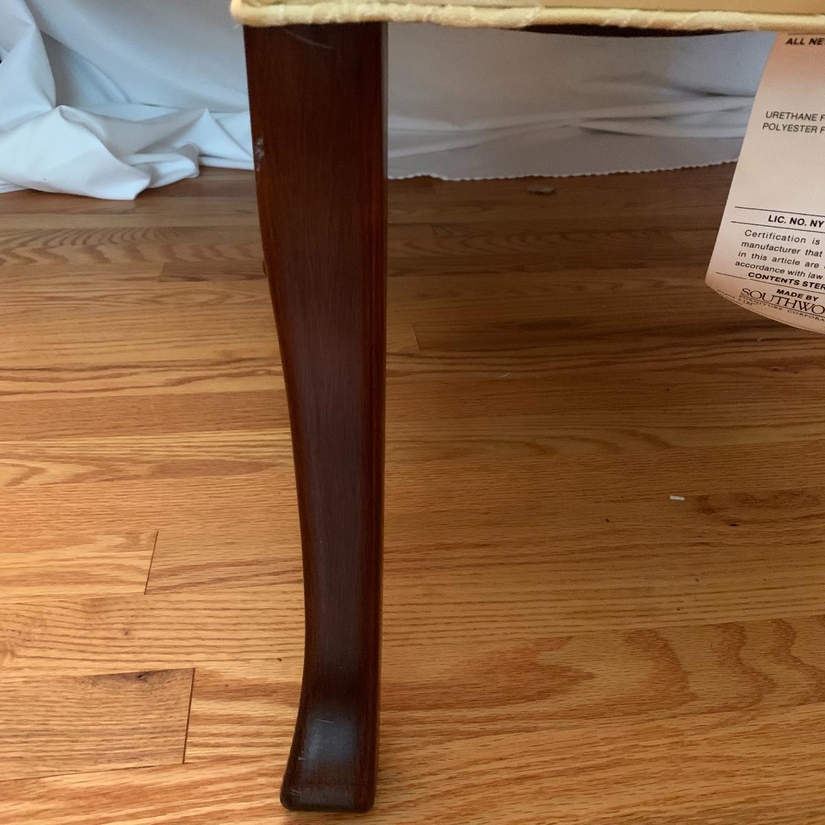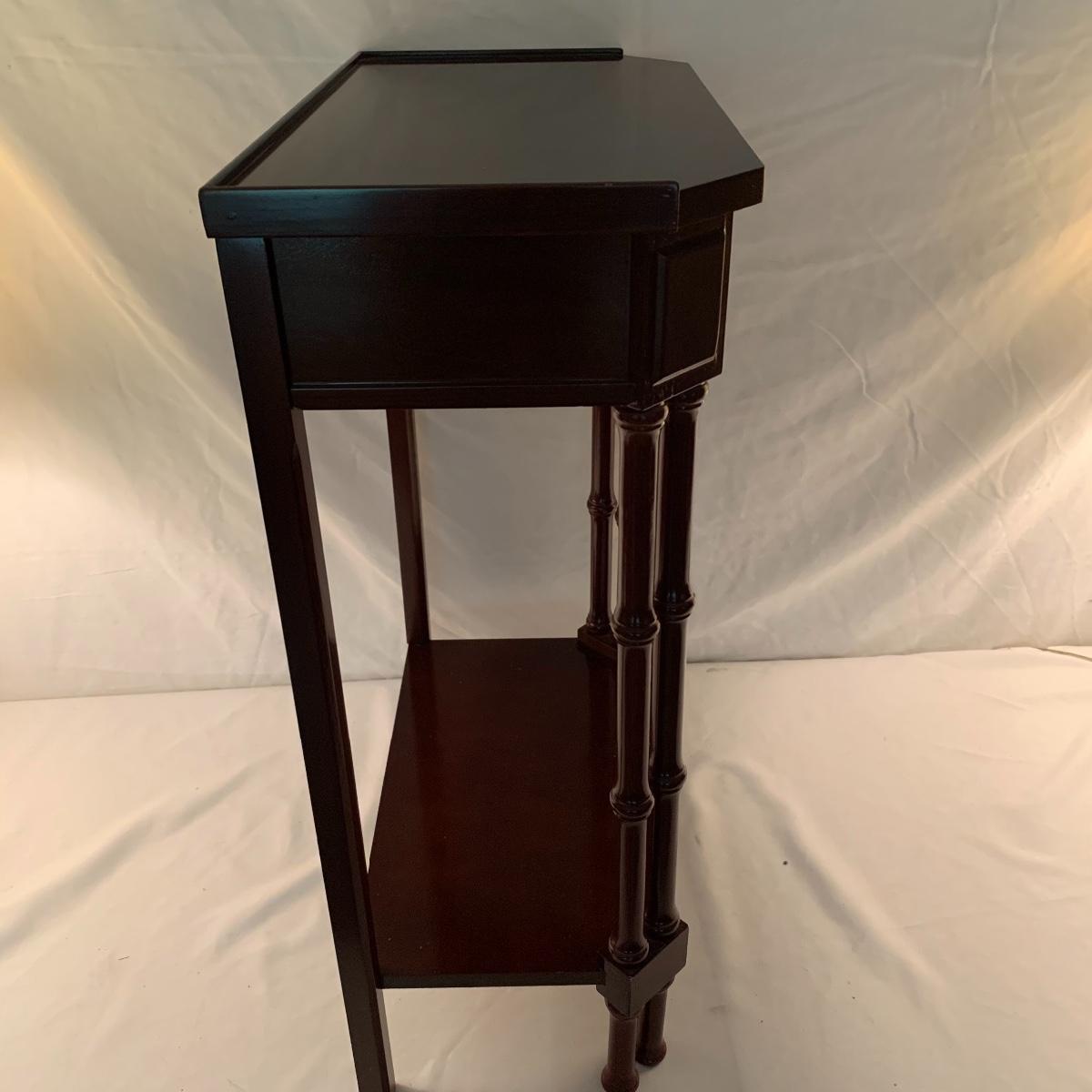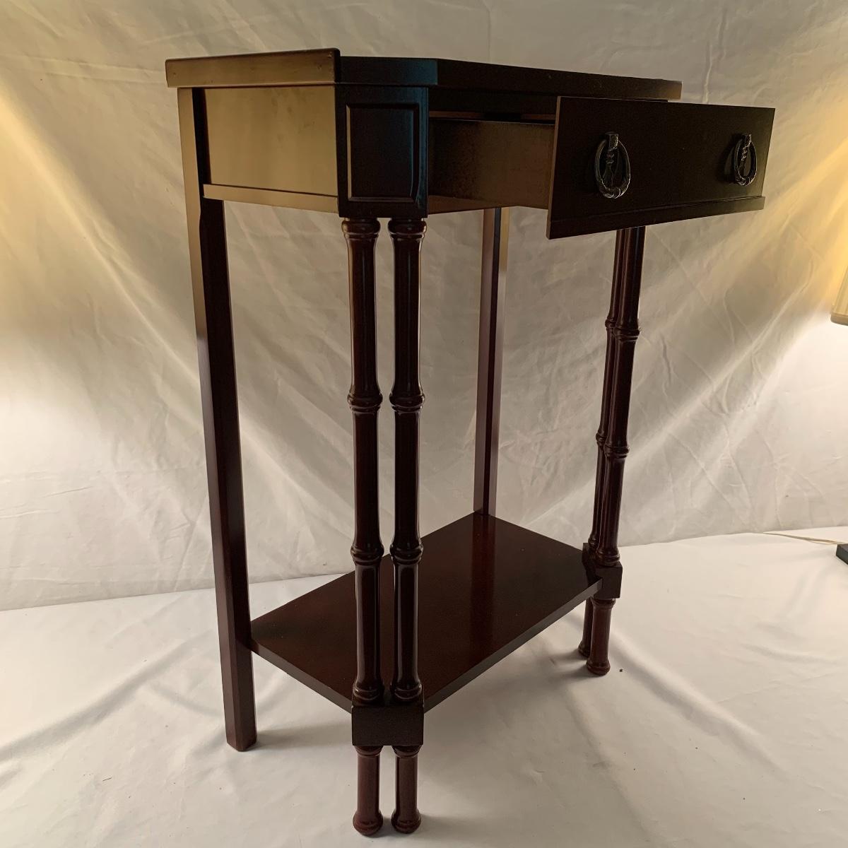 This lot includes one ivory Asian print arm chair and one slim, dark wood side table. The arm chair is from the brand Southwood. The chair is lightly embroidered with Asian scenery and is clean, free of blemishes. The legs and arms of the chair are made with a sturdy dark wood. The chair measures about 22in x 24in x 43in. The Bombay dark wood side table is pretty lightweight. There does not appear to be any major scratches or marks on the table. It measures 11in x 19.5in x 29in. Local pick up only.