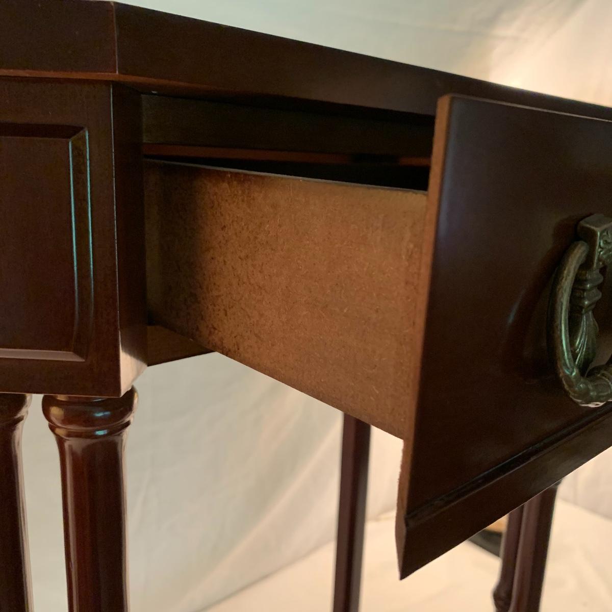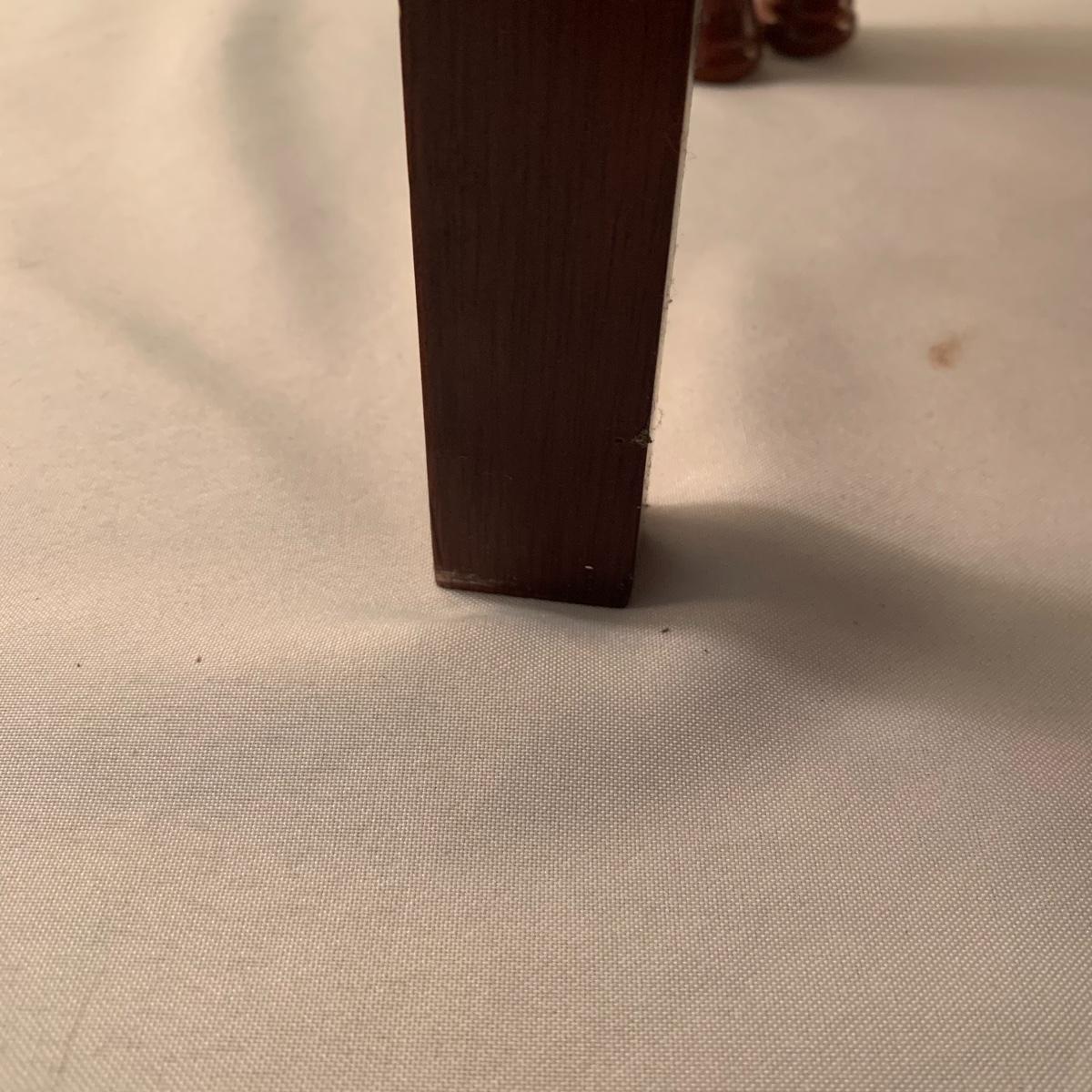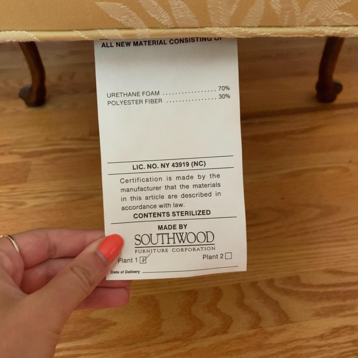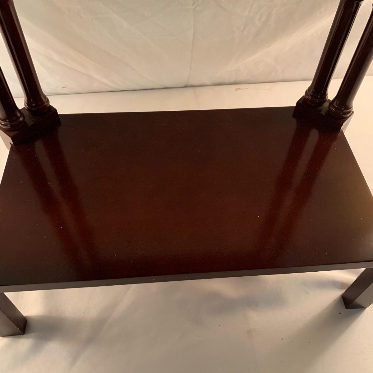 This lot includes one ivory Asian print arm chair and one slim, dark wood side table. The arm chair is from the brand Southwood. The chair is lightly embroidered with Asian scenery and is clean, free of blemishes. The legs and arms of the chair are made with a sturdy dark wood. The chair measures about 22in x 24in x 43in. The Bombay dark wood side table is pretty lightweight. There does not appear to be any major scratches or marks on the table. It measures 11in x 19.5in x 29in. Local pick up only.