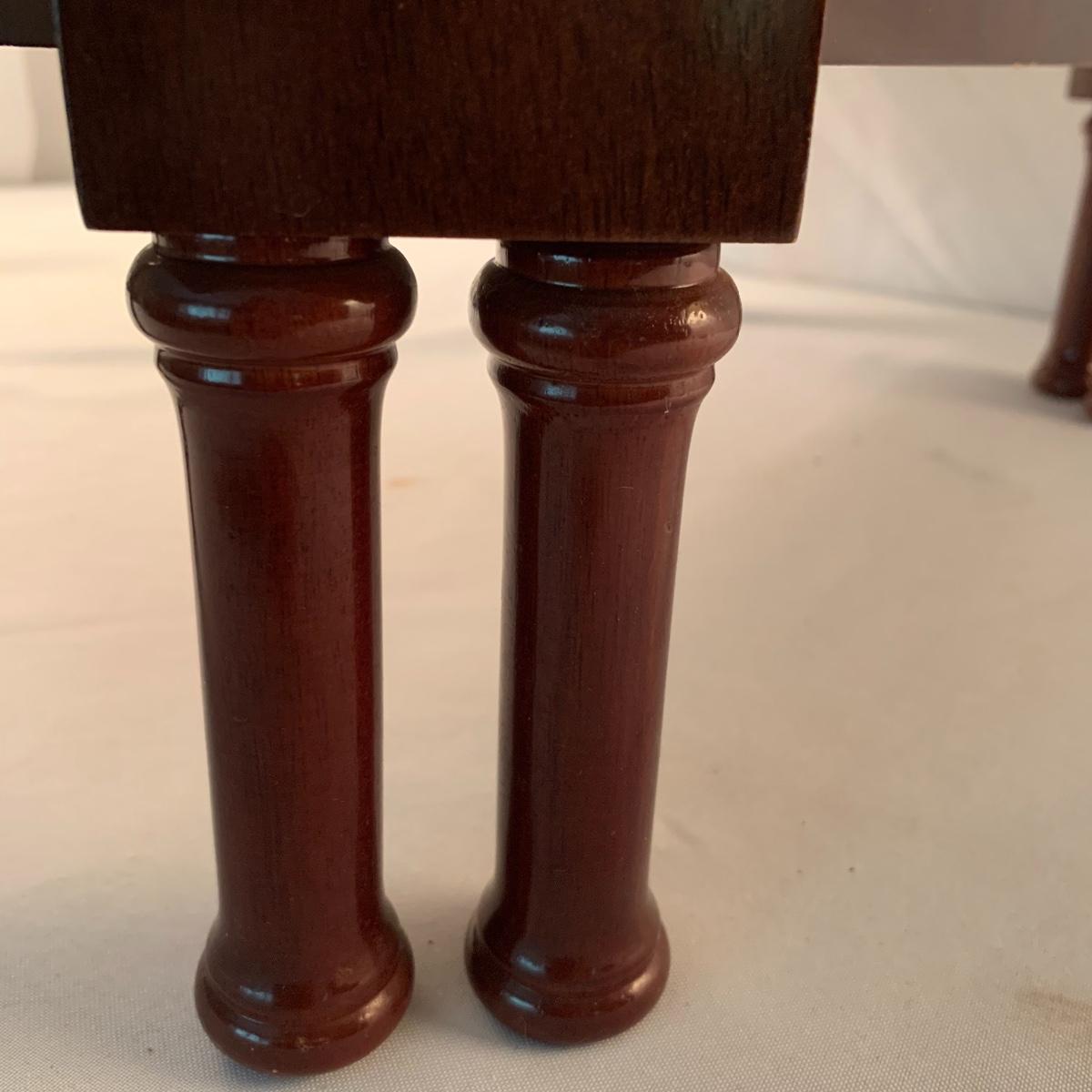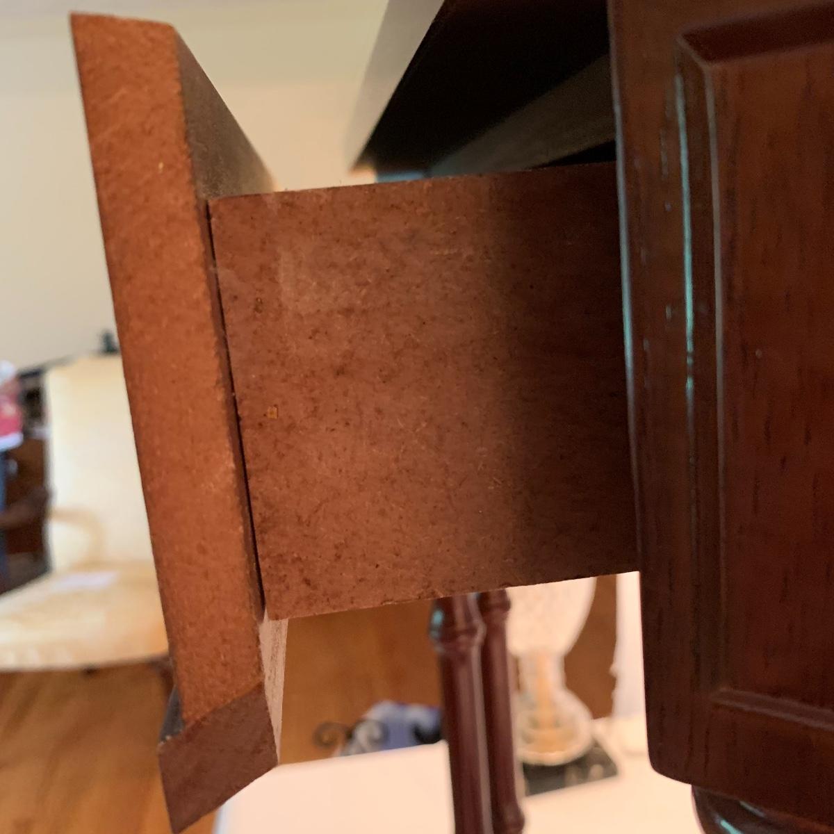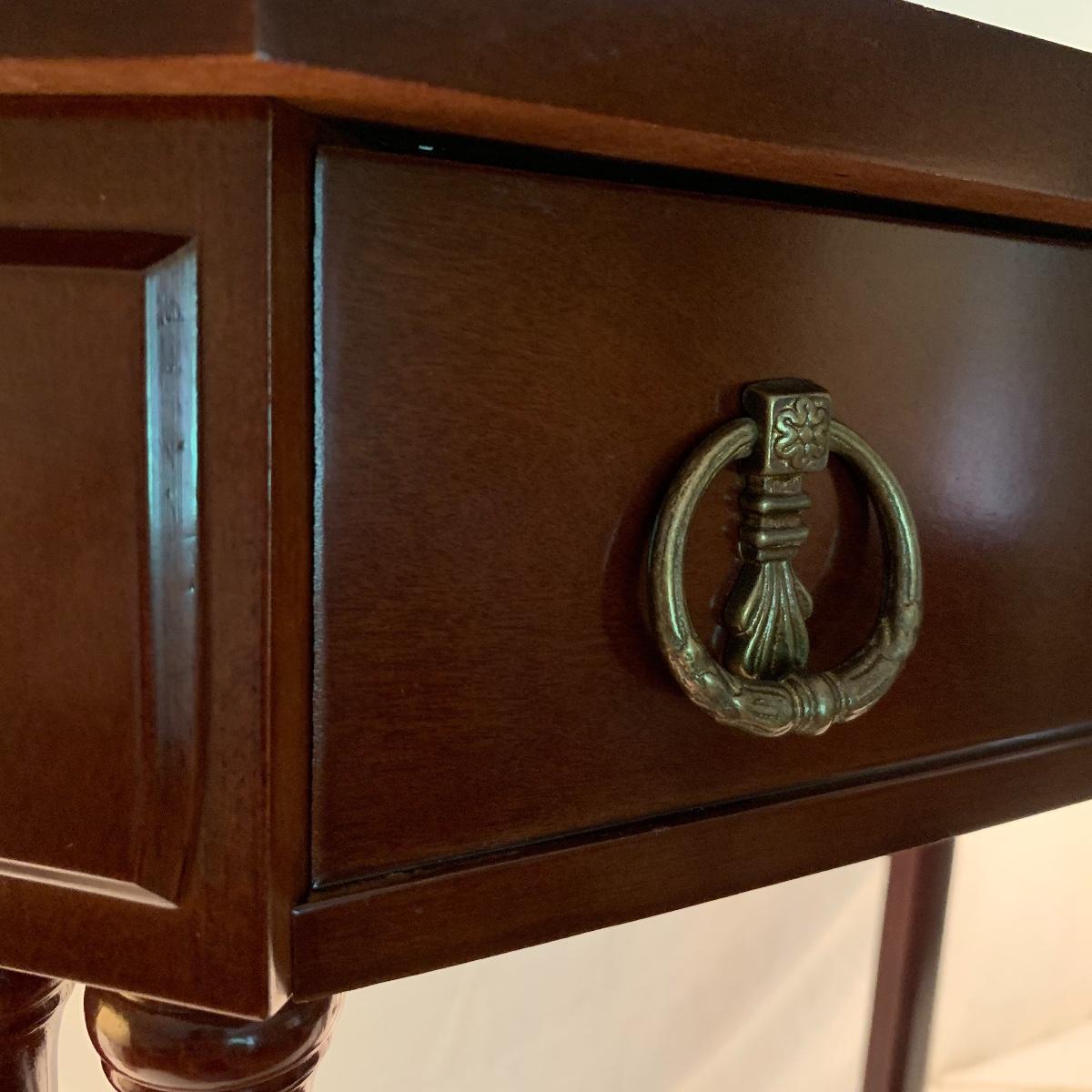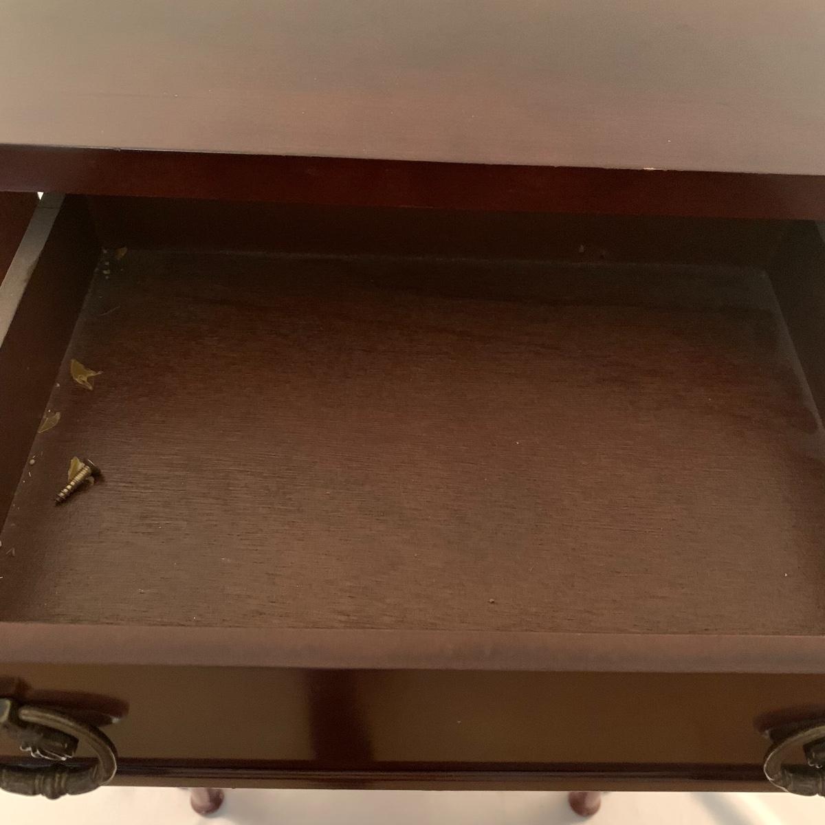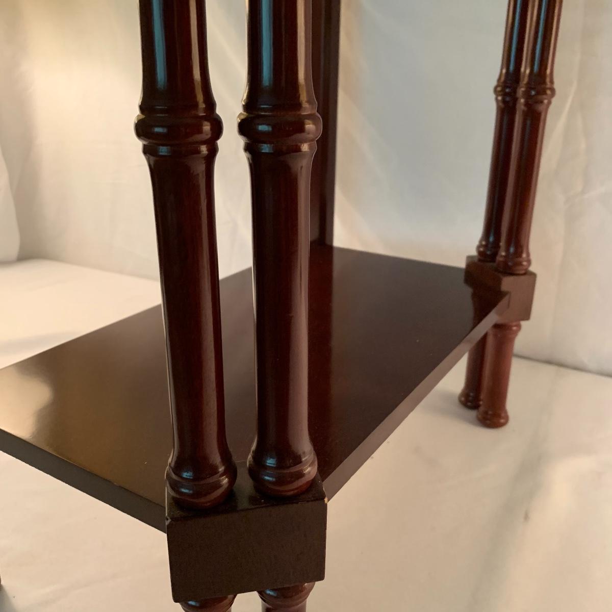 This lot includes one ivory Asian print arm chair and one slim, dark wood side table. The arm chair is from the brand Southwood. The chair is lightly embroidered with Asian scenery and is clean, free of blemishes. The legs and arms of the chair are made with a sturdy dark wood. The chair measures about 22in x 24in x 43in. The Bombay dark wood side table is pretty lightweight. There does not appear to be any major scratches or marks on the table. It measures 11in x 19.5in x 29in. Local pick up only.
