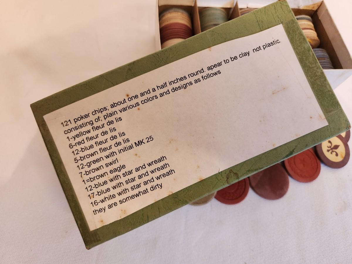 Nice Box of Antique Clay Poker Chips - various designed - Inventory on lid.