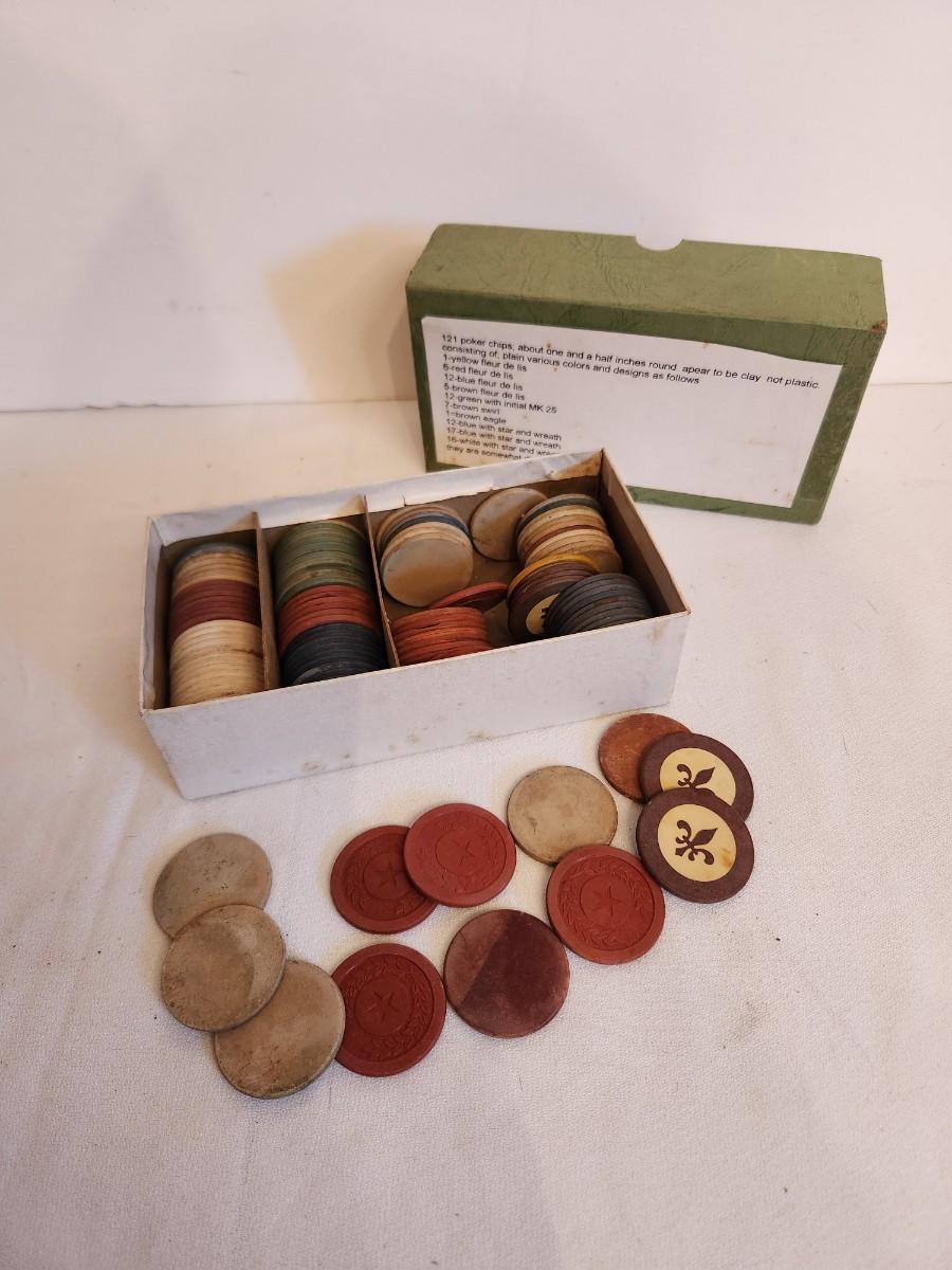 Lot #198 Box of Antique Clay Poker Chips - various designs.