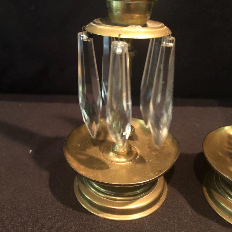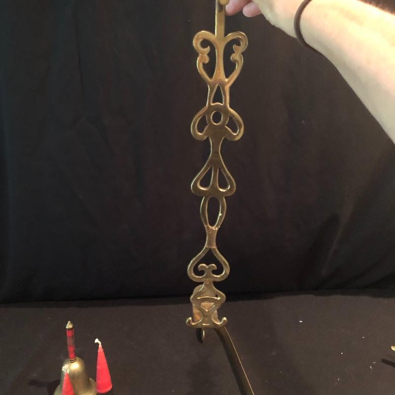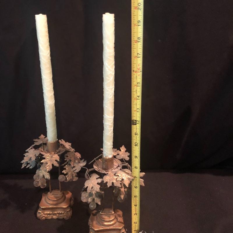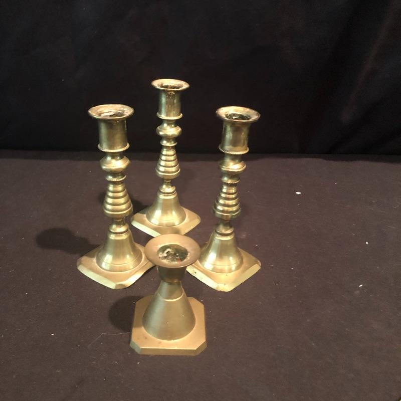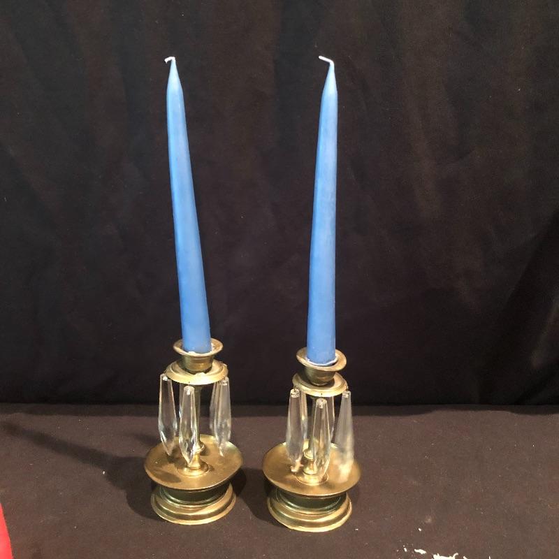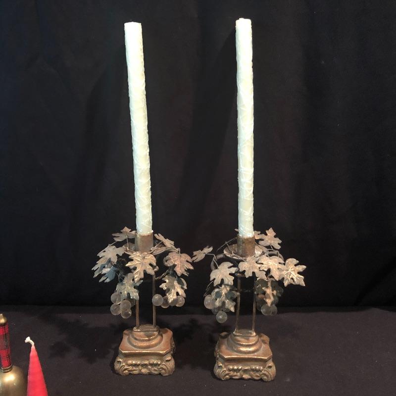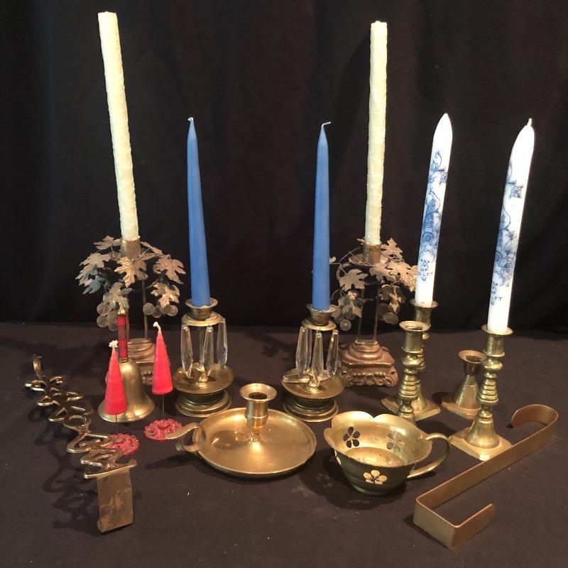 This assortment of brass includes approximately 10 candlestick holders, some tapered candles and more. The tallest candle holders have brass colored metal leaves that adorn the brass base. Also included is a pair of brass candlestick holders with glass teardrop hanging accents, a brass bell with tartan handle, a pair of red Xmas tree shaped candles on wooden base and more.
