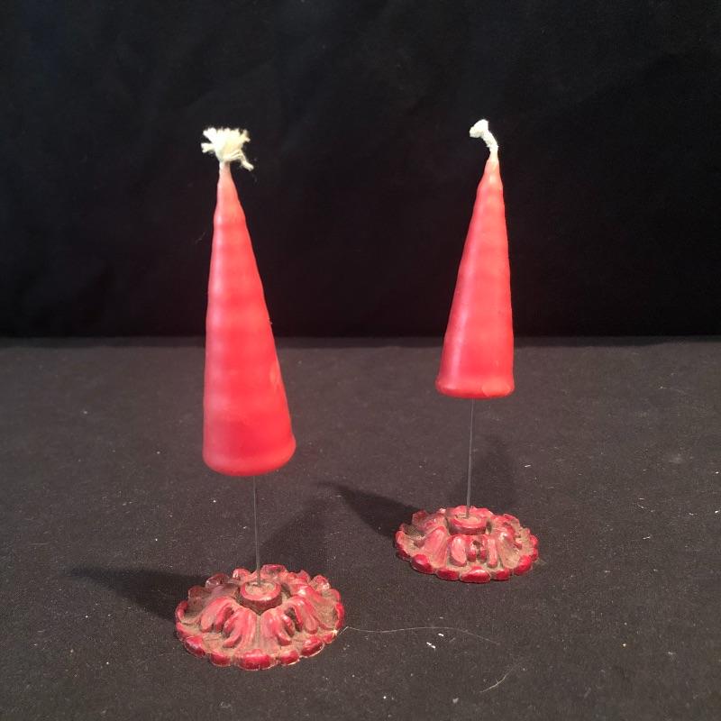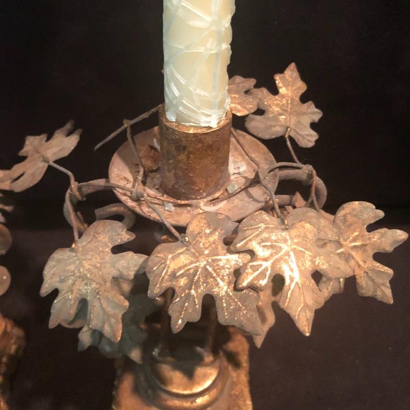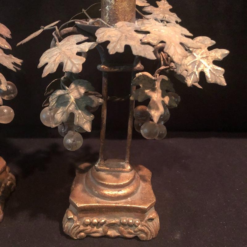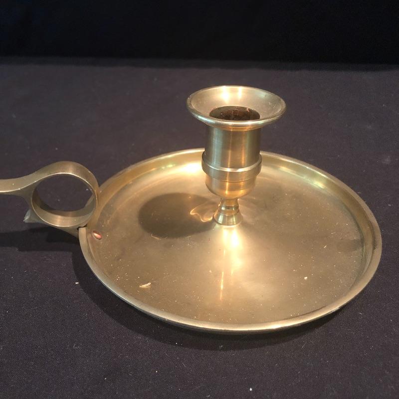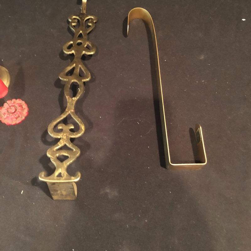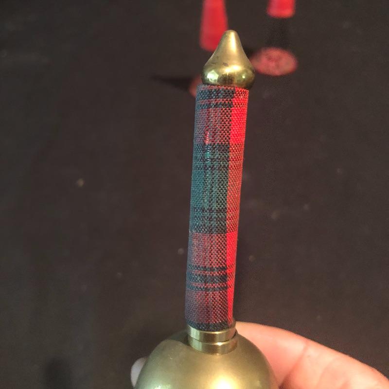 This assortment of brass includes approximately 10 candlestick holders, some tapered candles and more. The tallest candle holders have brass colored metal leaves that adorn the brass base. Also included is a pair of brass candlestick holders with glass teardrop hanging accents, a brass bell with tartan handle, a pair of red Xmas tree shaped candles on wooden base and more.