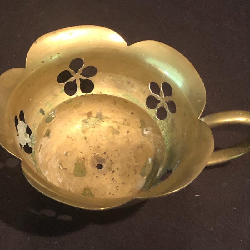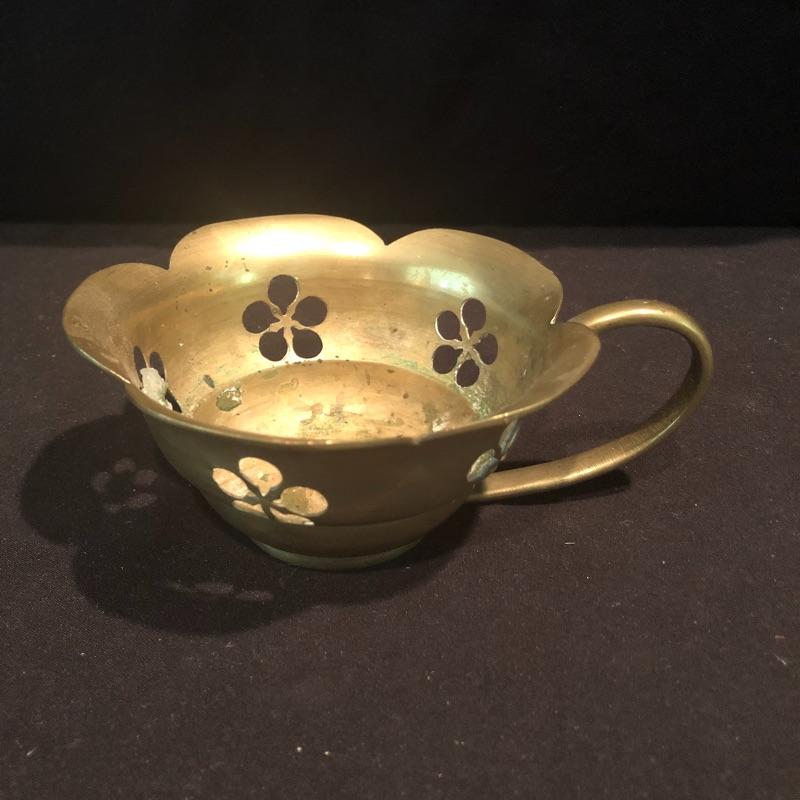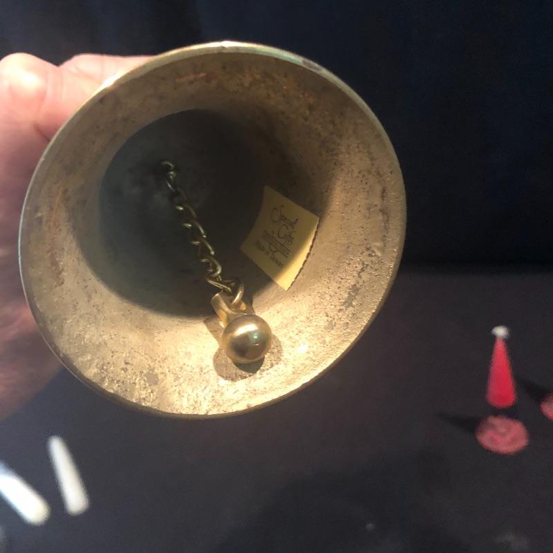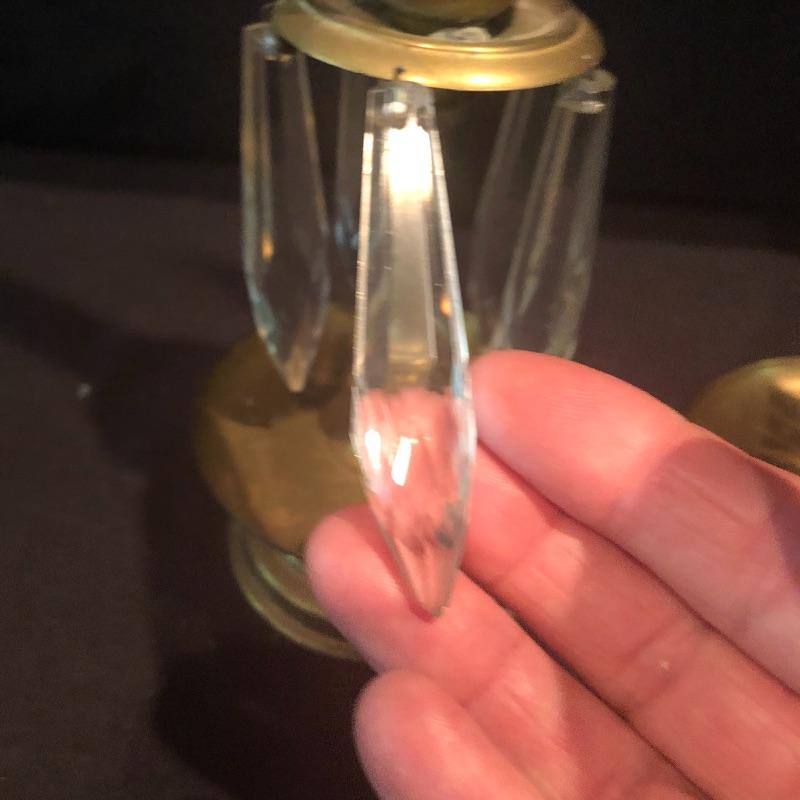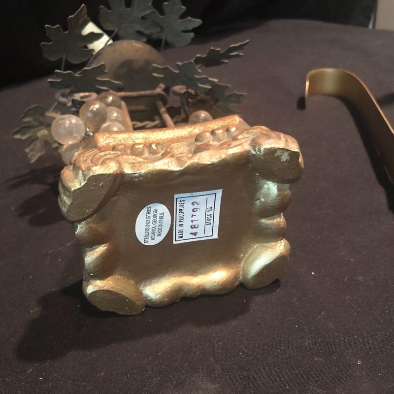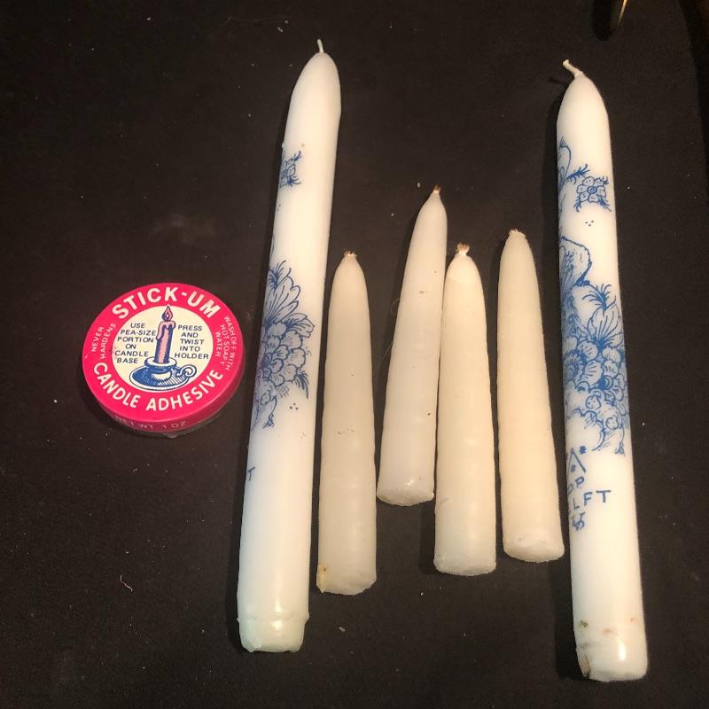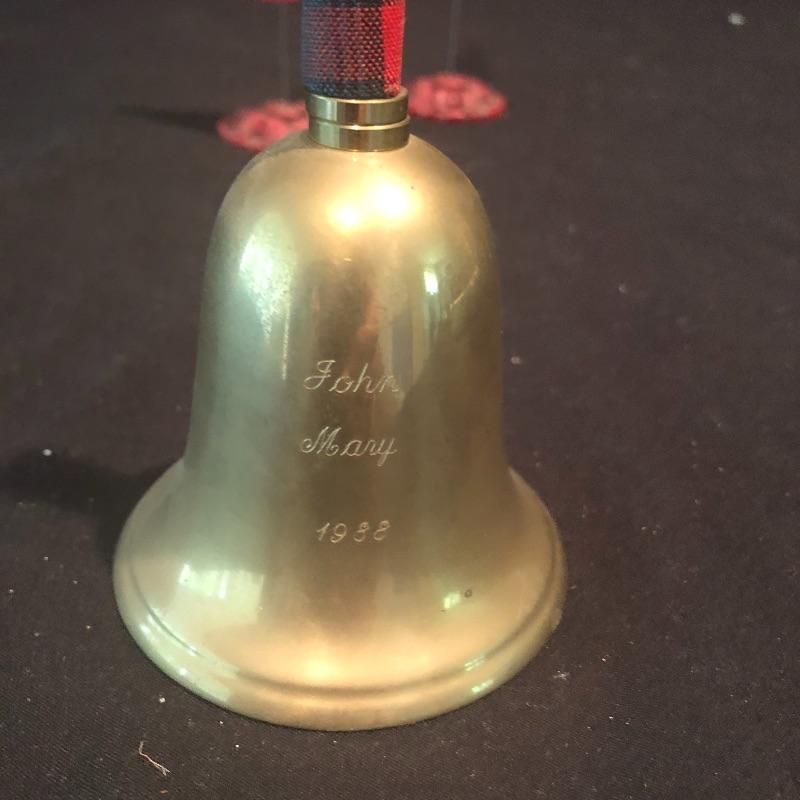 This assortment of brass includes approximately 10 candlestick holders, some tapered candles and more. The tallest candle holders have brass colored metal leaves that adorn the brass base. Also included is a pair of brass candlestick holders with glass teardrop hanging accents, a brass bell with tartan handle, a pair of red Xmas tree shaped candles on wooden base and more.