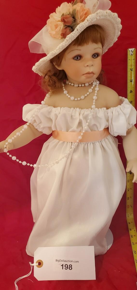 Doll Named "Charlette" By Kaye Wigs with Floral Hat and White Dress with Necklace