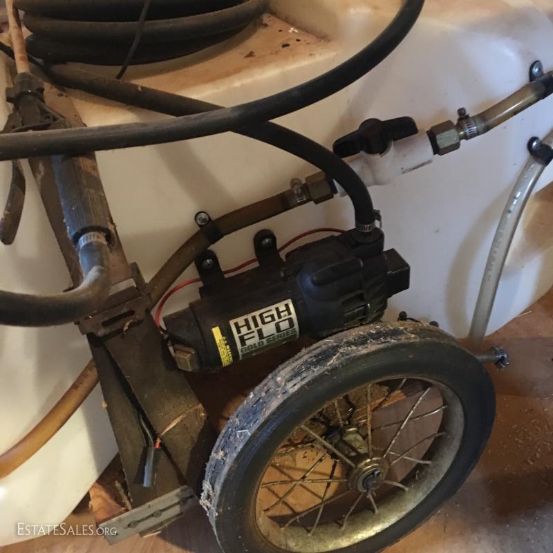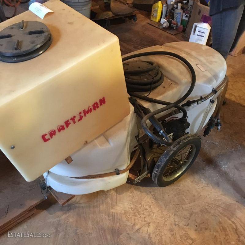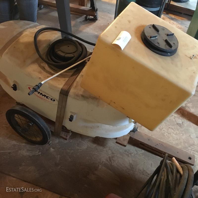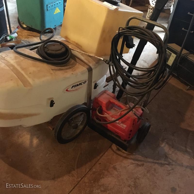 Fimco Industries Sprayer (high F?E Gold Series) with Craftsman Tank, measures 38”lx22”wx23”h (hitch adds 17”). Clean Machine 1200 Coleman Powermate pressure washer.