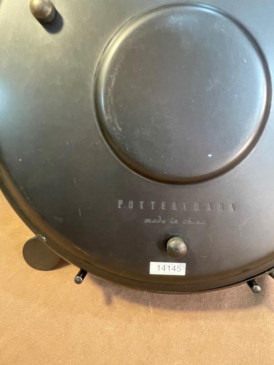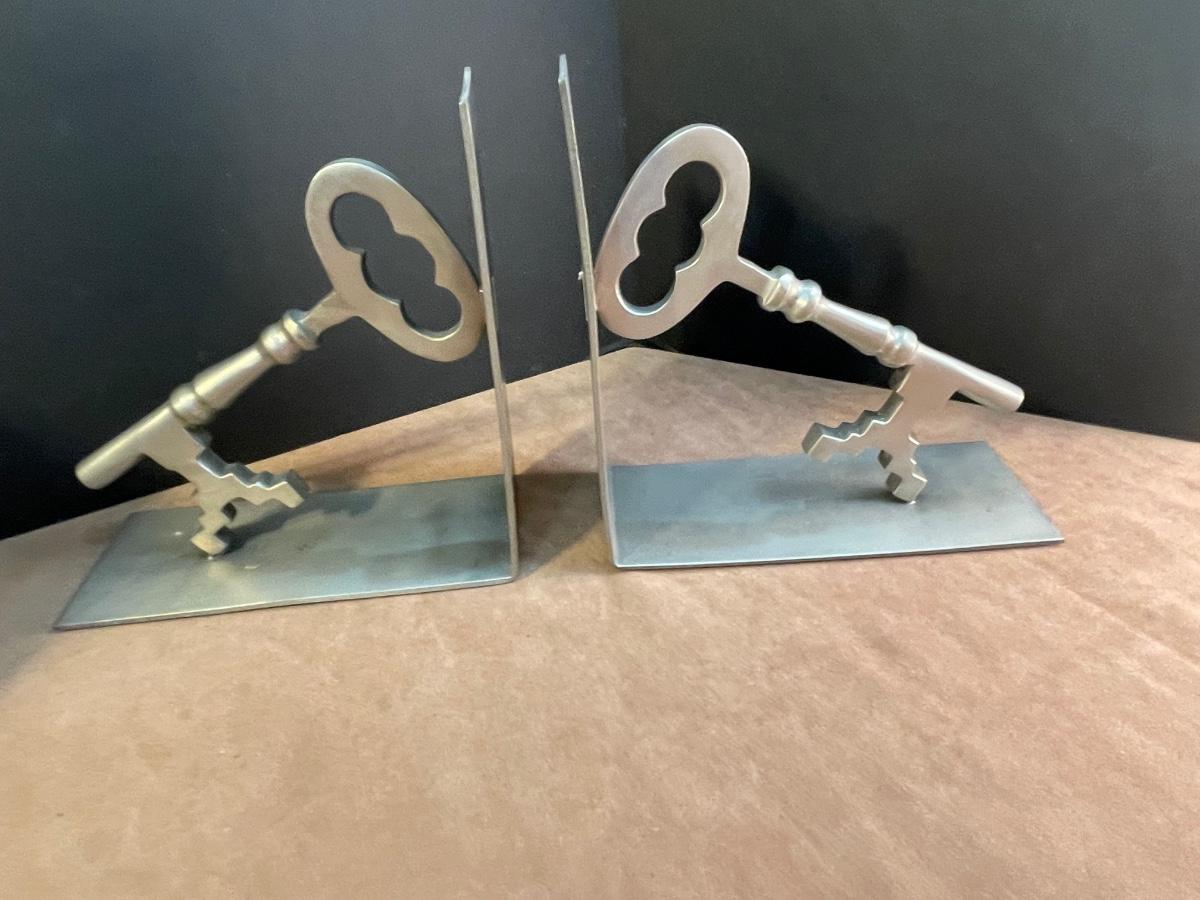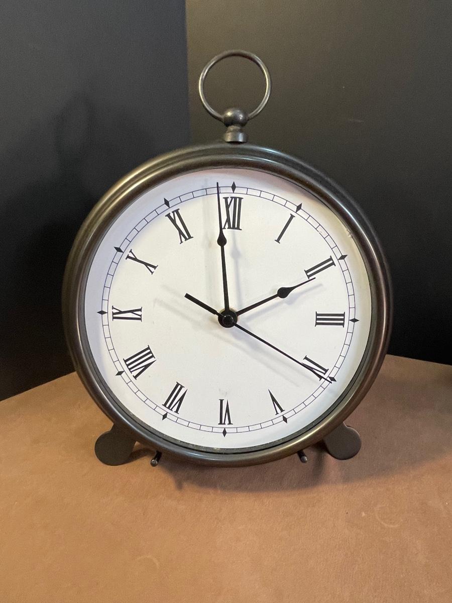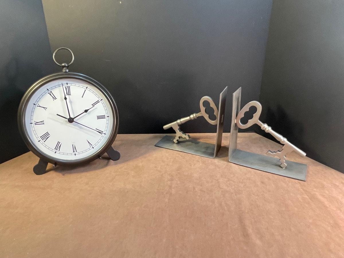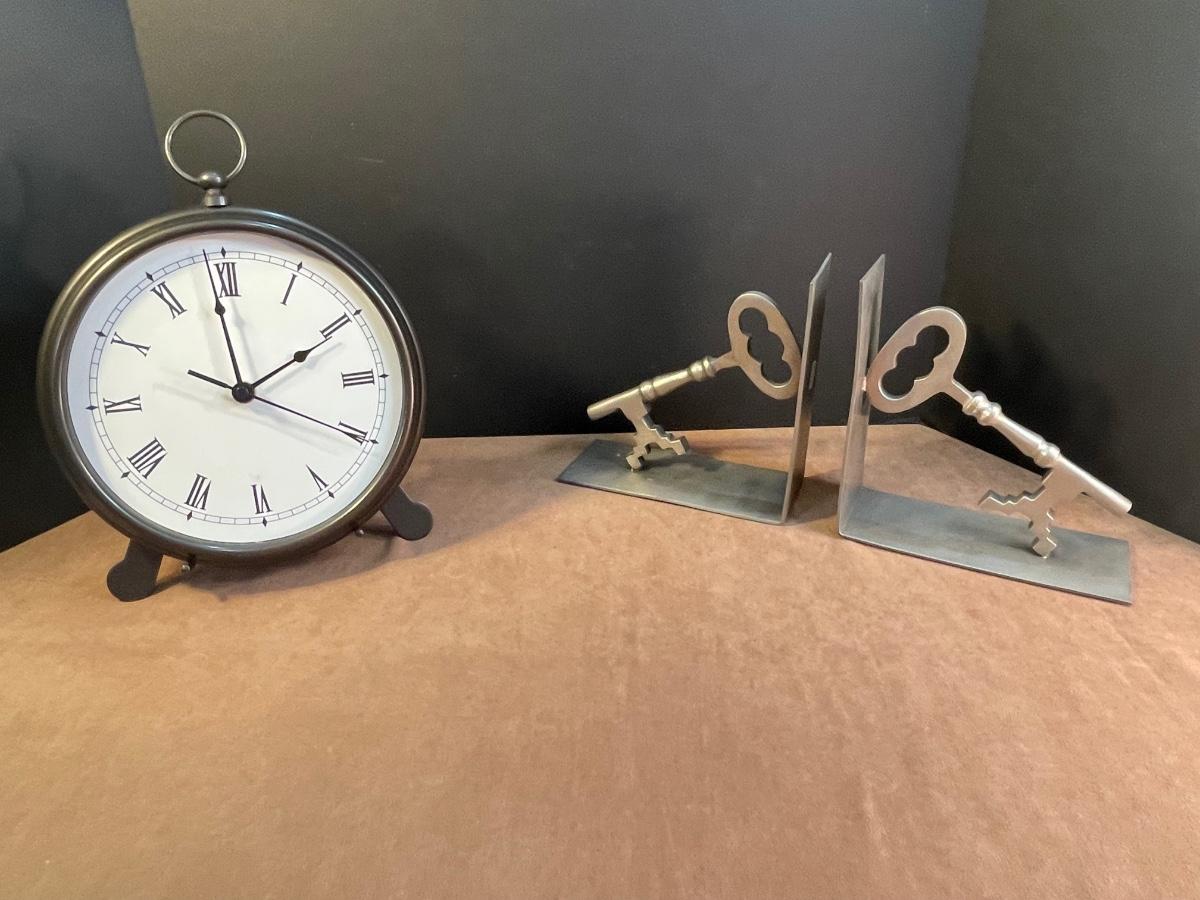 Pottery Barn clock on a stand (glass is missing) and pair of brushed nickel bookends