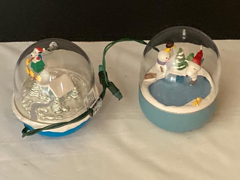 Two Peanuts Snoopy ornaments. Both ornaments connect to string of lights for light and sound feature