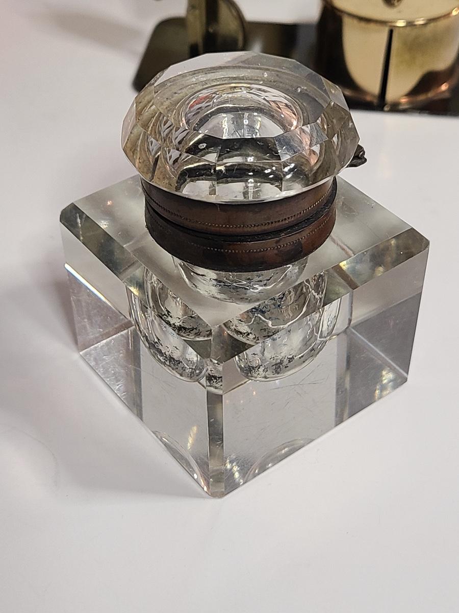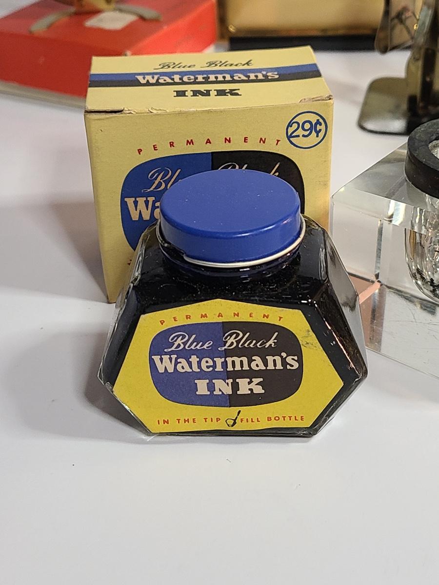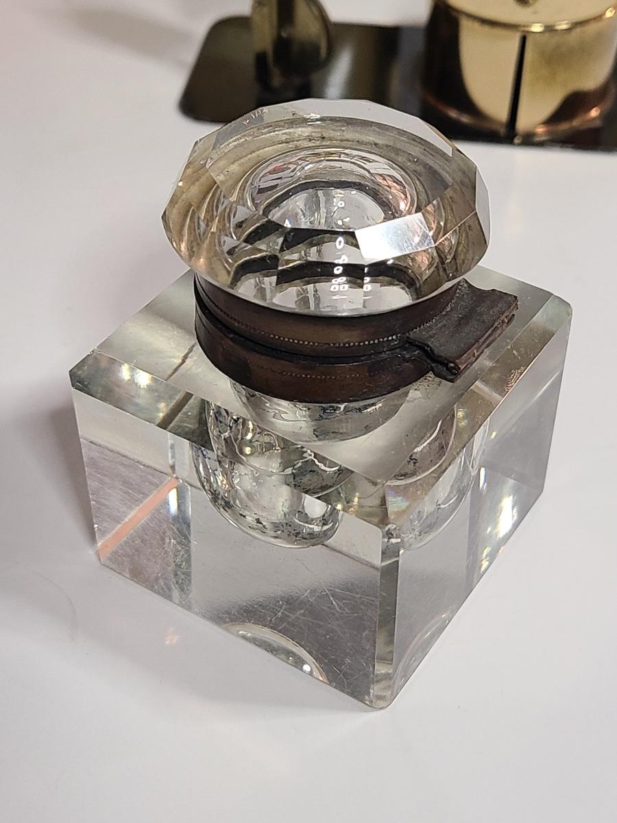 These pieces are gorgeous. The small alarm clock is new in the box, and the electric clock looks new, has sleek design and works! The inkwell shows wear to the metal and the interior has some staining but no noticeable wear to the crystal well. Also included is vintage postal scale/stamp dispenser, and new old stock Waterman's Ink. The pictures show condition, measurements if taken, and what is included in the lot. Due to the large amount that we photograph and the time frame, we are not always able to take measurements. All items unless noted, are pre-owned and have been used. If you purchased furniture, you must bring help. We do not allow one person to carry large furniture out on their own. Bring help, tools and a truck for the safety of our client’s homes, and your personal safety. Company policy. Thank you.