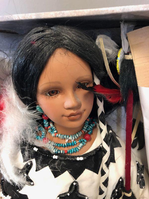 Lot# 198  Native American Porcelain Doll With Spear in White Tradition Dress