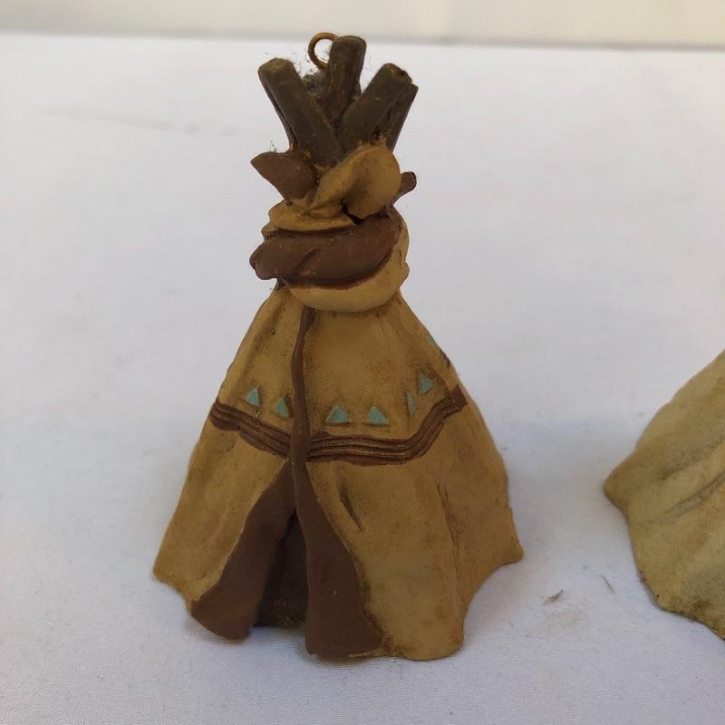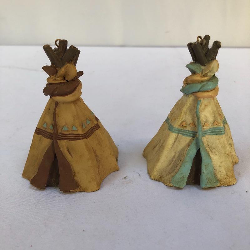 This pair of small teepees appear to be made of resin or a very light ceramic.. Both have hooks for hanging.