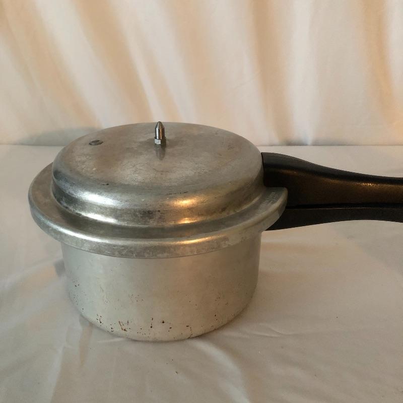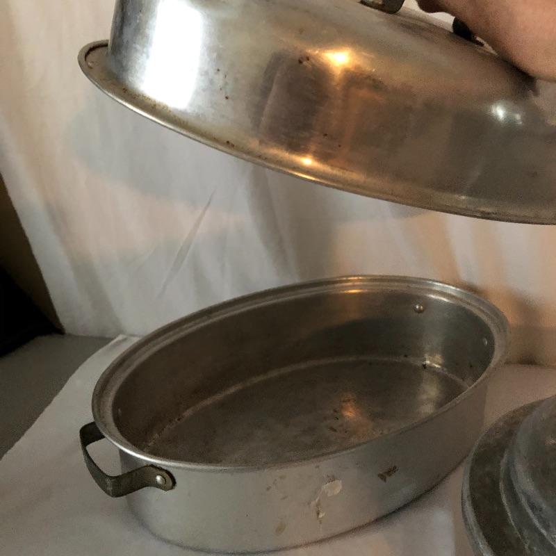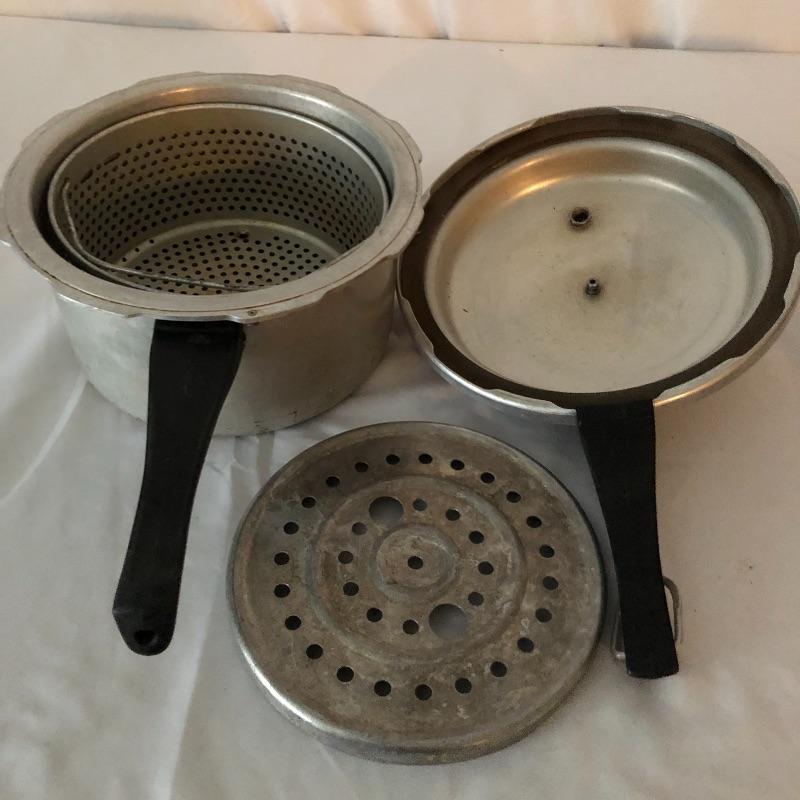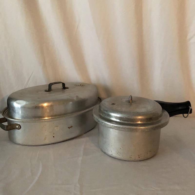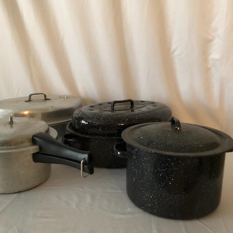 The pressure cooker is an aluminum that measures 9” diameter x 5” tall. Also included are 2 roasting pans, one has a matching speckled large pot and more.