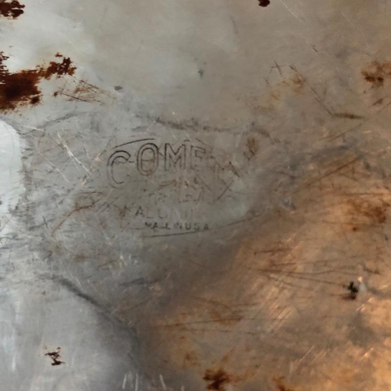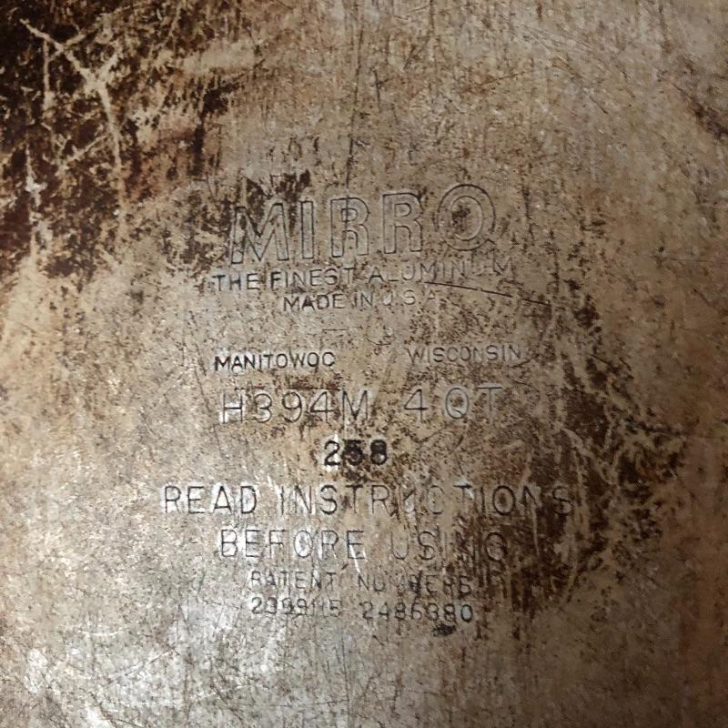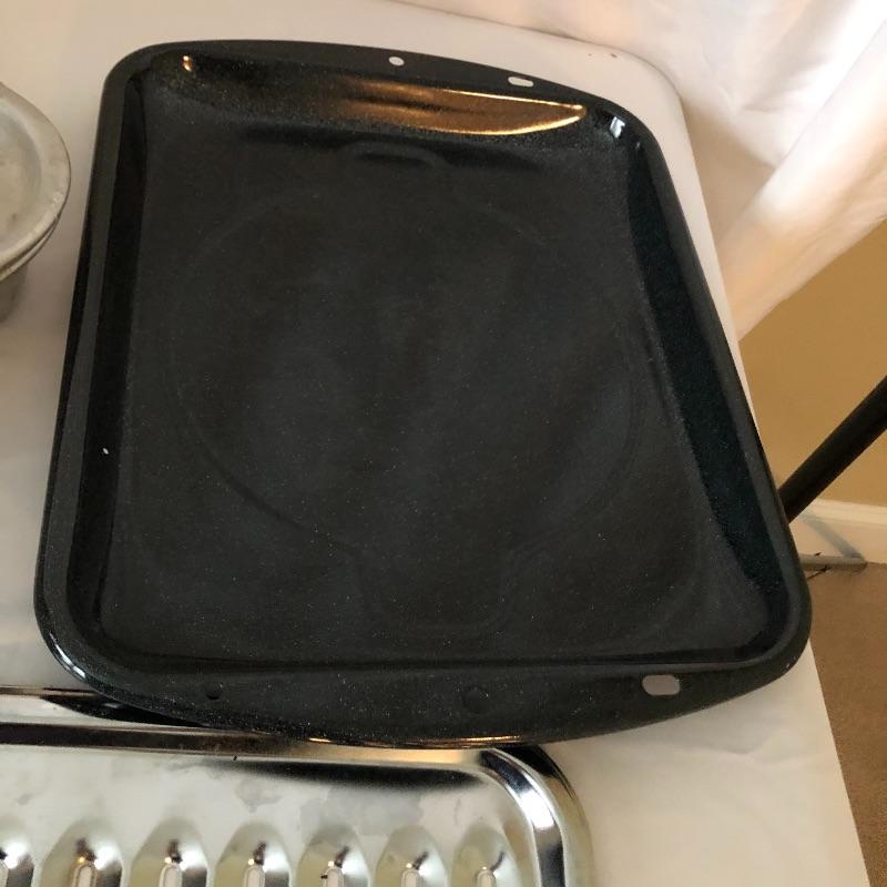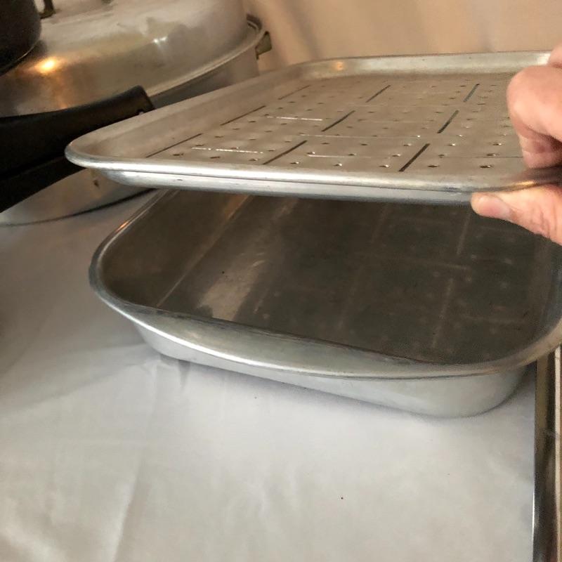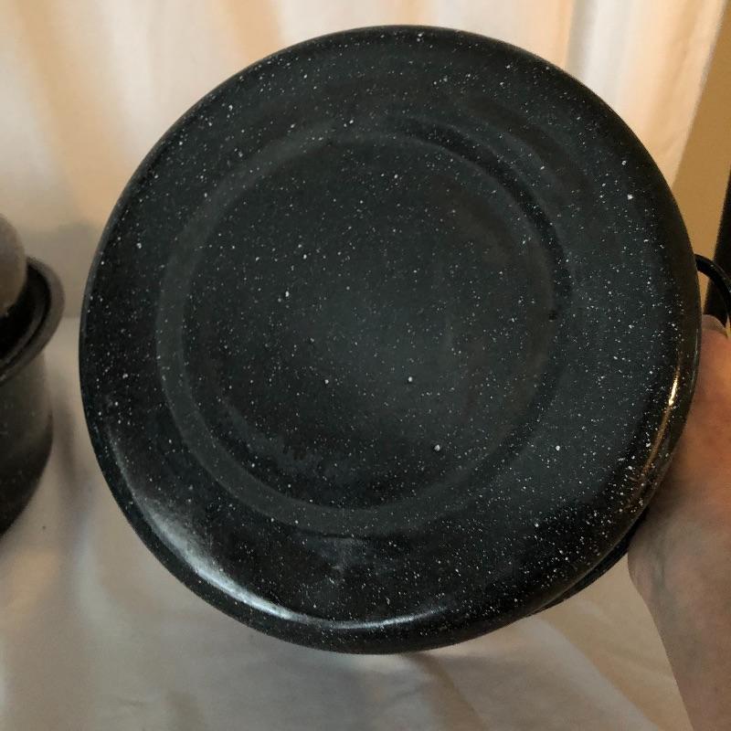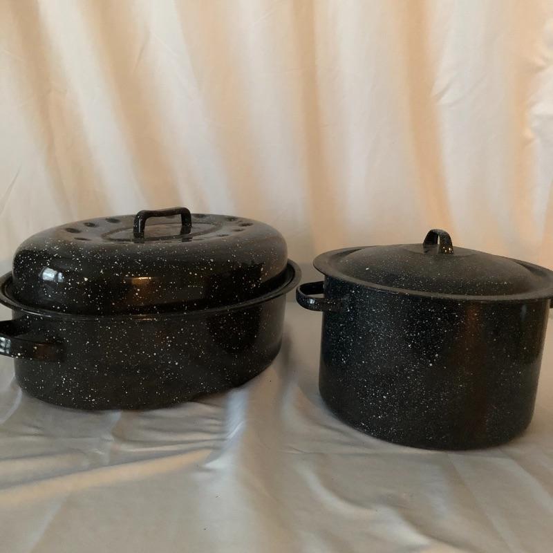 The pressure cooker is an aluminum that measures 9” diameter x 5” tall. Also included are 2 roasting pans, one has a matching speckled large pot and more.