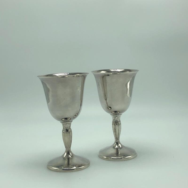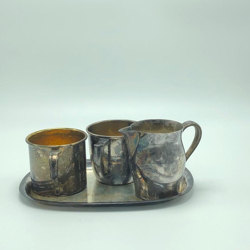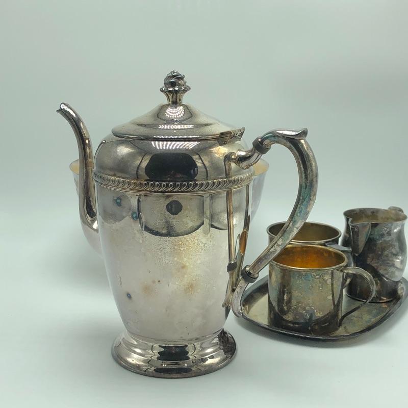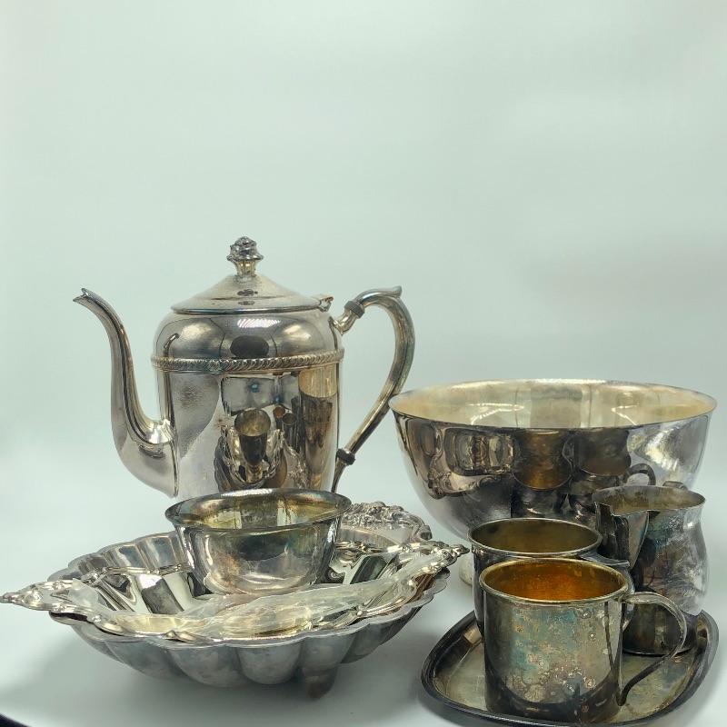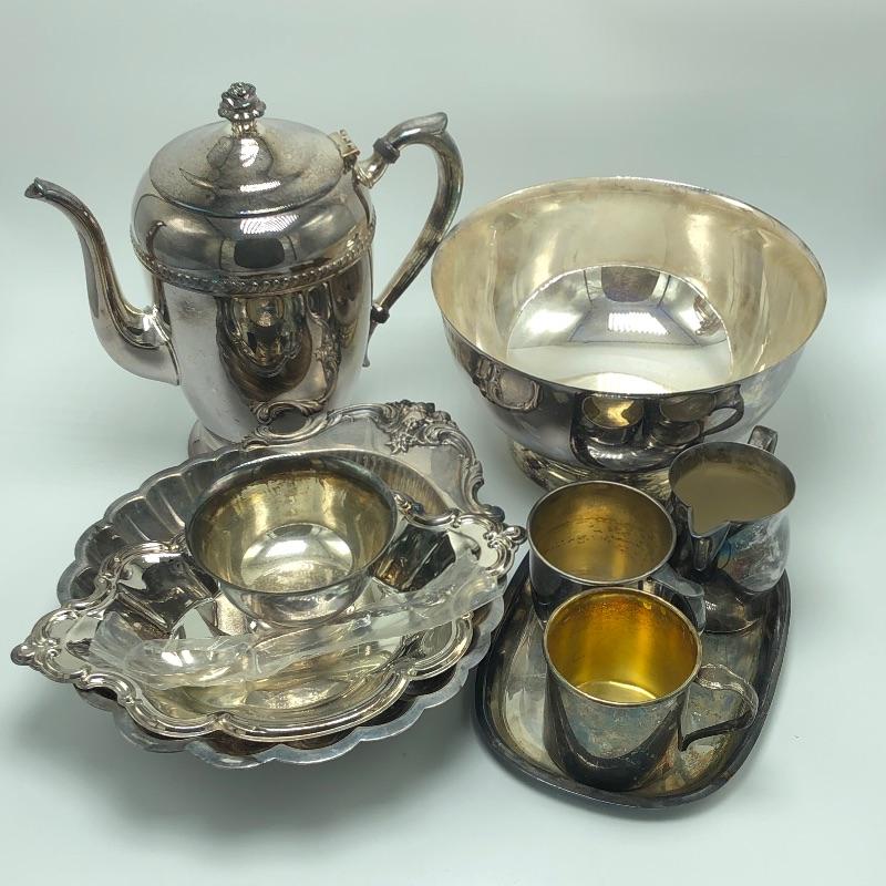 Nice collection of silver plated serving ware including a set of wine goblets and vintage tea pot.