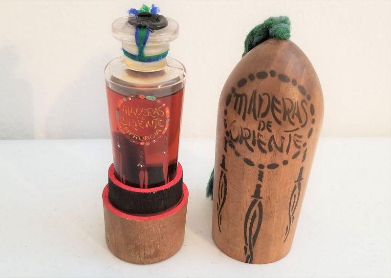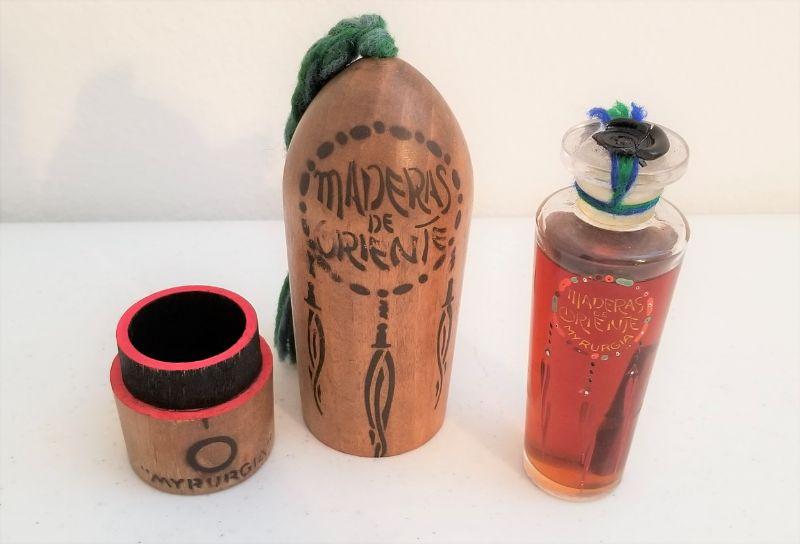 SUPER RARE unopened bottle of Maderas de Oriente by Myrurgia - launched in 1918 - this packaging is from the 1920's. Wood casing with braided tail - stand 6" tall - inside bottle is 4" tall and originally contained 4 ounces of perfume. There has been a bit of evaporation, but most of it is still there. Their marketing said that there was a "stick of rare wood" inside each bottle - has an "oriental" smell to it, with a whiff of violet. Perfume collectors - this is a scarce in any condition - I only found two bottles offered for sale online.