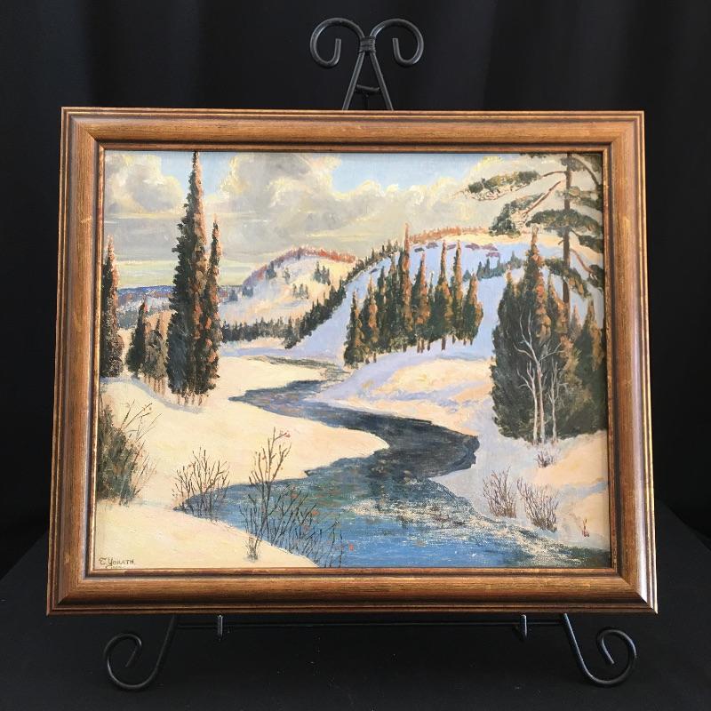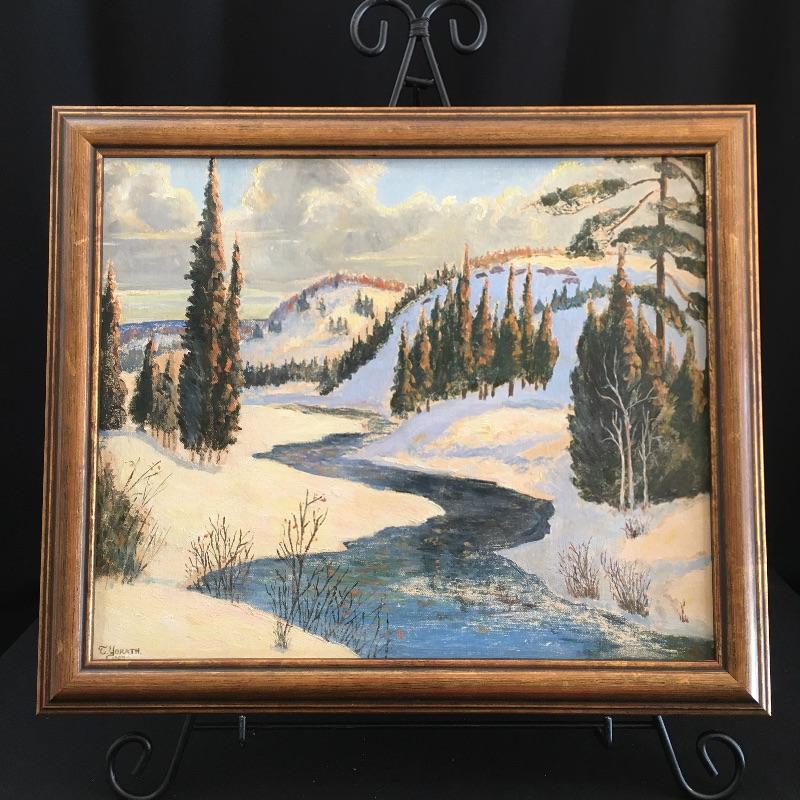 T. Yorath framed and signed painting. A lovely landscape showing a river with the mountains in the background. Frame measures 18.75” x 22”.