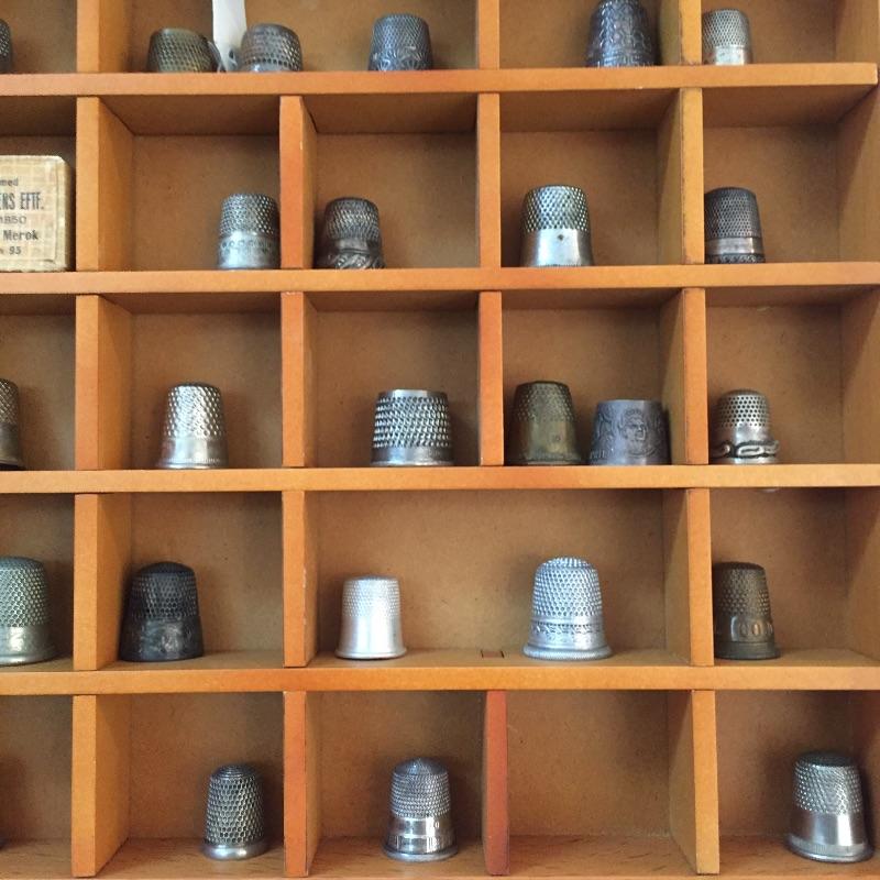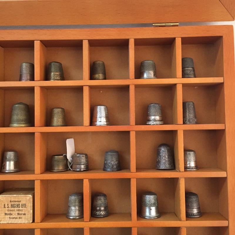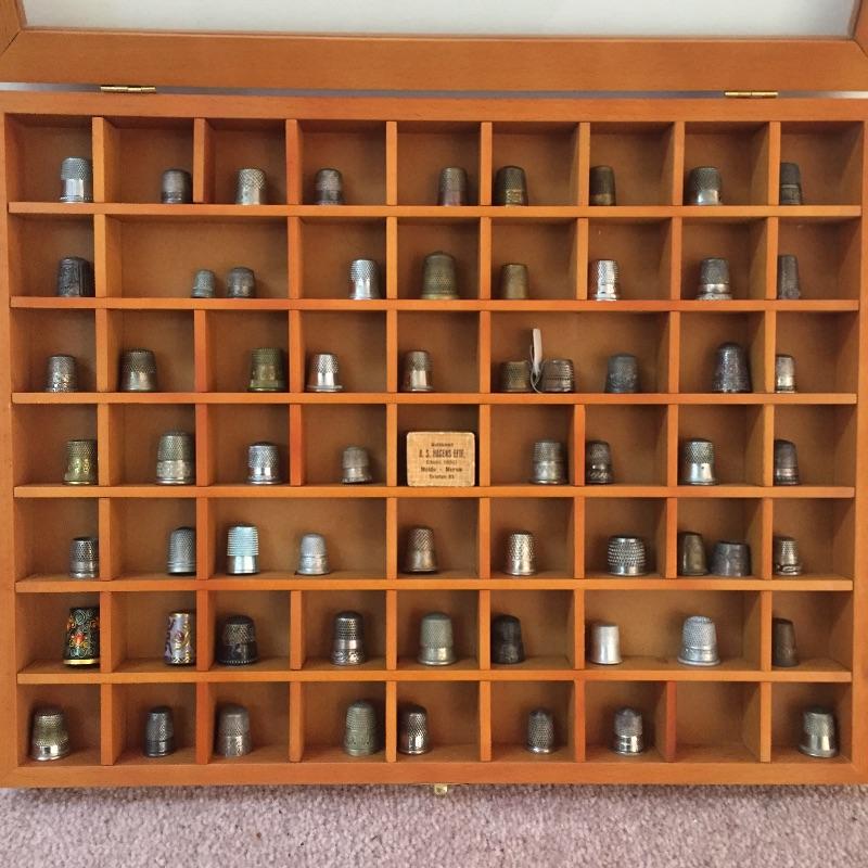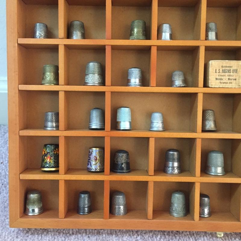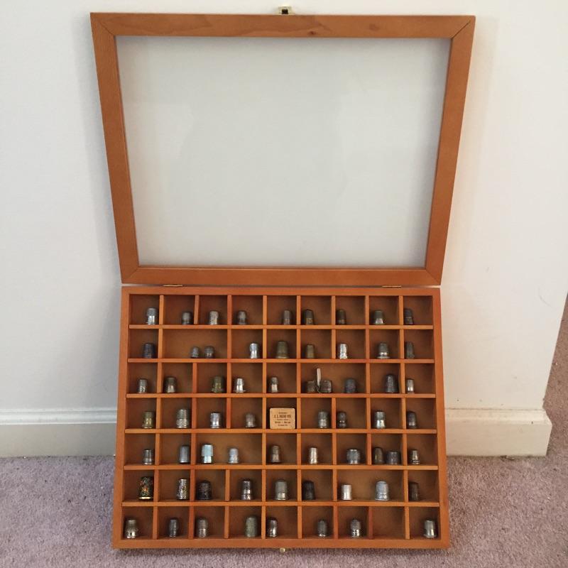 Thimble collection in wooden display box. 64 Thimbles of various metals.
