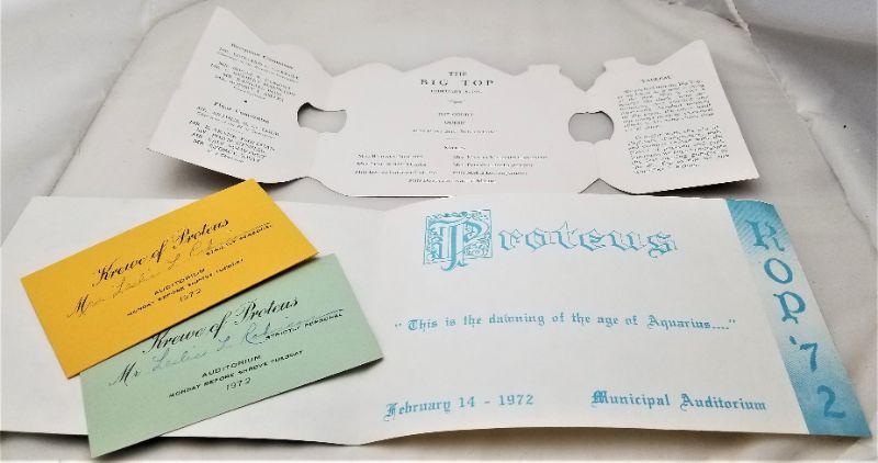 Two vintage Mardi Gras invitations here - we have the 1957 Nereus invitation and the 1972 "Age of Aquarius" invitation from Proteus - along with the original two Admit cards for the Proteus invitation. Both in good condition. Nereus invite is 6.25" x 5.5" - Proteus invite is 8" x 5.5".