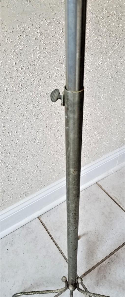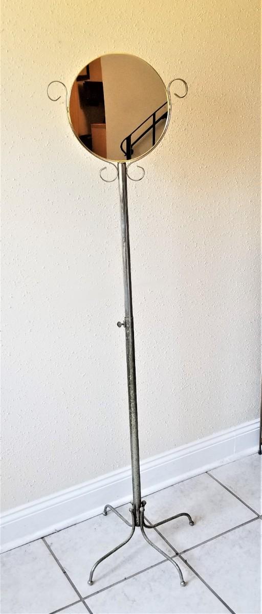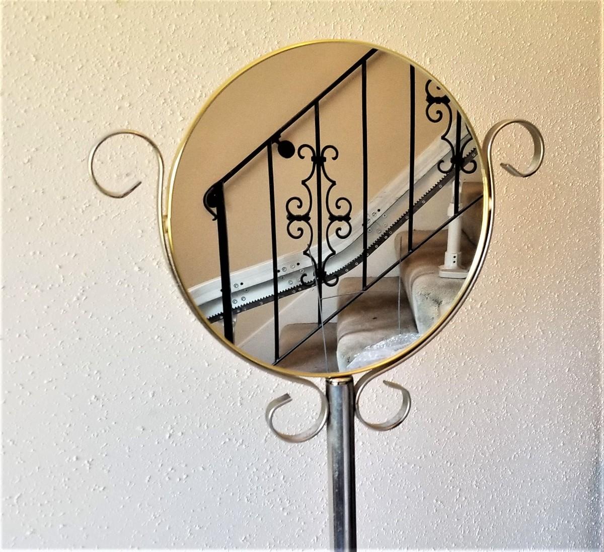 Unusual vintage Stand up Makeup Mirror - adjustable. 1 side is regular view - the other side has magnification. Mirror is 10" wide. 61.25" tall at its tallest - vintage condition.