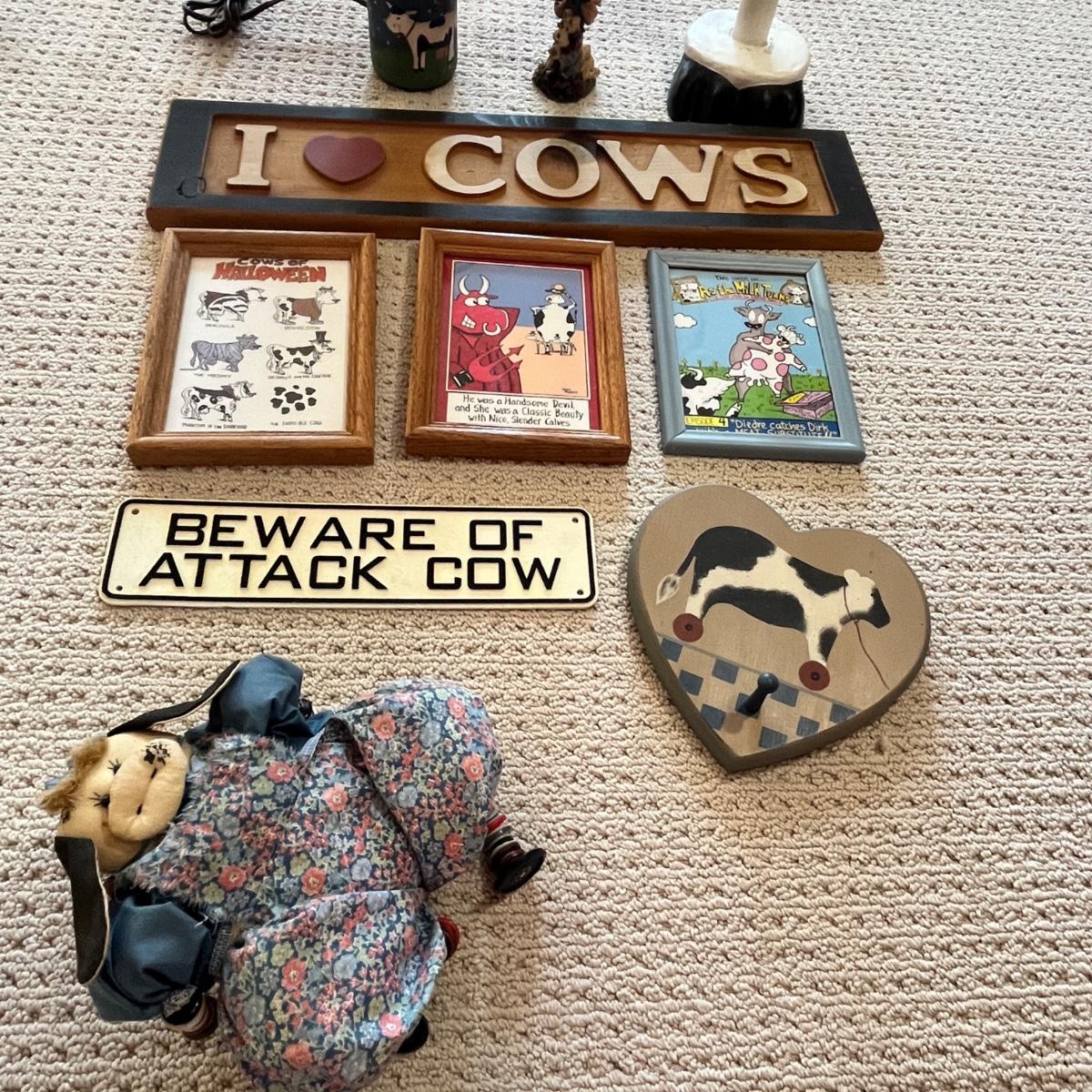Lot 199 Cow décor - paper towel holder, lamp framed prints and more