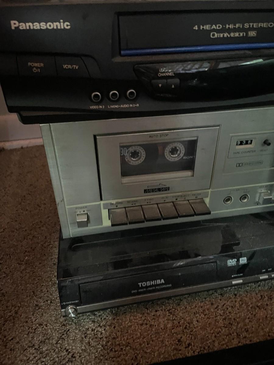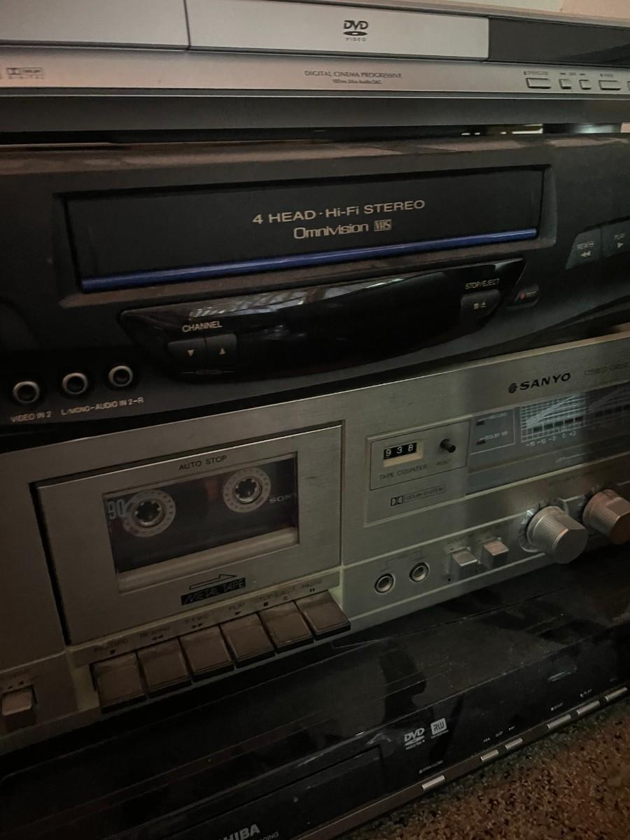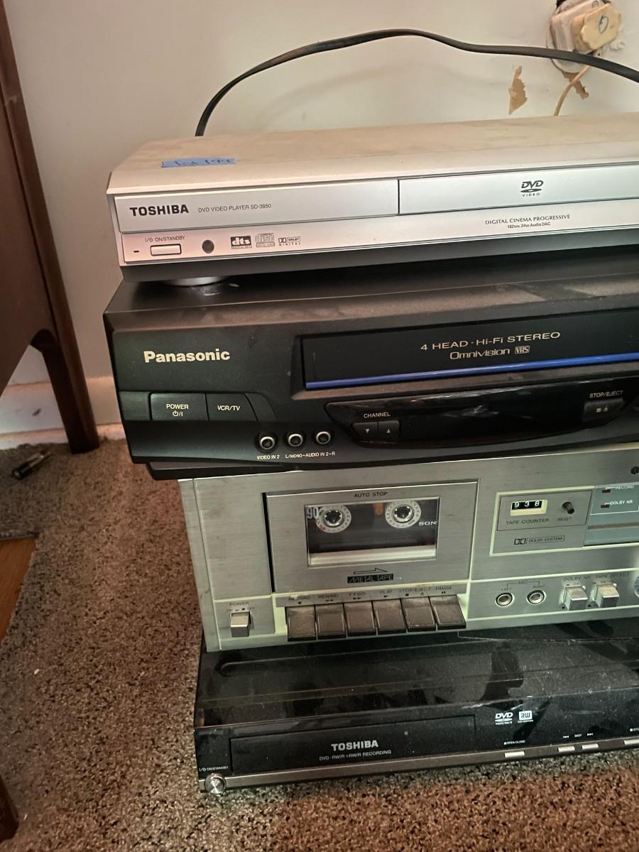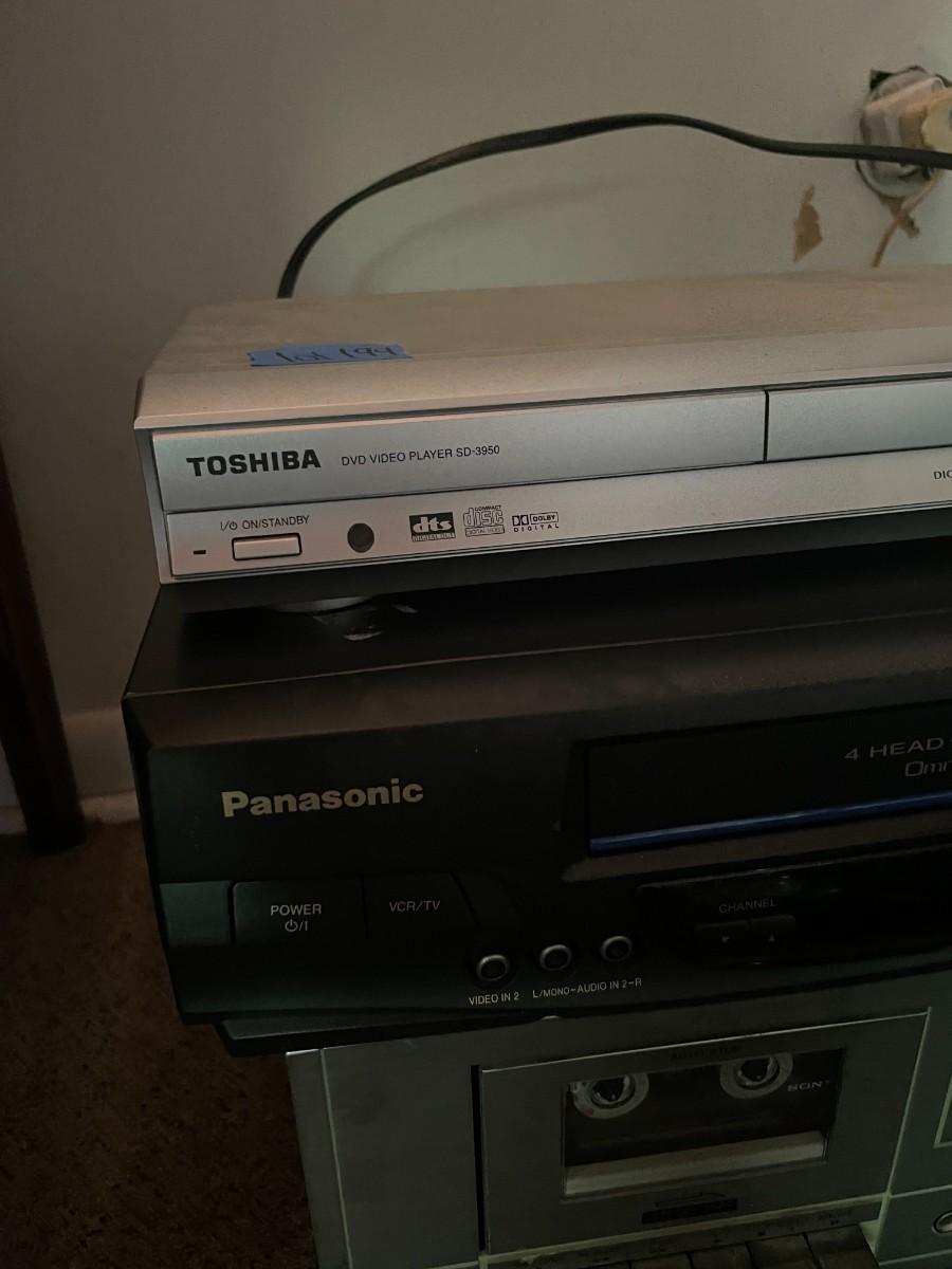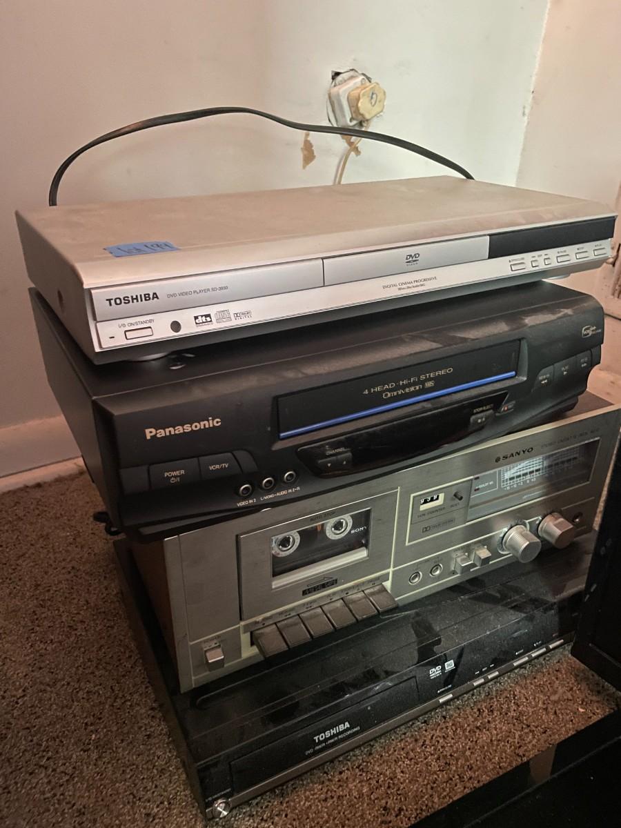 (4) DVD players Toshiba, panasonic, Sanyo, Toshiba.