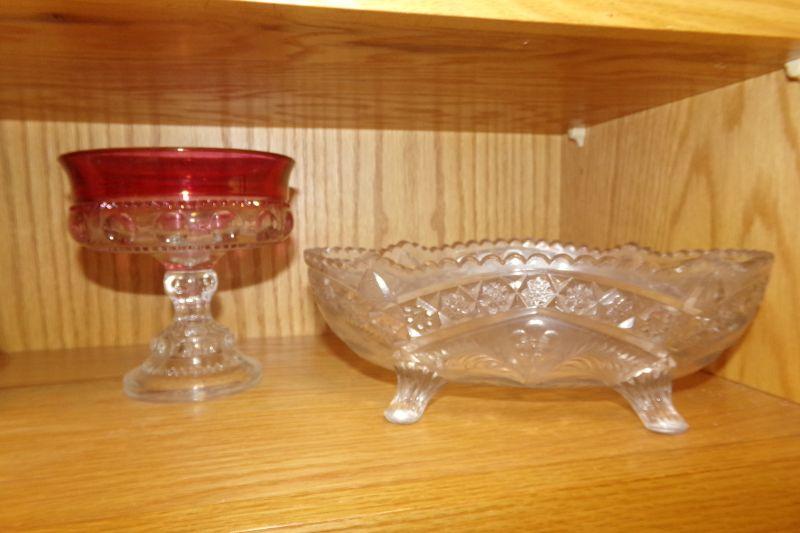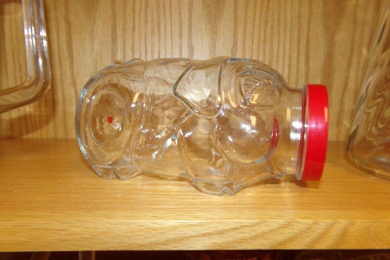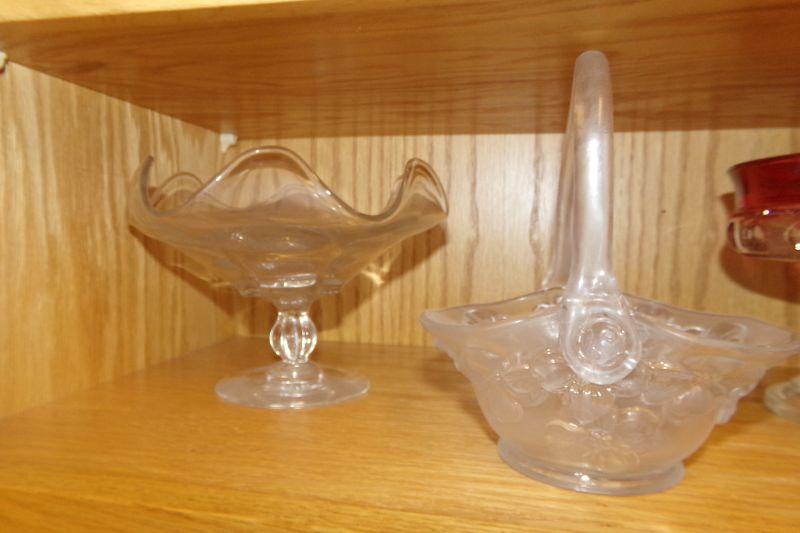 GLASS BASKET WITH HANDLE, FOOTED BOWL, PIG JAR, 2 COMPOTES AND 2 WATER PITCHERS
