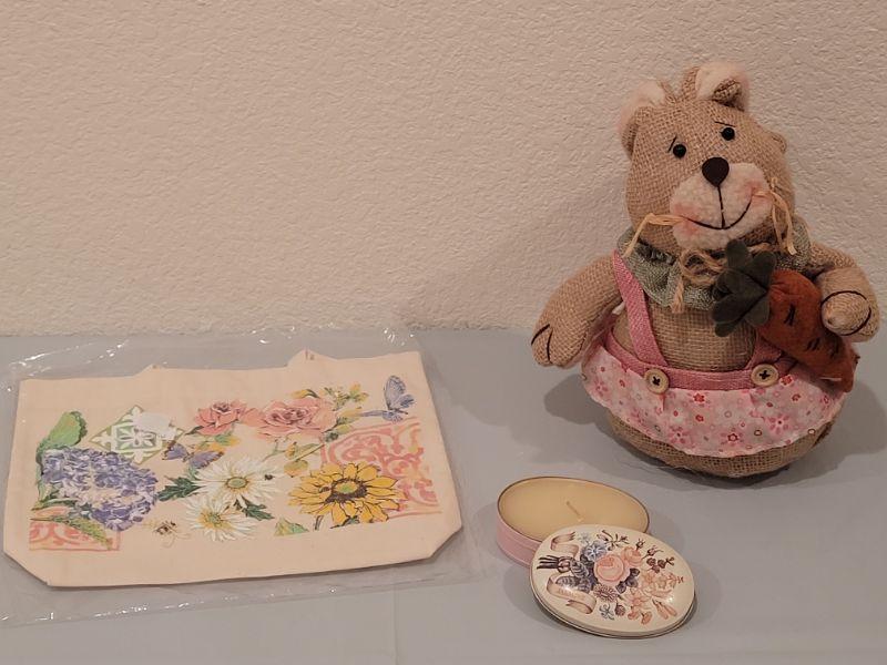 Lot 199: New Burlap Bunny Deco, Floral Bag and Jasmine Candle