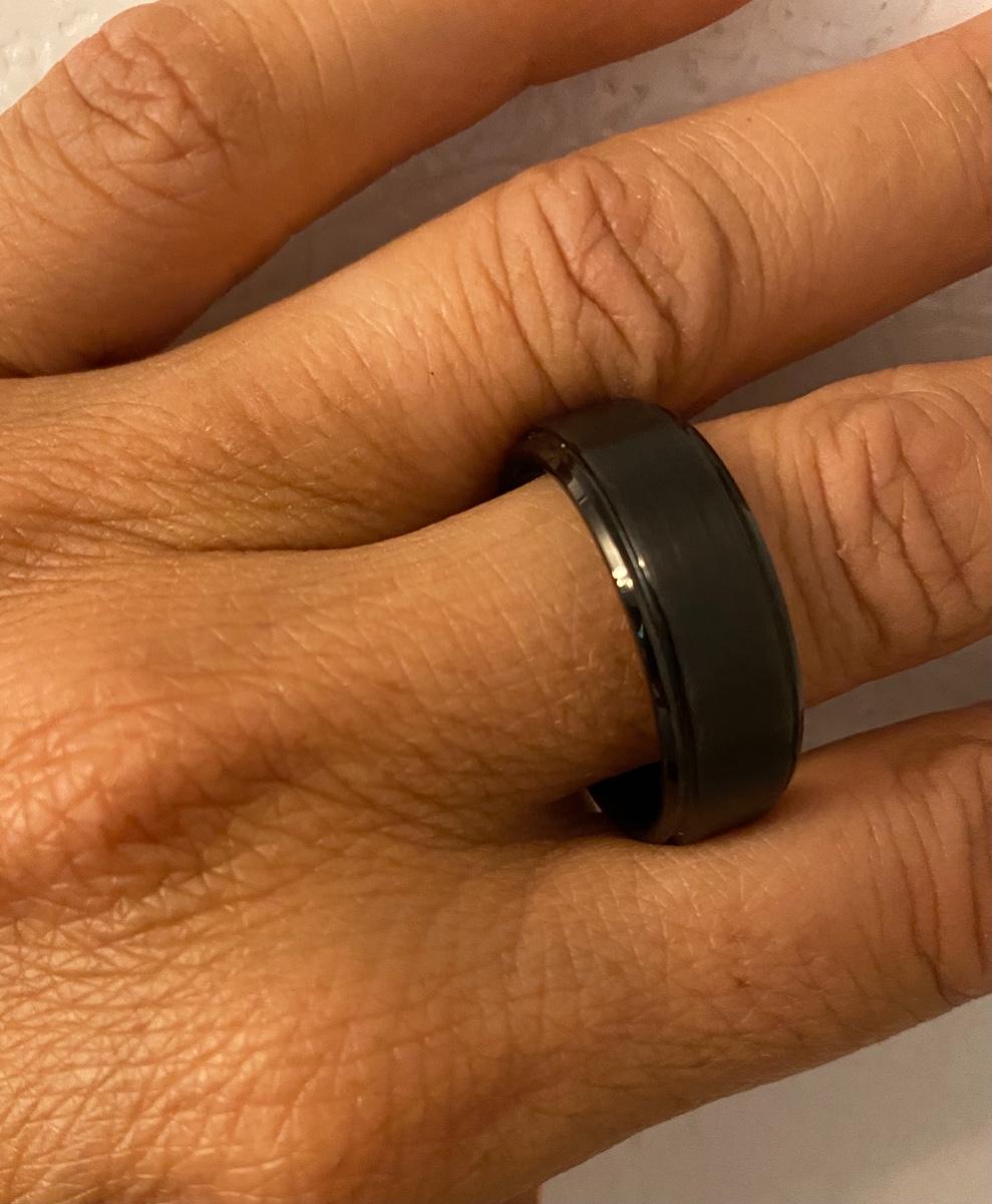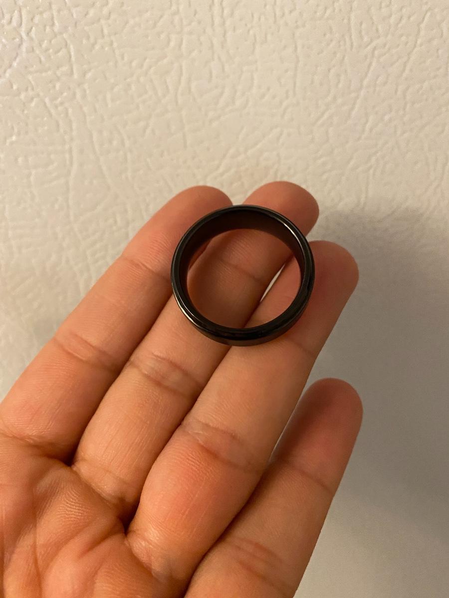 This heavy black metal ring is for the modern man. It is marked Tungsten Carbide inside. can be used as a wedding band or for fashion. Shipping available.