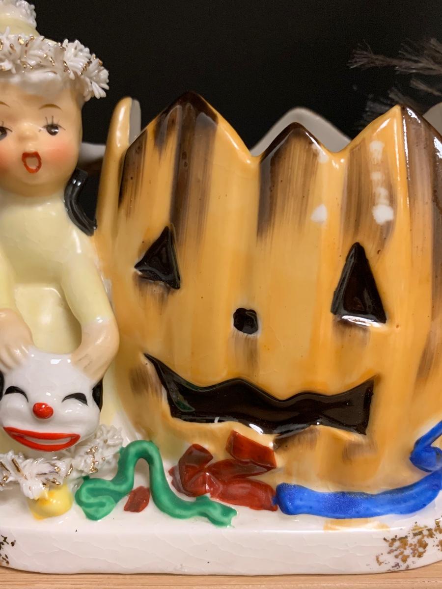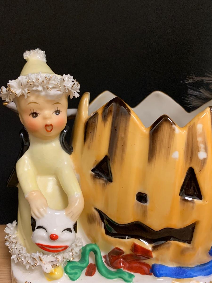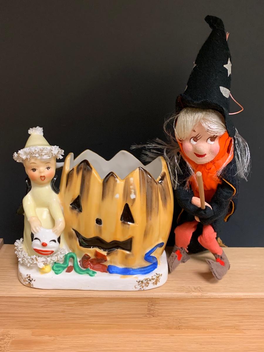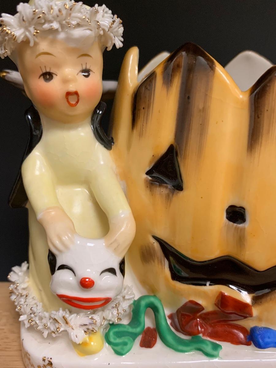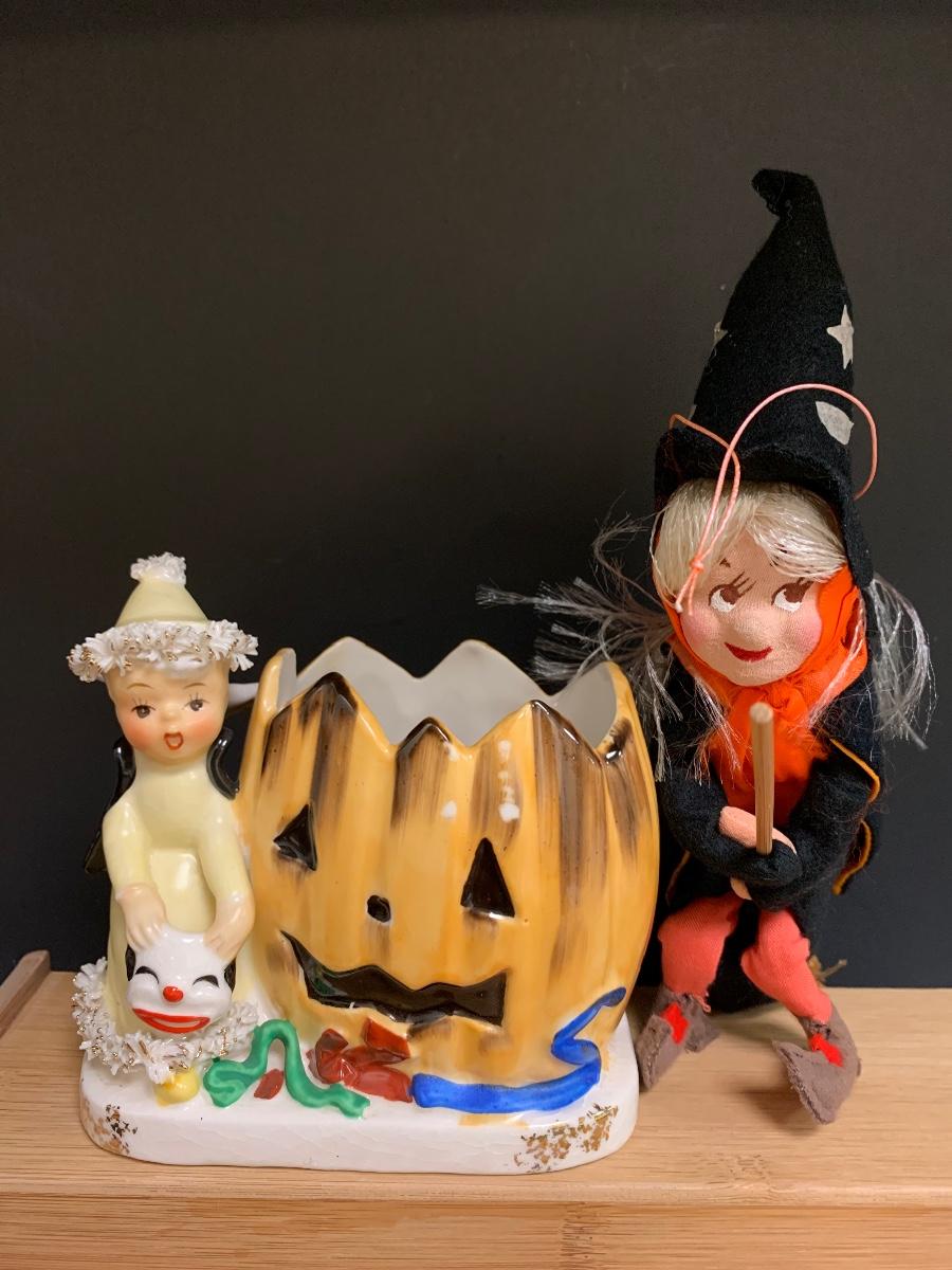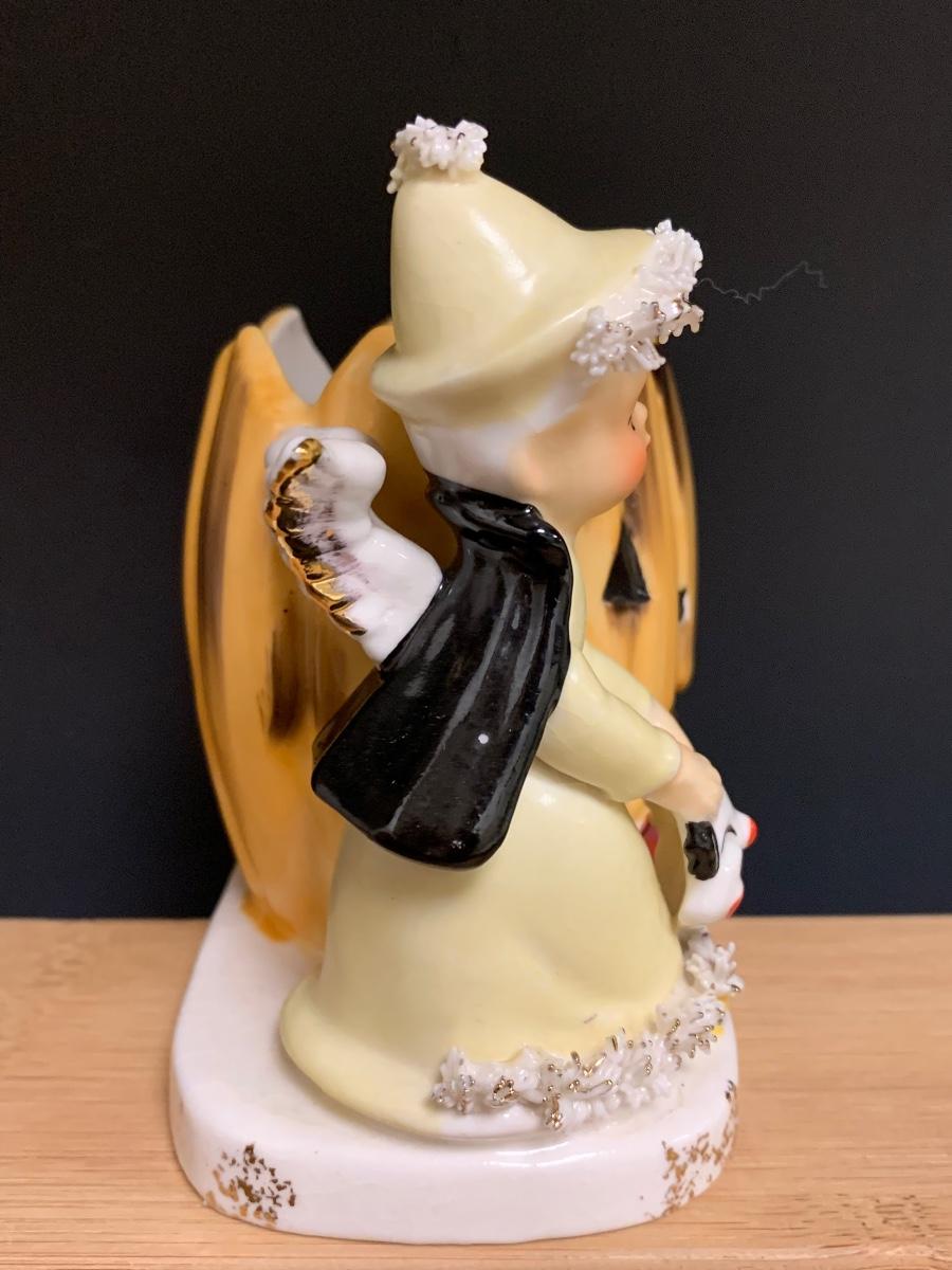 Vintage Napco Halloween Angel w/Spaghetti Trim and Pumpkin Planter along with a flying witch decoration.