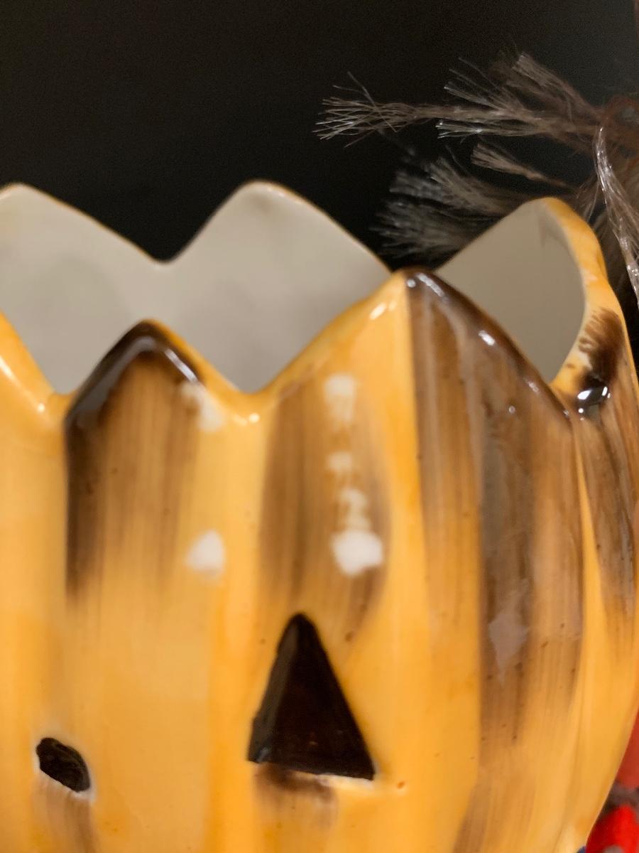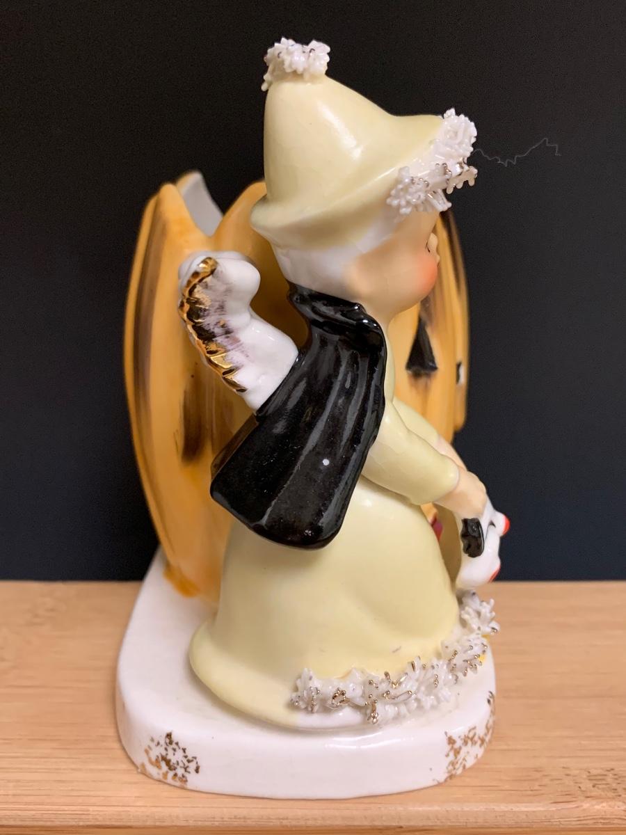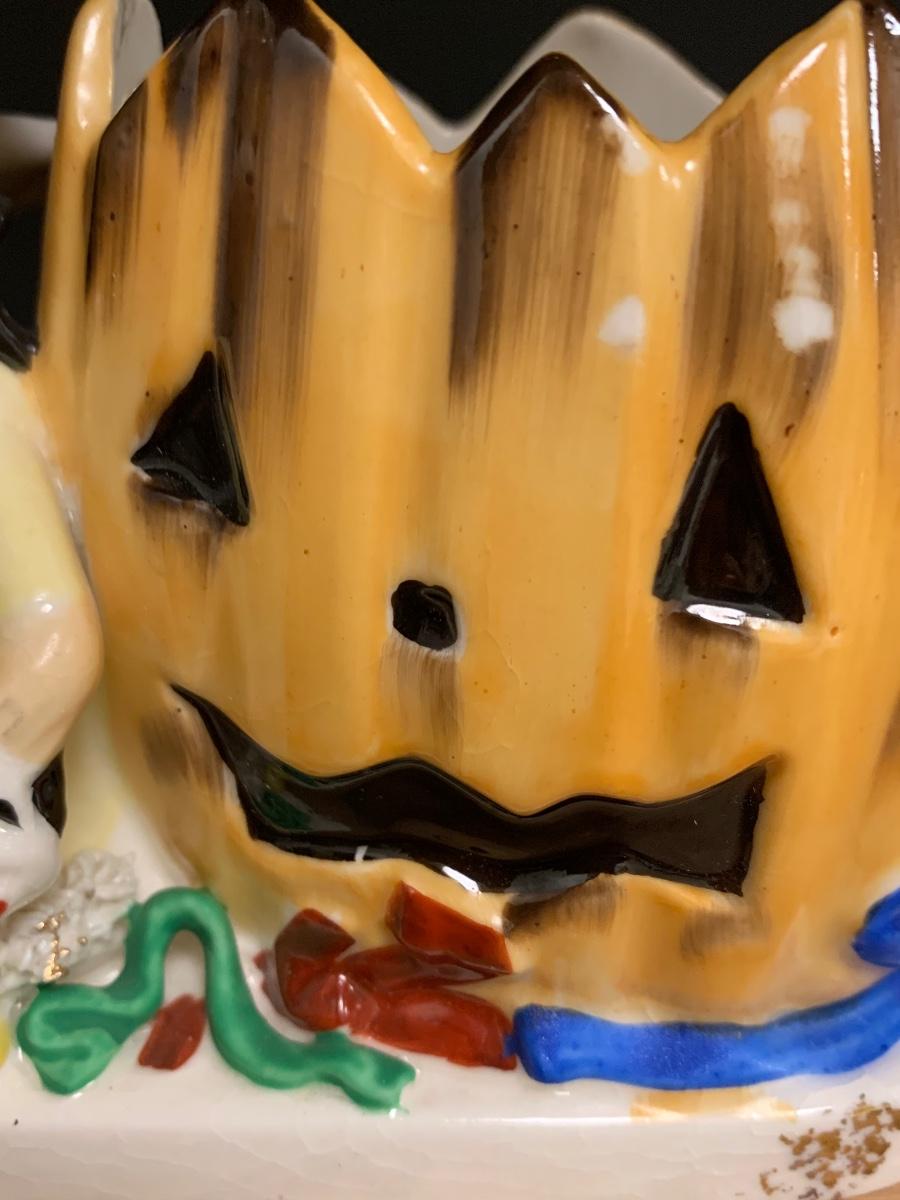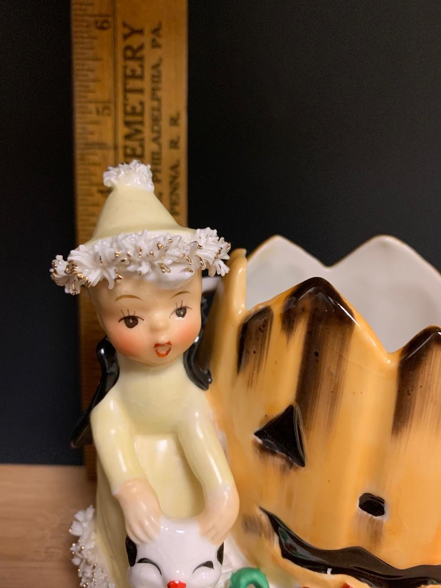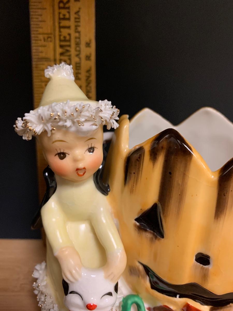 Vintage Napco Halloween Angel w/Spaghetti Trim and Pumpkin Planter along with a flying witch decoration.