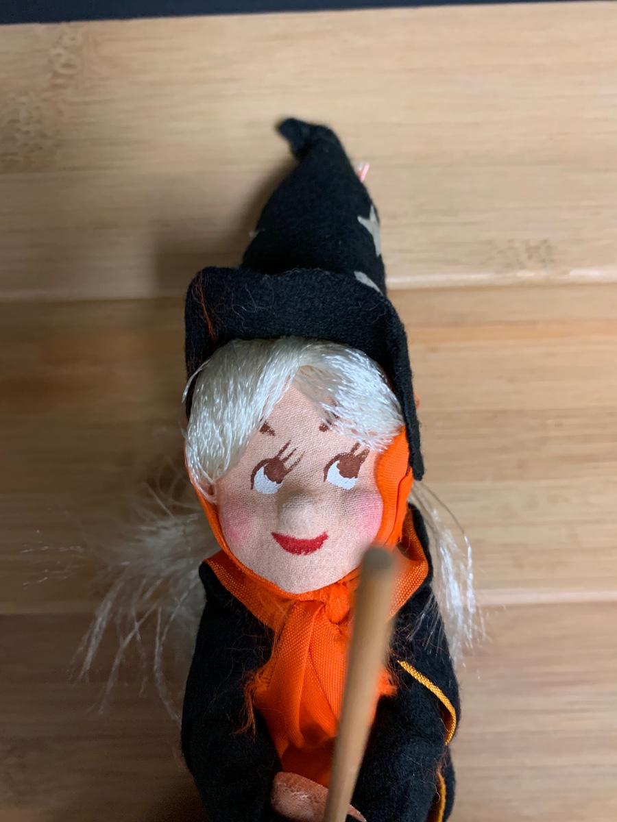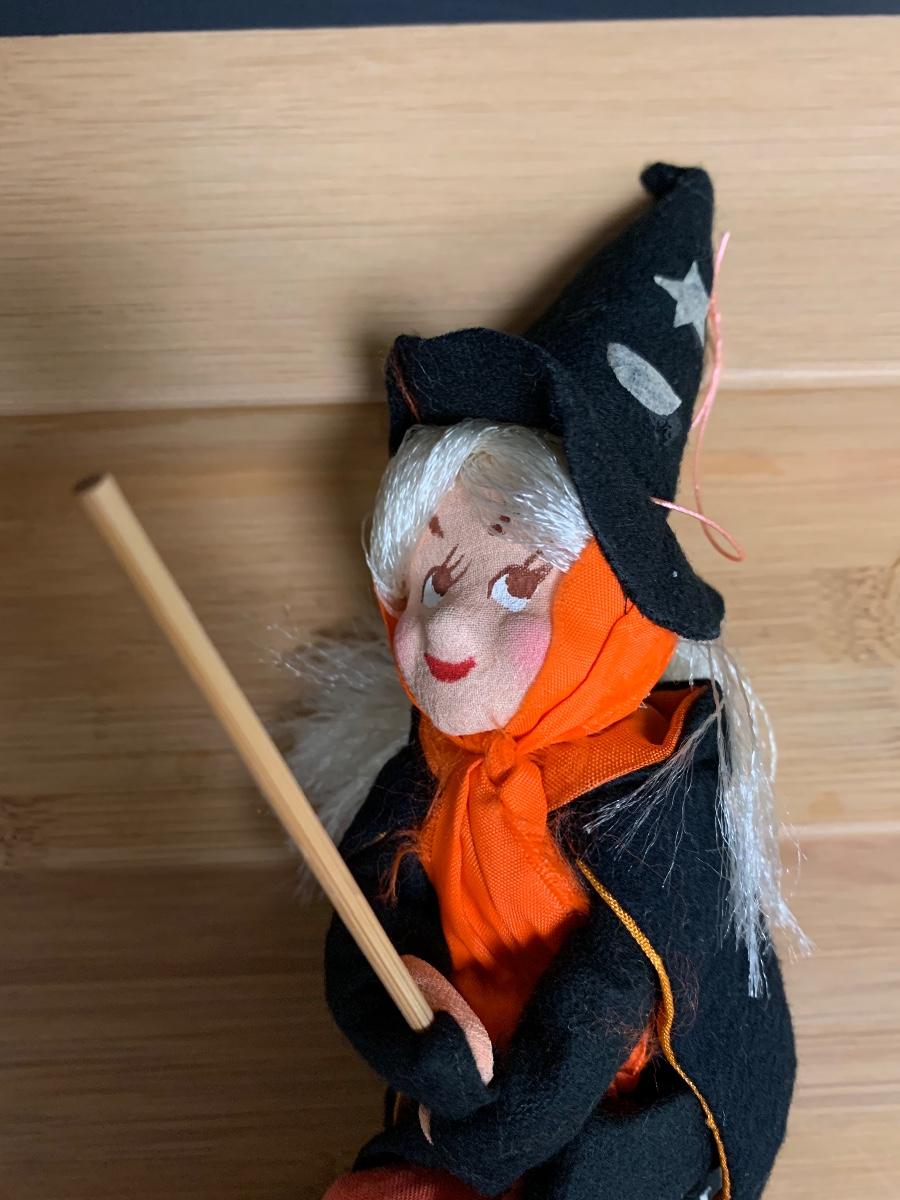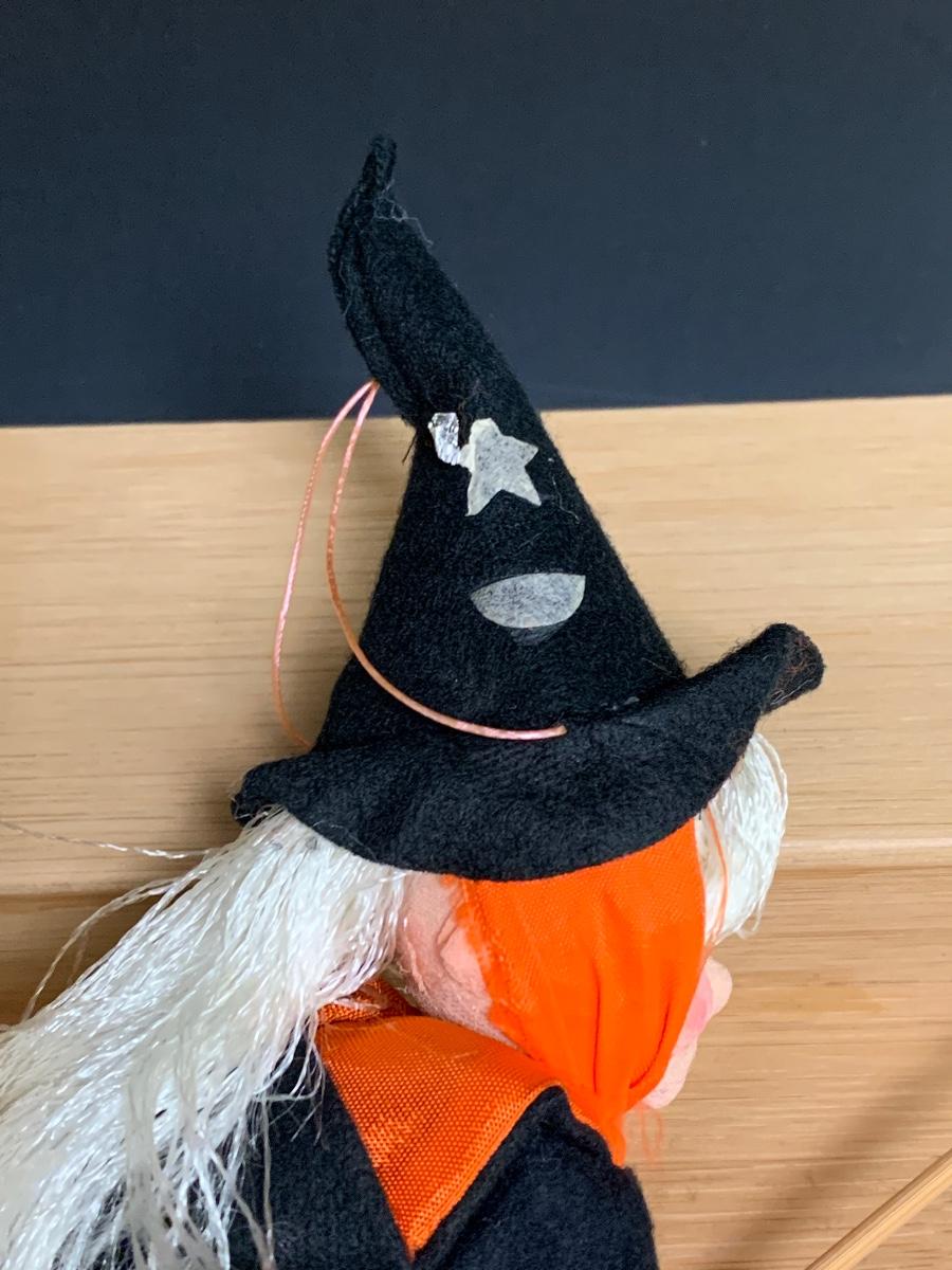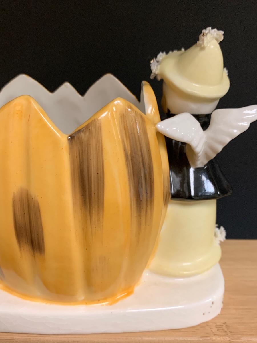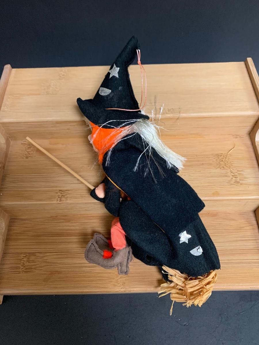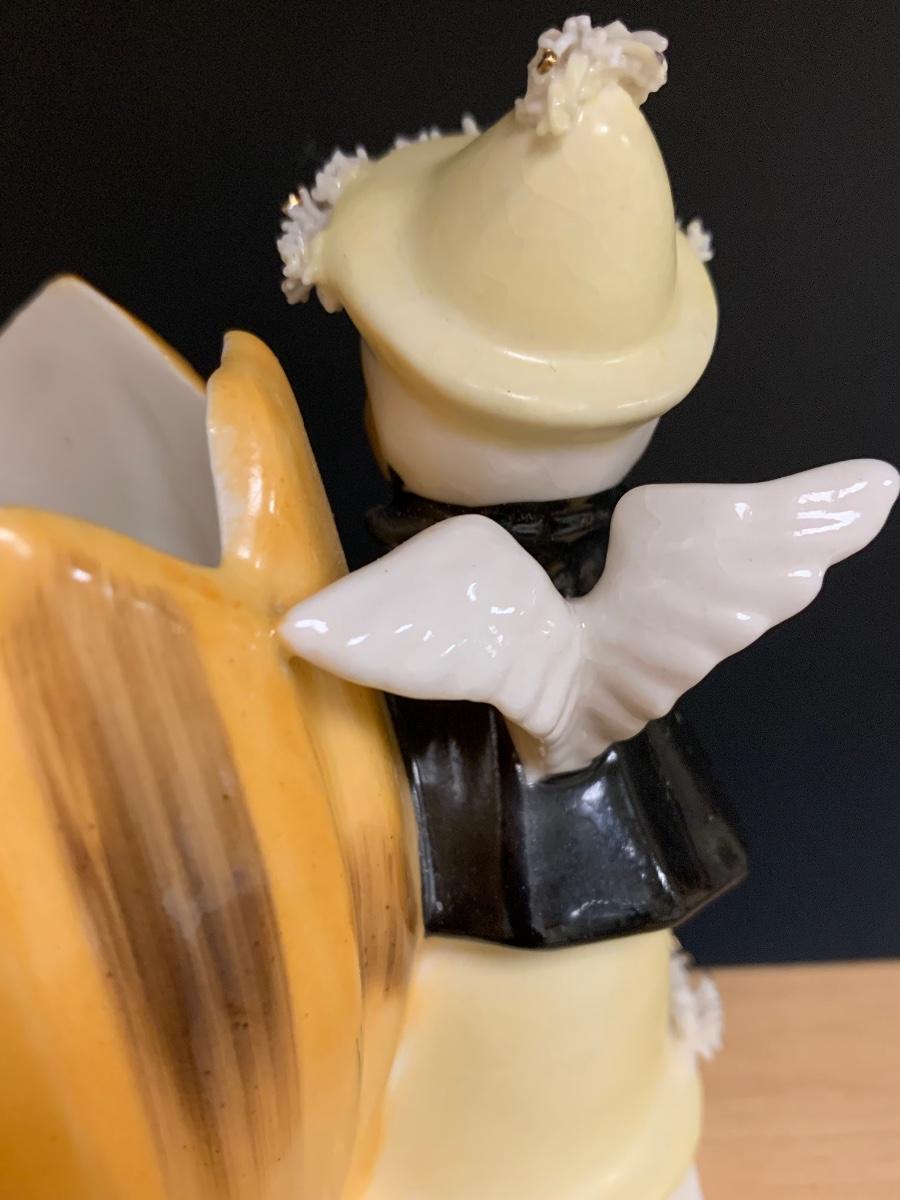 Vintage Napco Halloween Angel w/Spaghetti Trim and Pumpkin Planter along with a flying witch decoration.