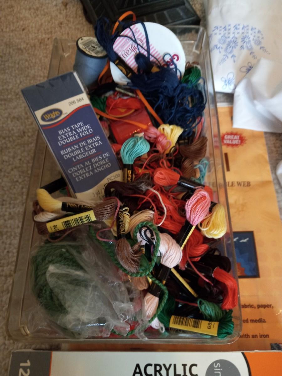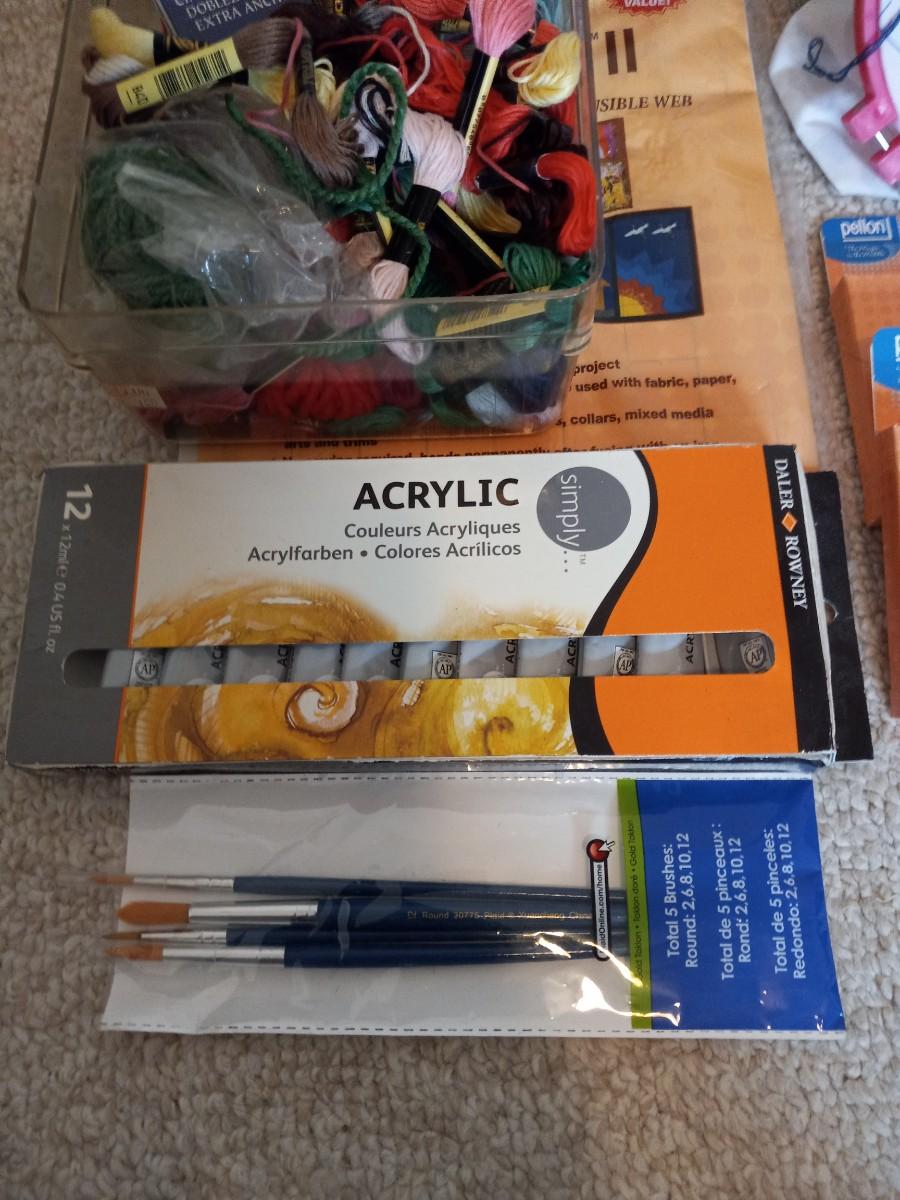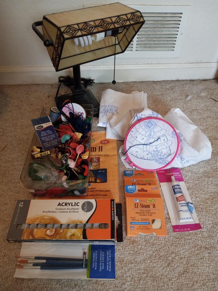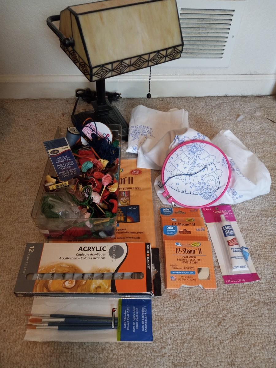 LOT 199 EMBROIDERY THREAD, ACRYLIC PAINTS, DESK LAMP AND MORE