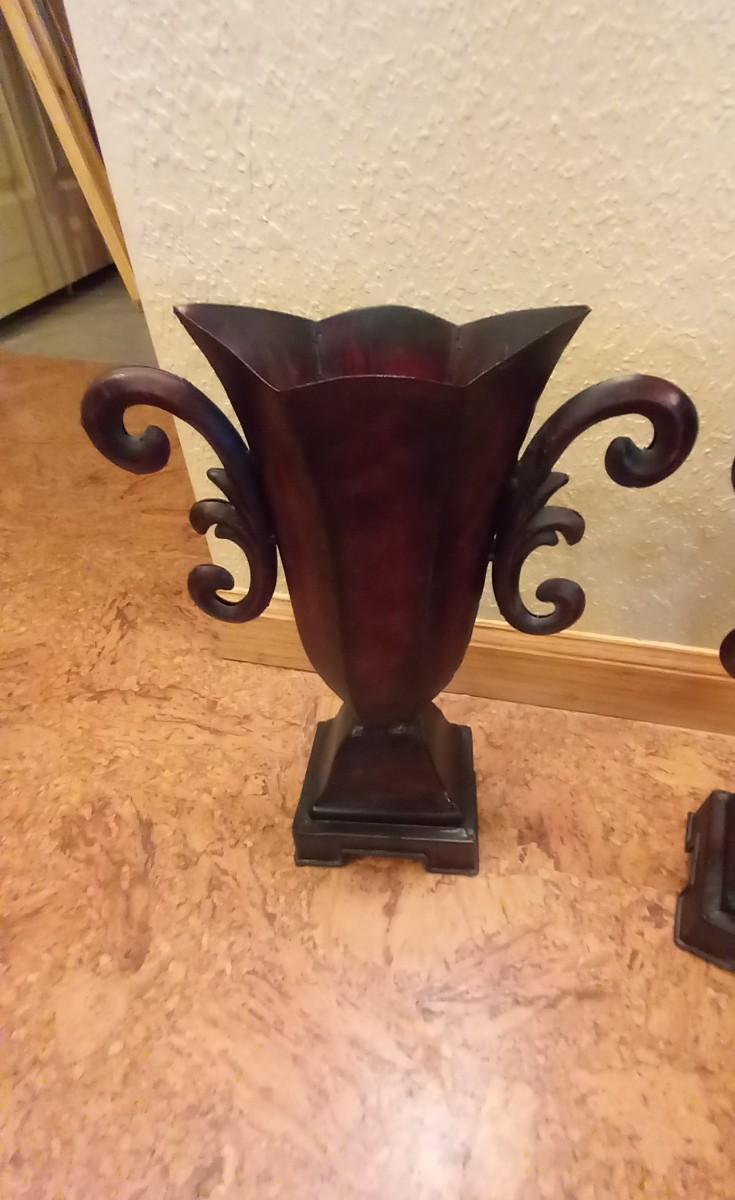 LOT 199 IRON CANDLE STAND AND TWO METAL VASES (HD)