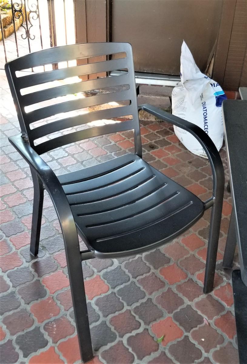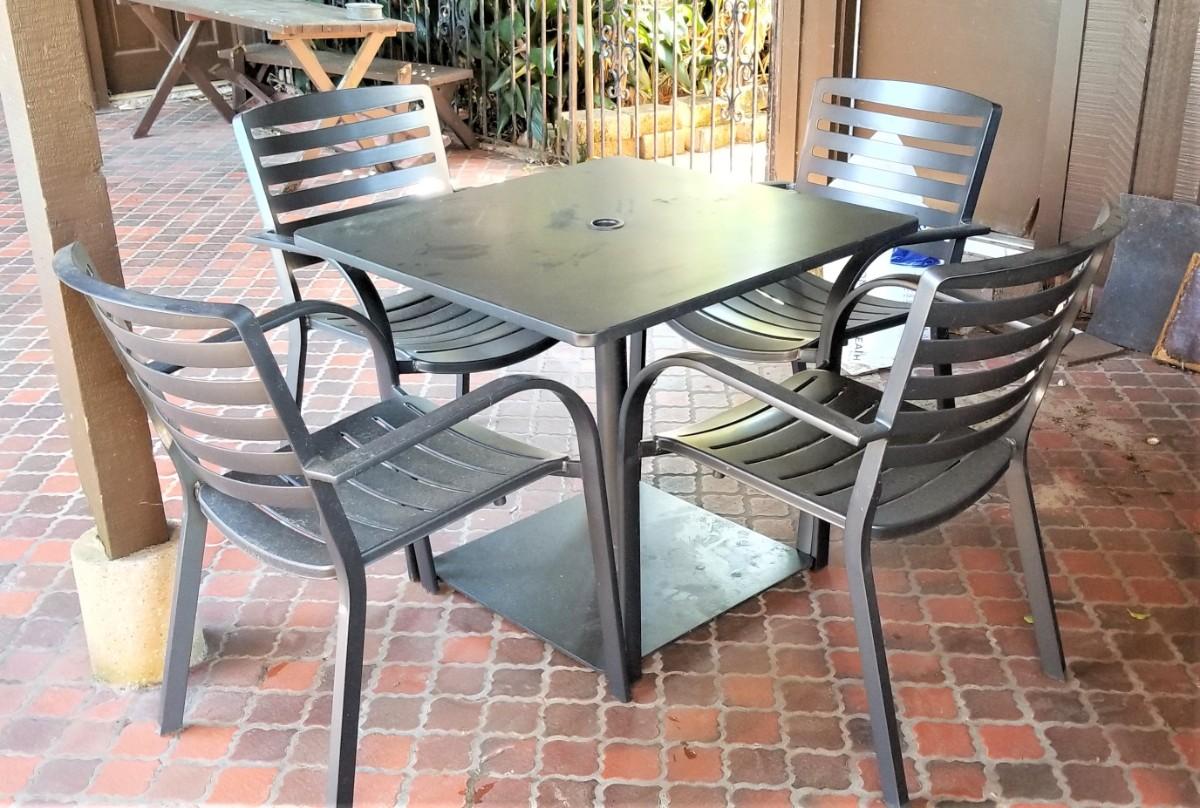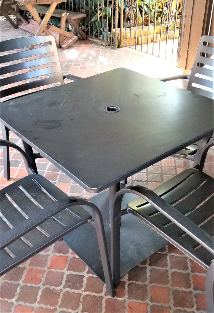 Good cast aluminum table with four matching chairs - hole for an umbrella in the table - table measures 32" x 32", 28.5" tall. Chairs are each 33" tall and 25.5" deep, 23" across. Sturdy and comfy. Good gently used condition.