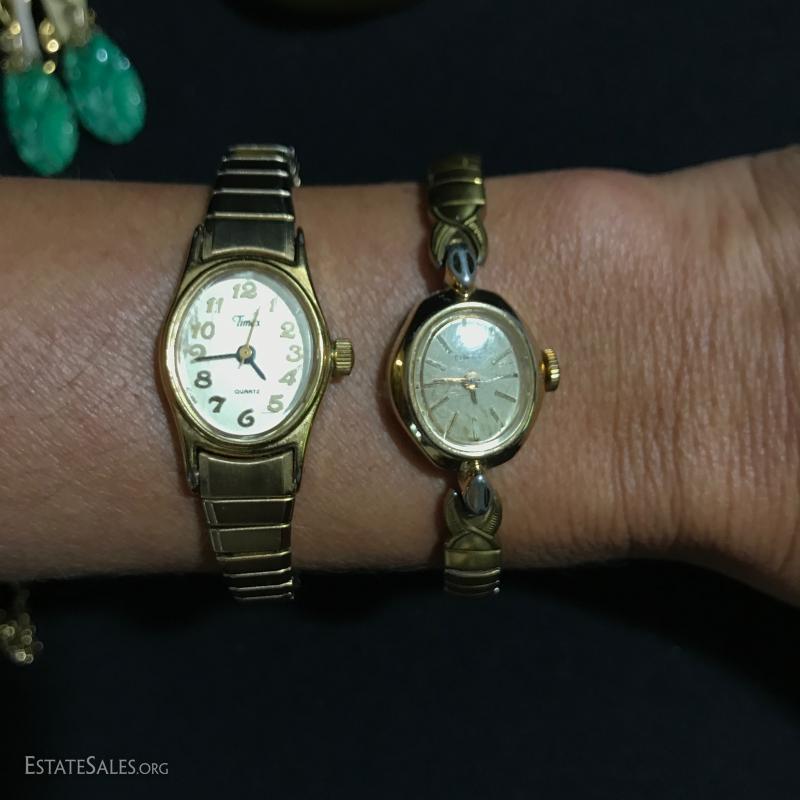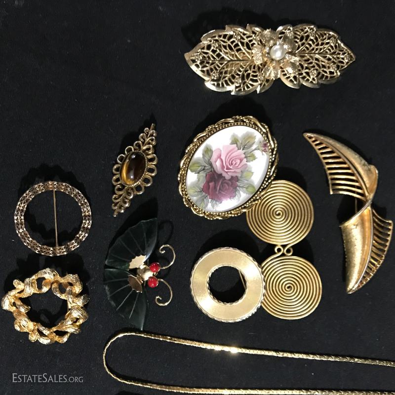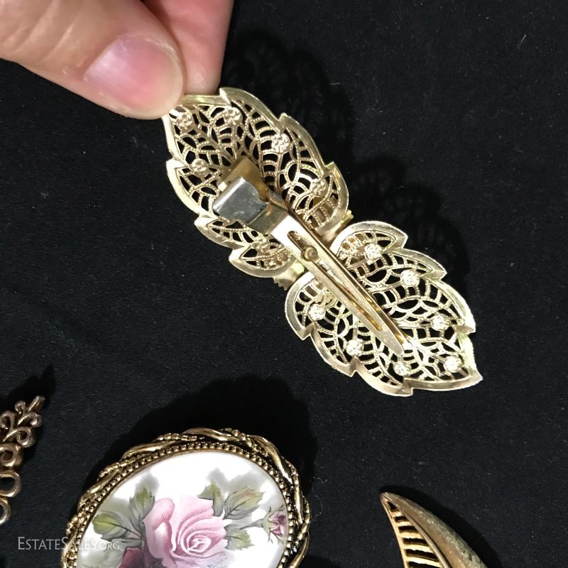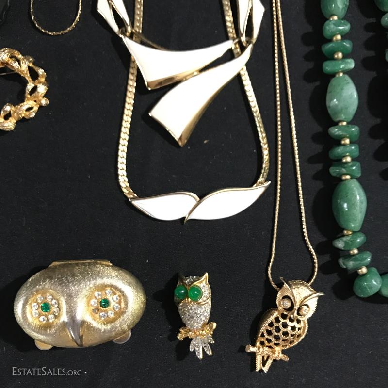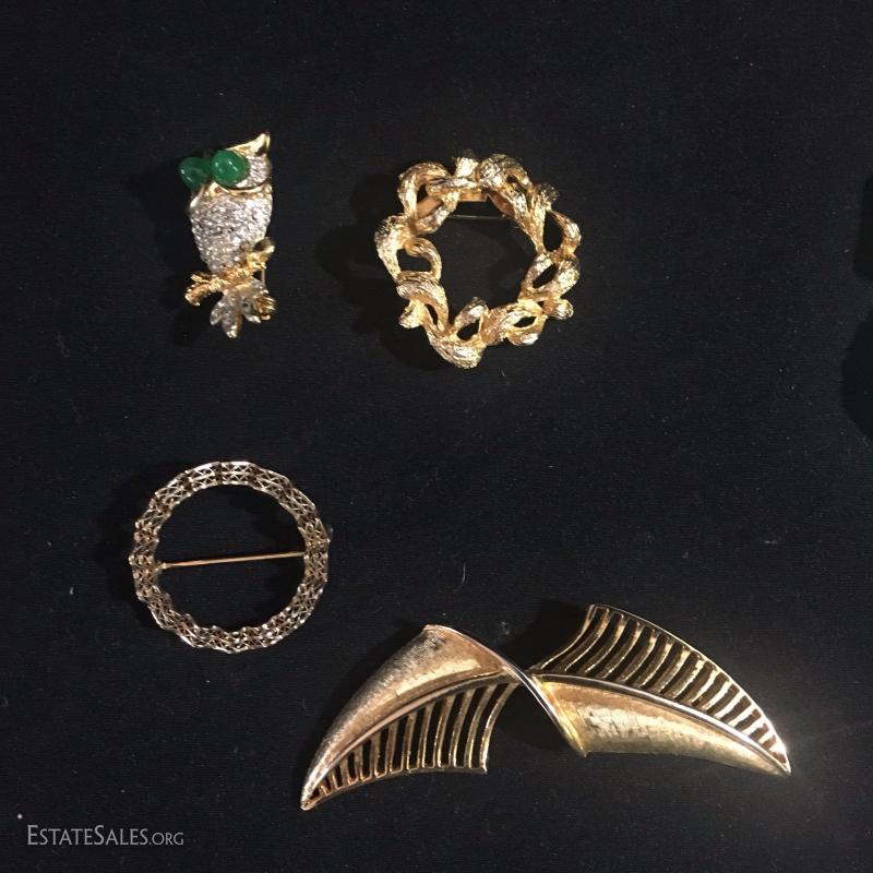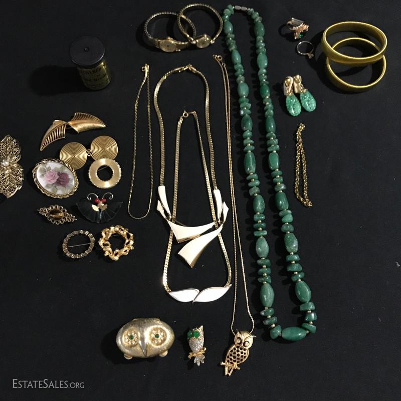 Necklaces (one marked Trifari), several pins, one hair clip, rings (green stone ring Marked DAC inside), earrings, bracelets and watches. See photos.