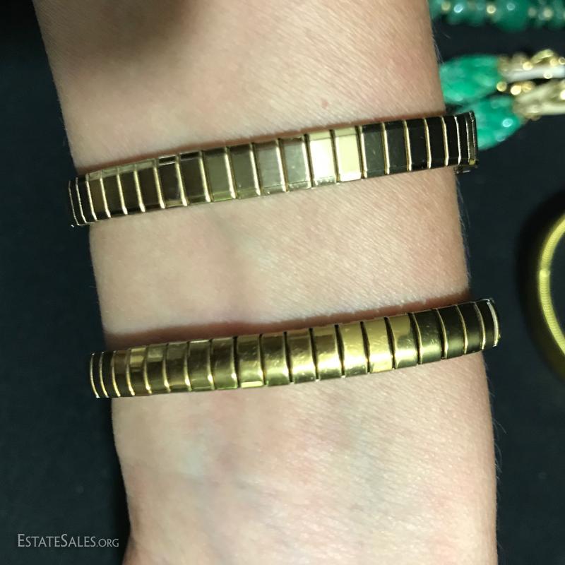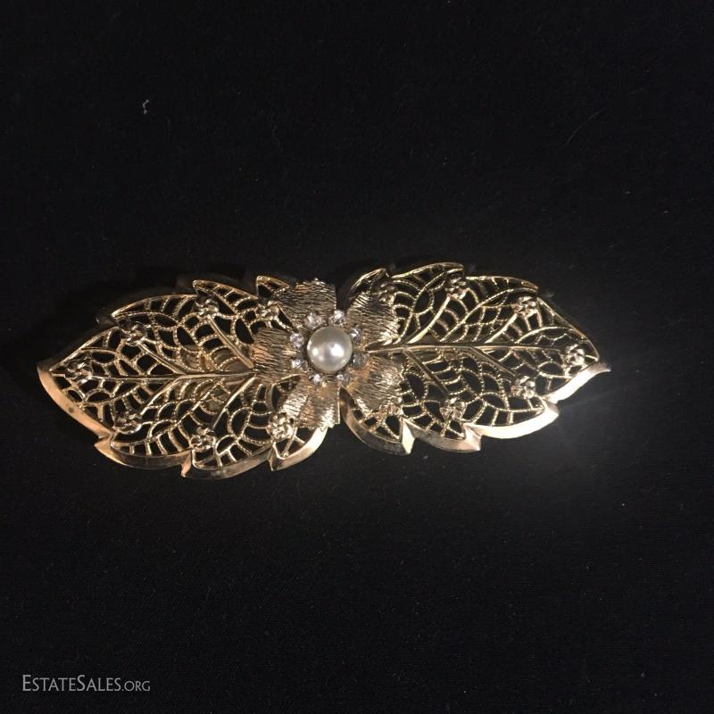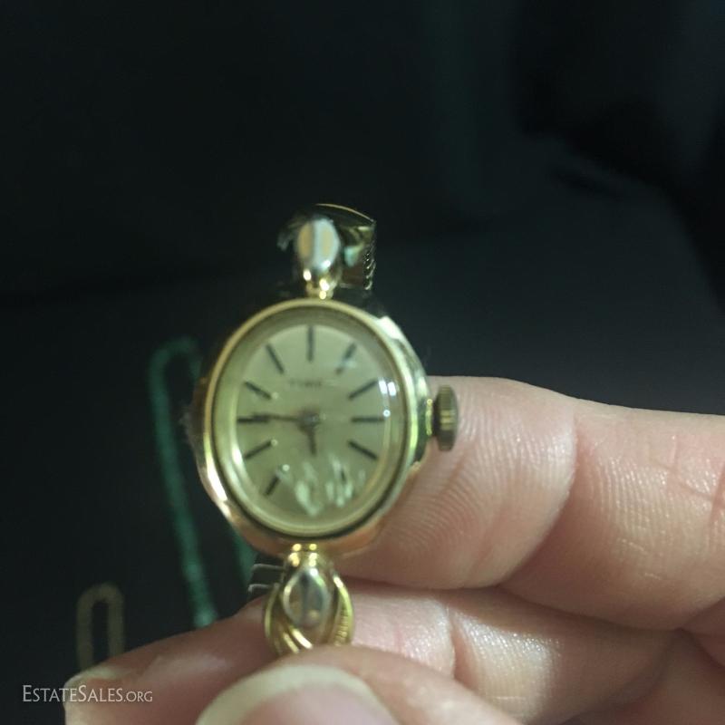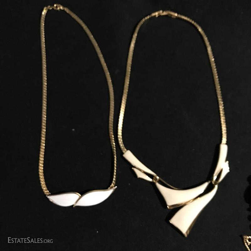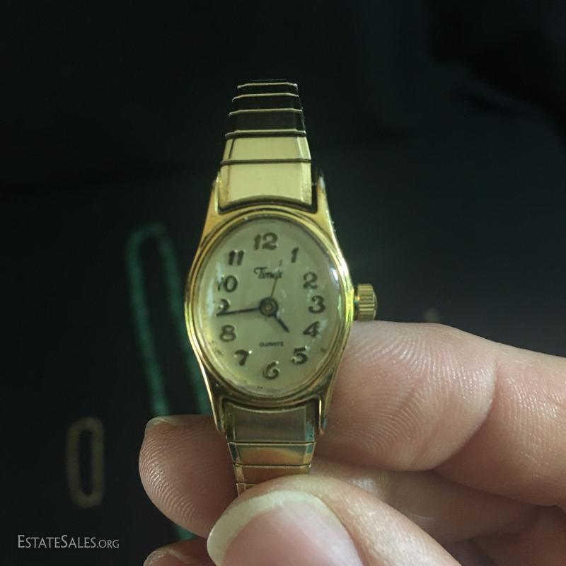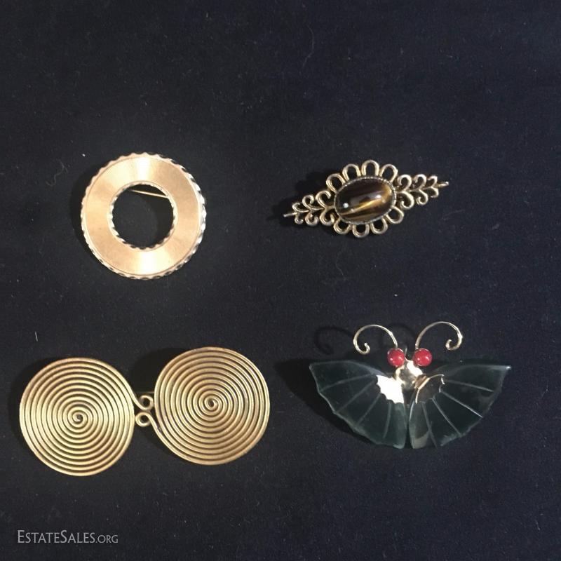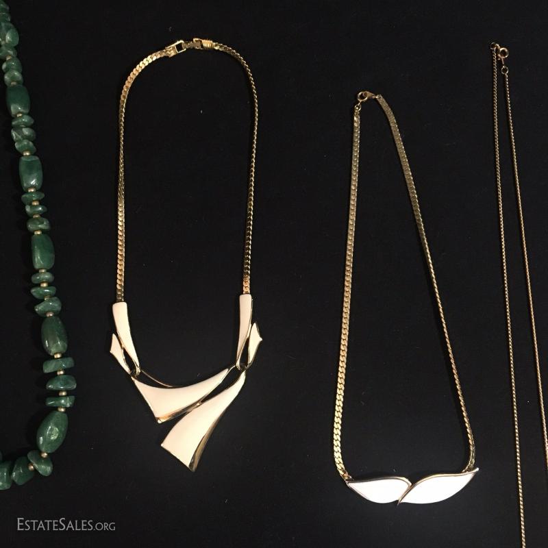 Necklaces (one marked Trifari), several pins, one hair clip, rings (green stone ring Marked DAC inside), earrings, bracelets and watches. See photos.
