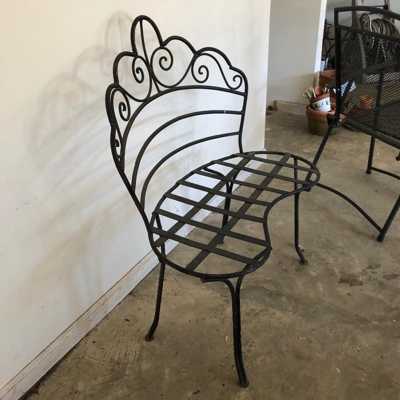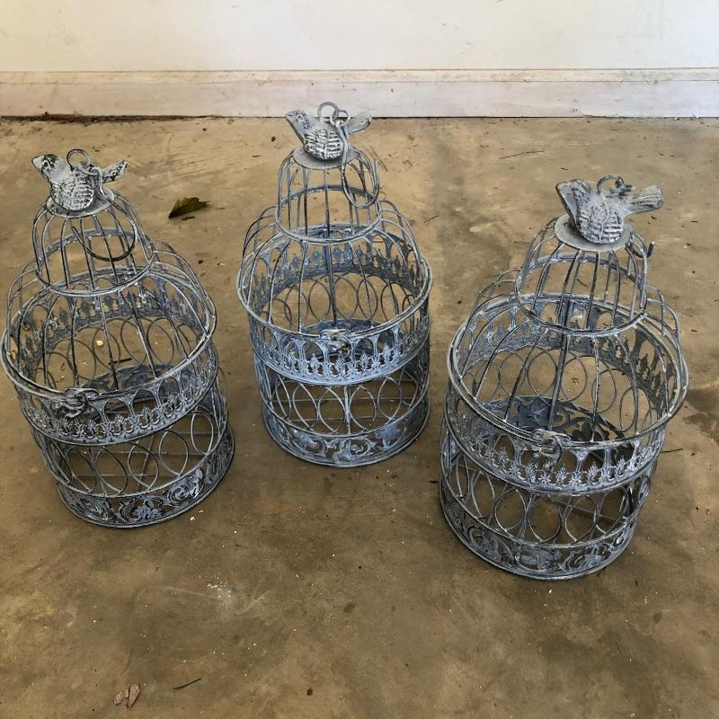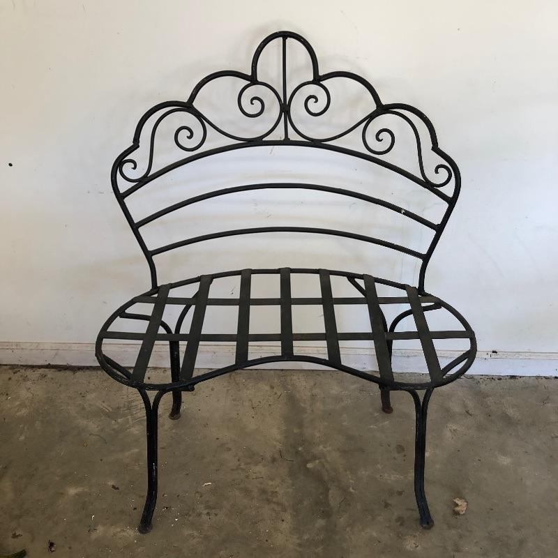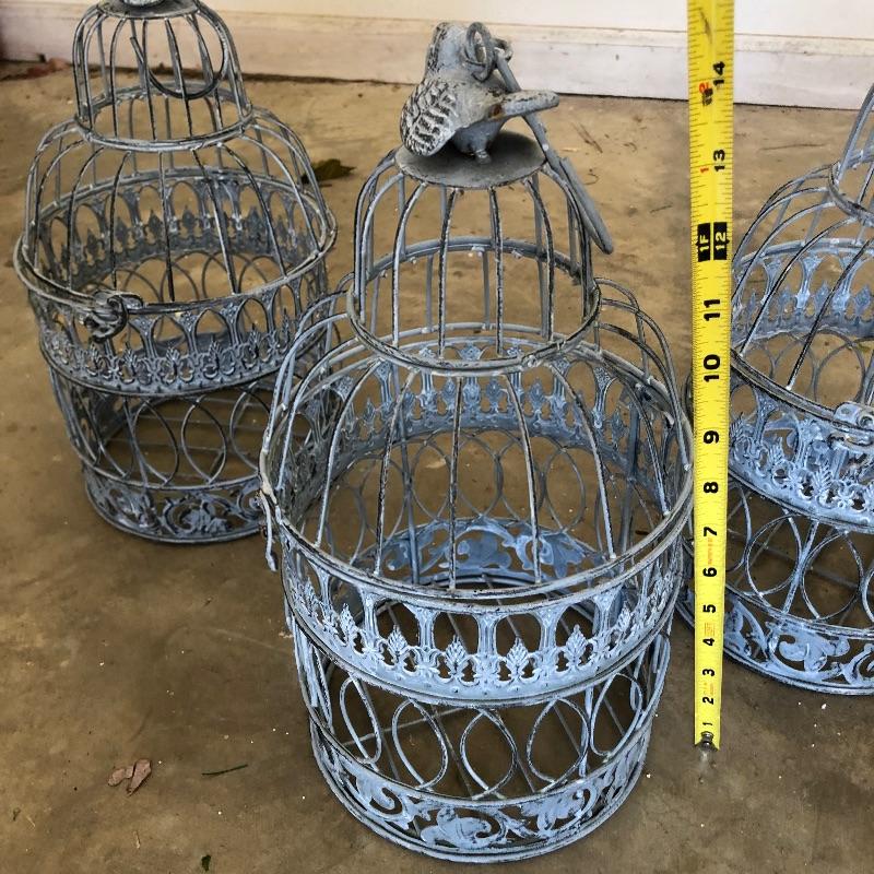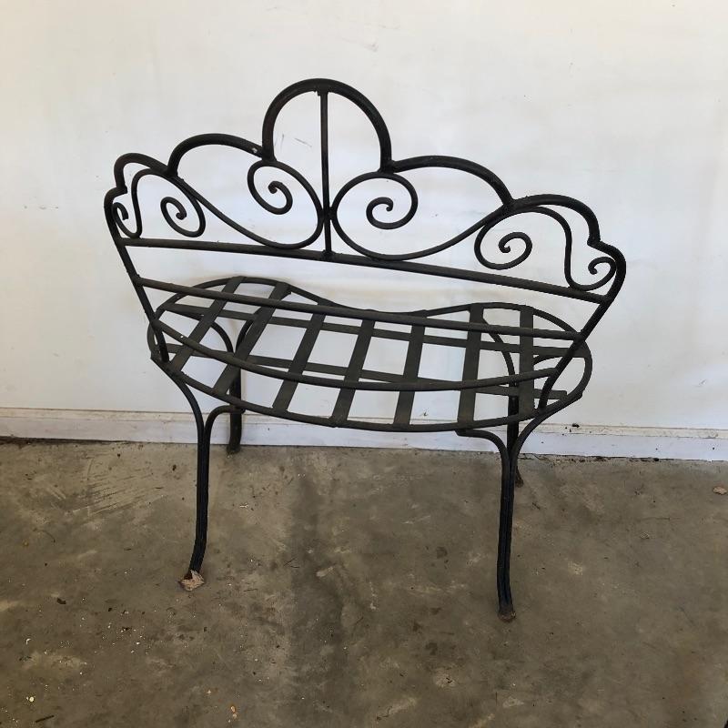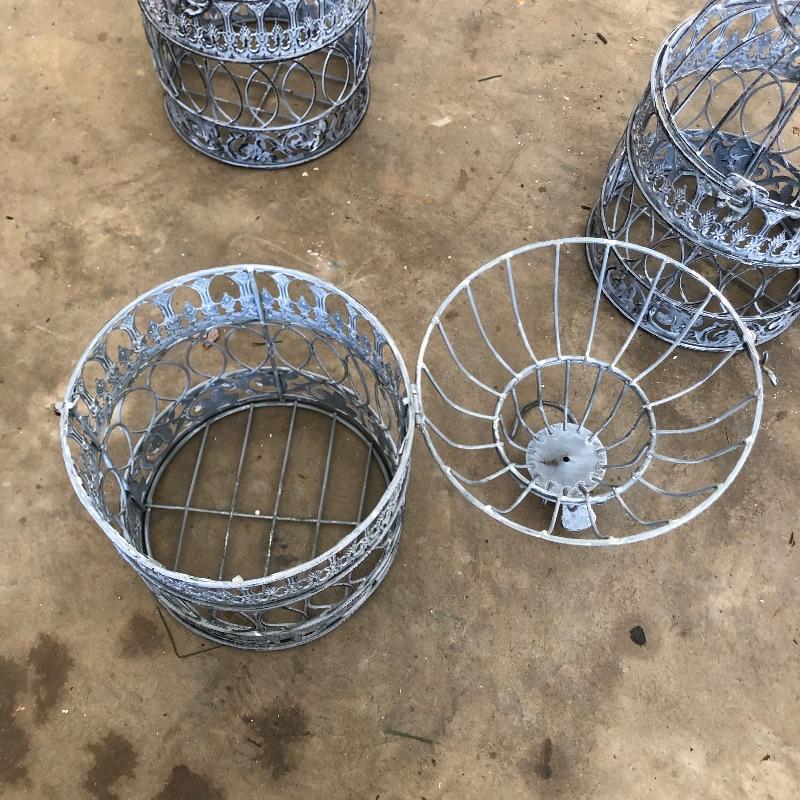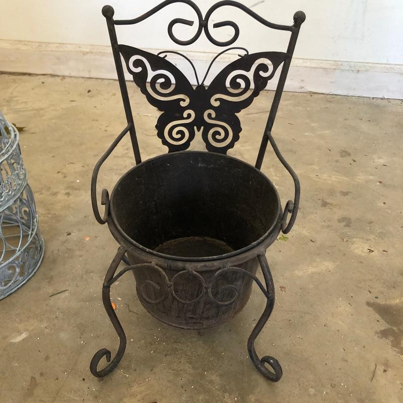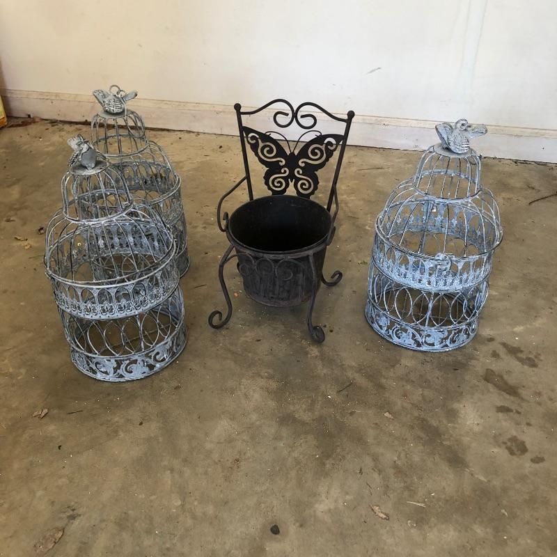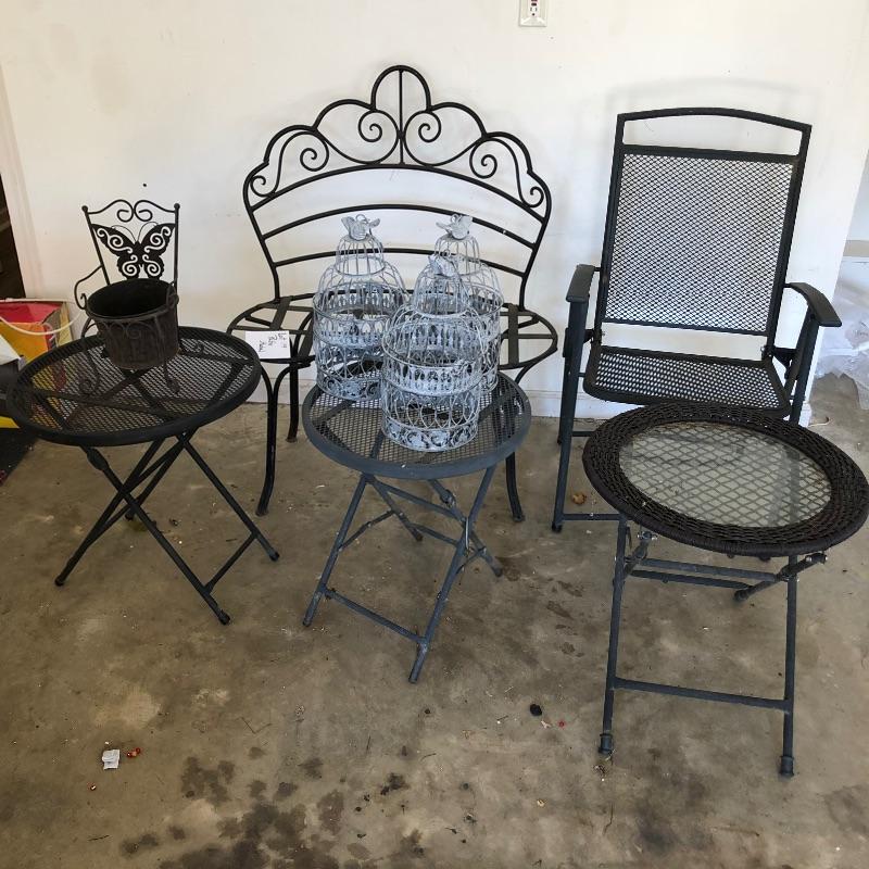A bit of a clean and possibly a paint touch up and this solid metal loveseat will look lovely by the front door or on your back porch and we have thrown in a can of black spray paint just for the job! Also included are 3 folding black metal small patio tables, two plant stand holders, a folding chair, cute metal butterfly planter and three small metal bird cage style hanging decor. These cages tops open and they have hooks to hang.