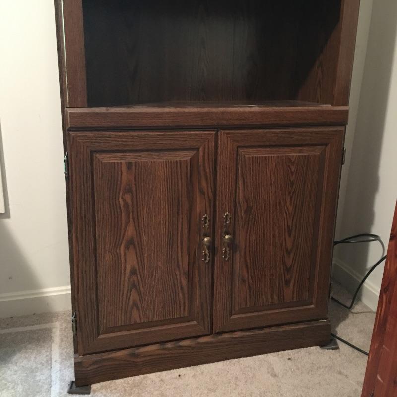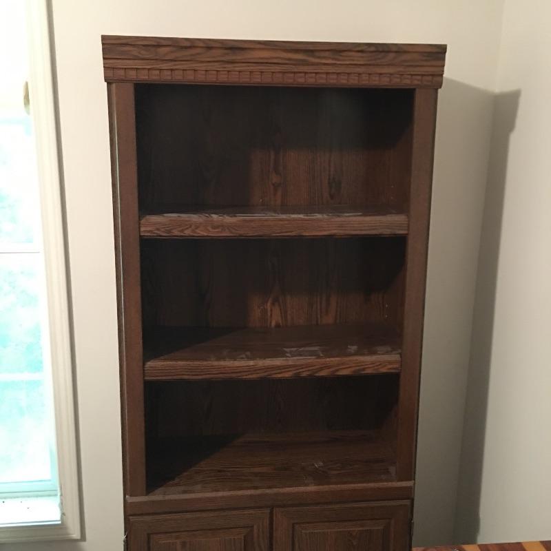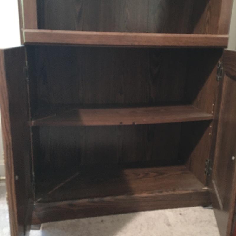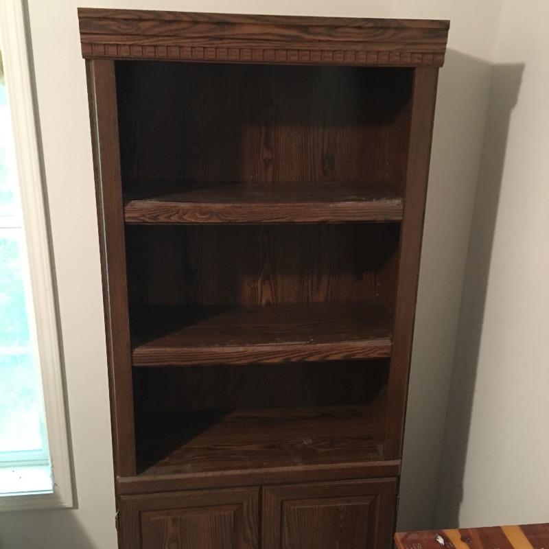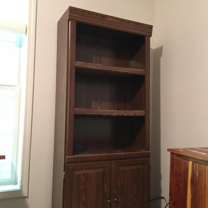 Matching cabinet and bookshelf. Lot includes locking cabinet with key and four adjustable shelves and a bookcase that measures with a cabinet underneath with one adjustable shelf. A great place to store your books also with a place to keep things out of sight. Bookcase measures 12.5” x 30” x 70” and cabinet measures 12” x 31.5” x 39.5” and are both pressed wood. Bring help, item is substantial and bookcase is on second floor.