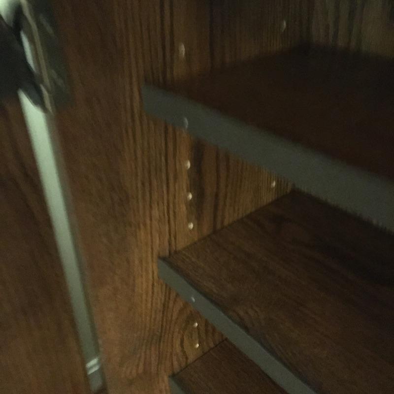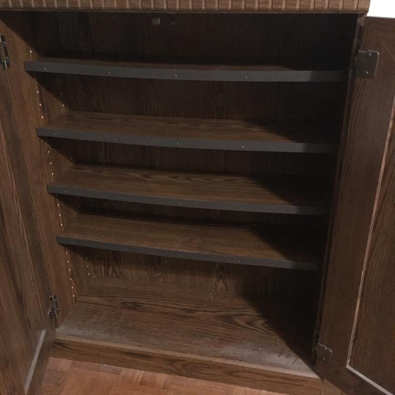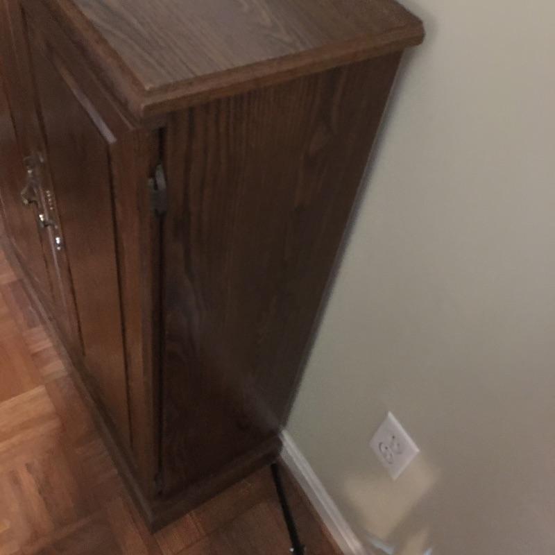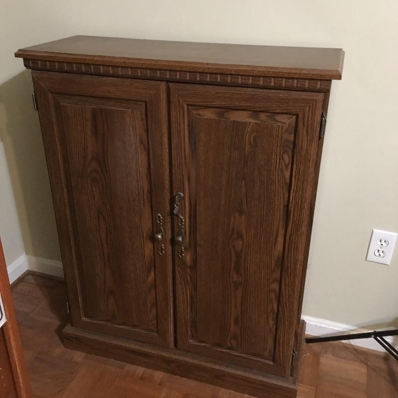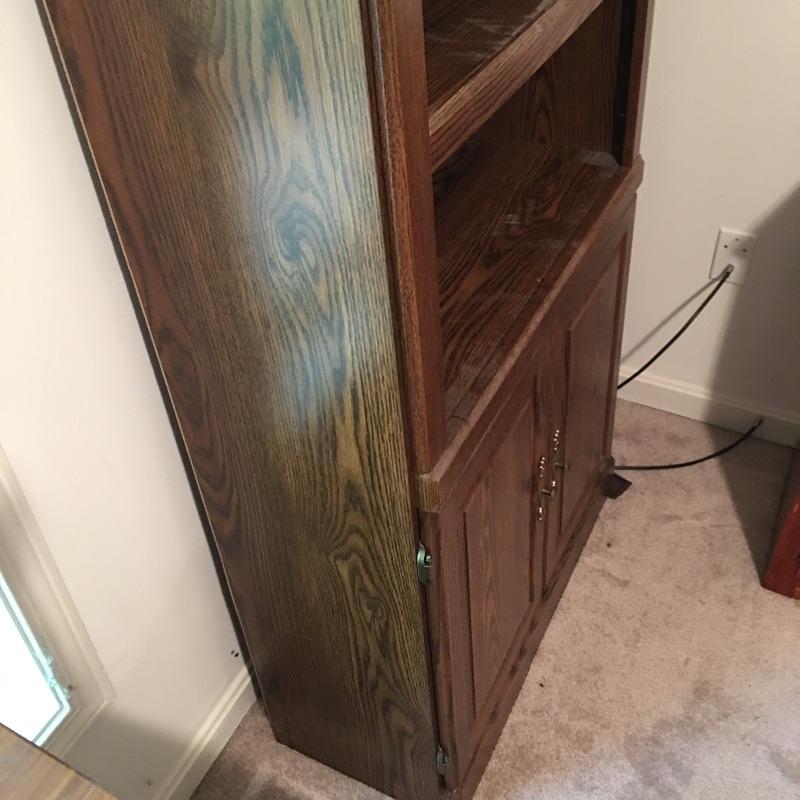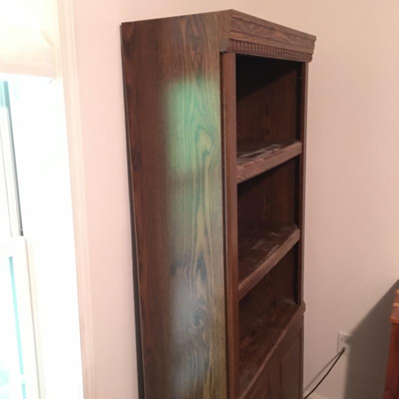 Matching cabinet and bookshelf. Lot includes locking cabinet with key and four adjustable shelves and a bookcase that measures with a cabinet underneath with one adjustable shelf. A great place to store your books also with a place to keep things out of sight. Bookcase measures 12.5” x 30” x 70” and cabinet measures 12” x 31.5” x 39.5” and are both pressed wood. Bring help, item is substantial and bookcase is on second floor.