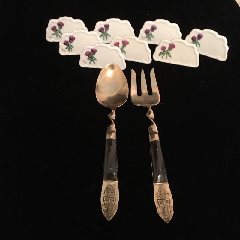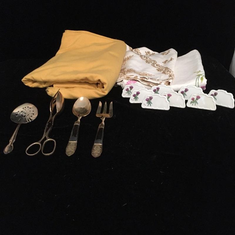 This fine dining lot includes four serving tools, eight place markers that seem to be ceramic and three table cloths. Be ready for any occasion with this refined lot. Yellow tablecloth measures 52” x 76”.