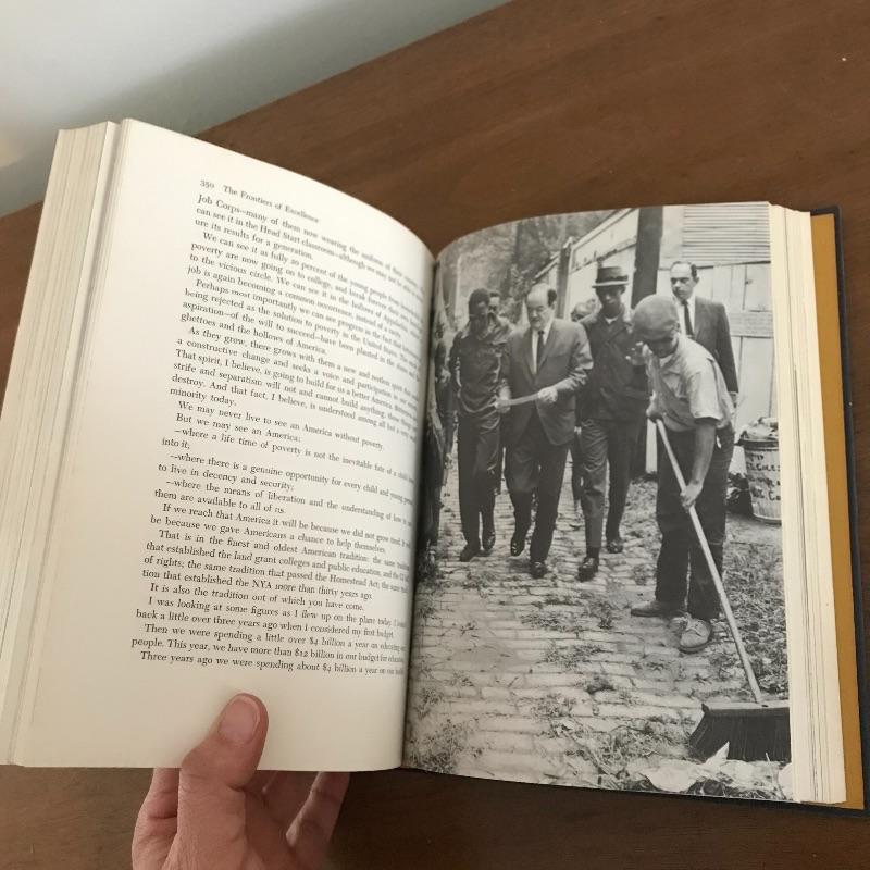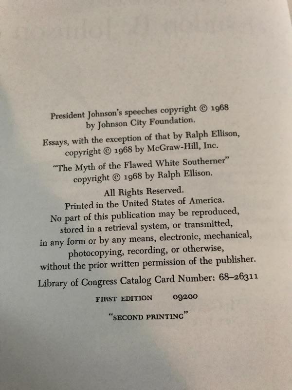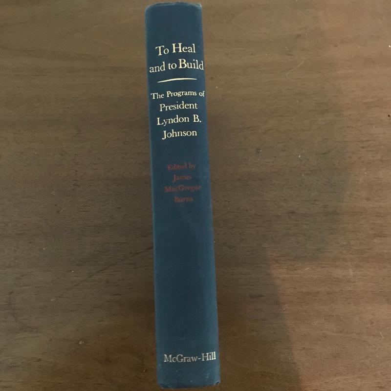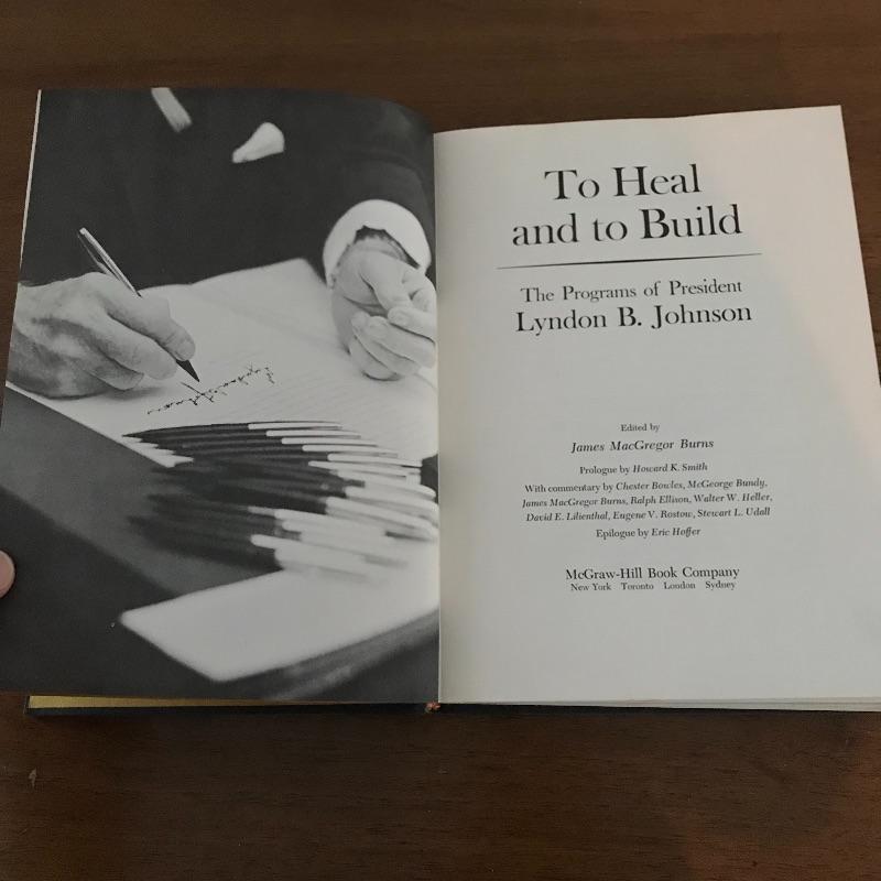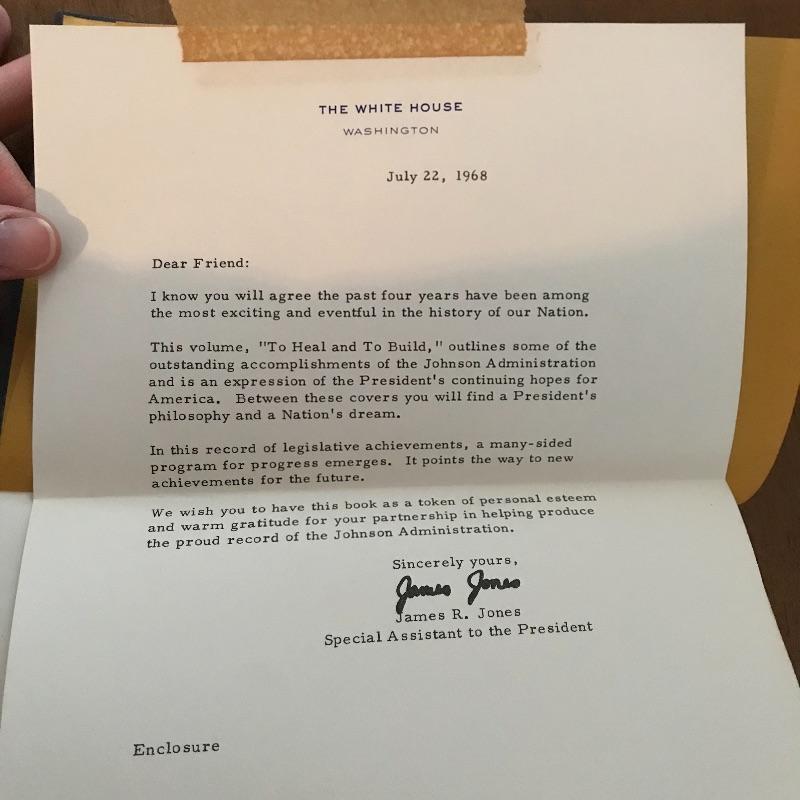 First Edition, second printing of To Heal and to Build, The Programs of President Lyndon B. Johnson. Book is accompanied by What appears to be an official White House letter from James R. Jones, Special Assistant to the President. Book has mild sun bleaching and a significant blemish on back cover, but in excellent condition otherwise. See photos. Come to the preview to see this amazing artifact for yourself! Shipping available.