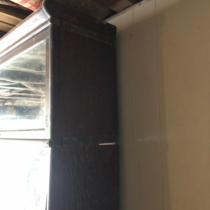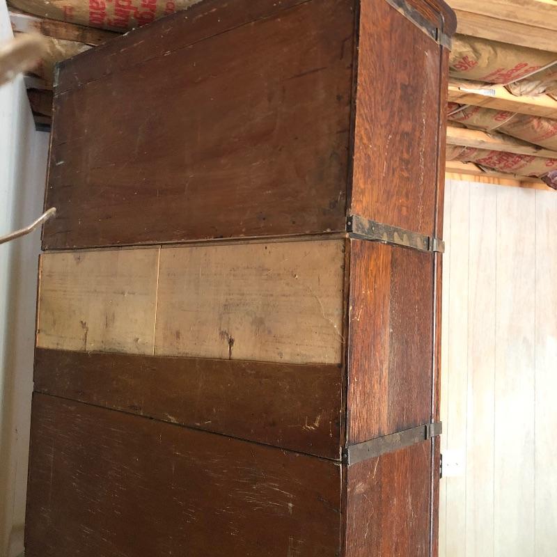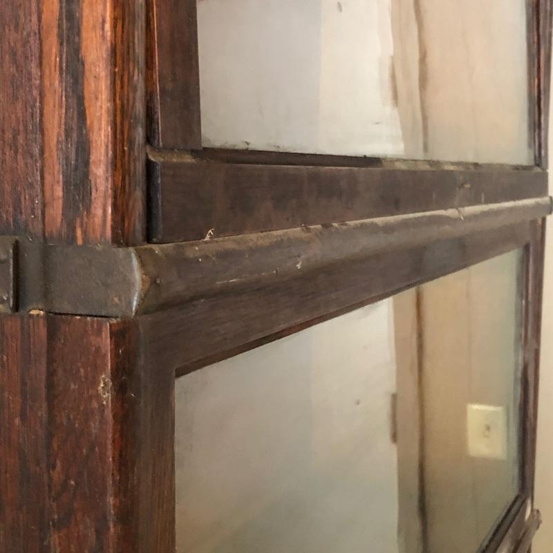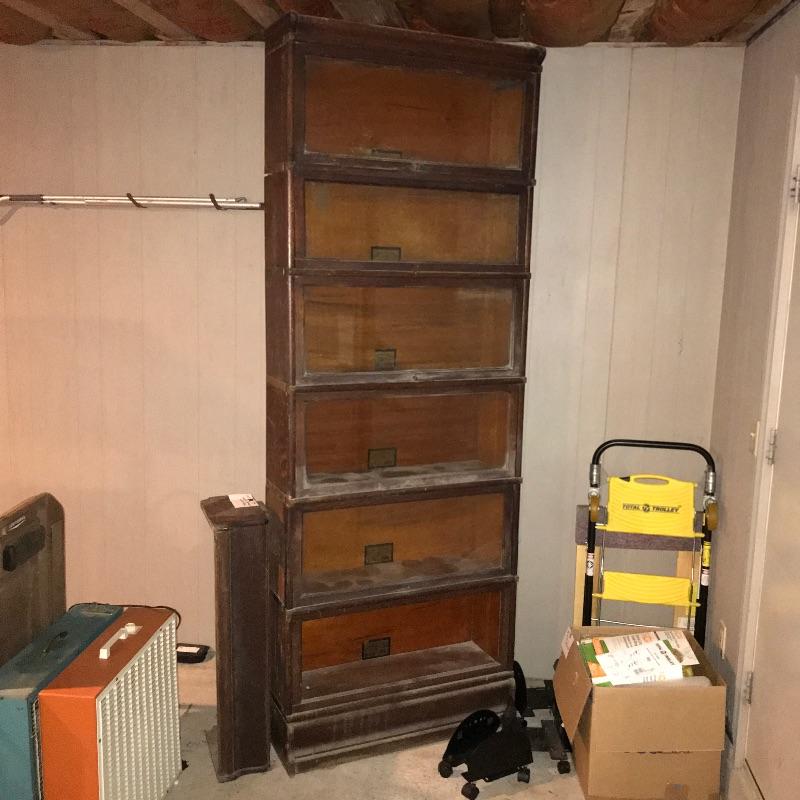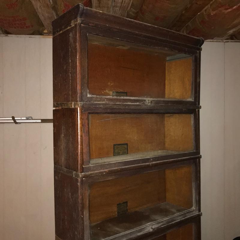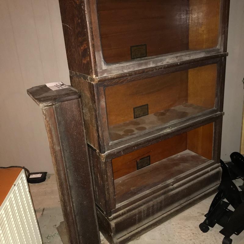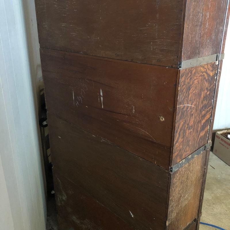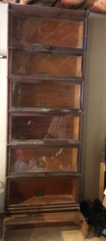 Globe-Wernicke Lawyers book shelf with 6 components of shelves with pull up glass doors. These come apart to make as tall or as short as you want. Make two shorter bookcases by using the extra base that comes with this lot(although you would need a top to make it complete! Needs a little love since it was stored in the garage...glass is missing from bottom shelf and 2 knobs missing and wood is a bit blemished -see photos. An extra base is included. Dark colored wood stain on outside with lighter color inside. Shelf has blemishes throughout however with a bit of sanding and fresh stain this old beauty should shine again. The back of one unit has some of wood missing but easily hidden as it is on back. Other items next to shelves are not included in this lot. Piece measures 34” x 11” x 94”. Local pickup only.