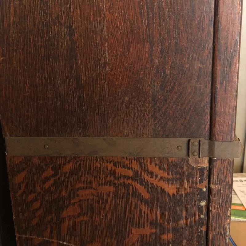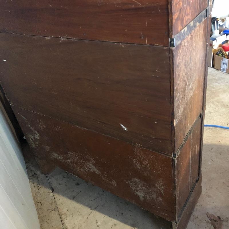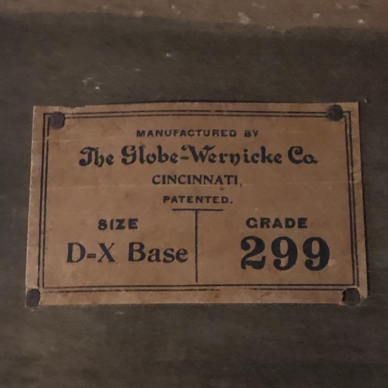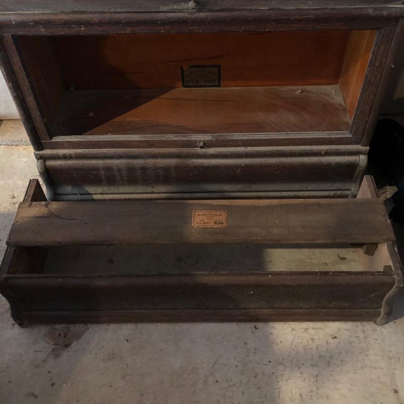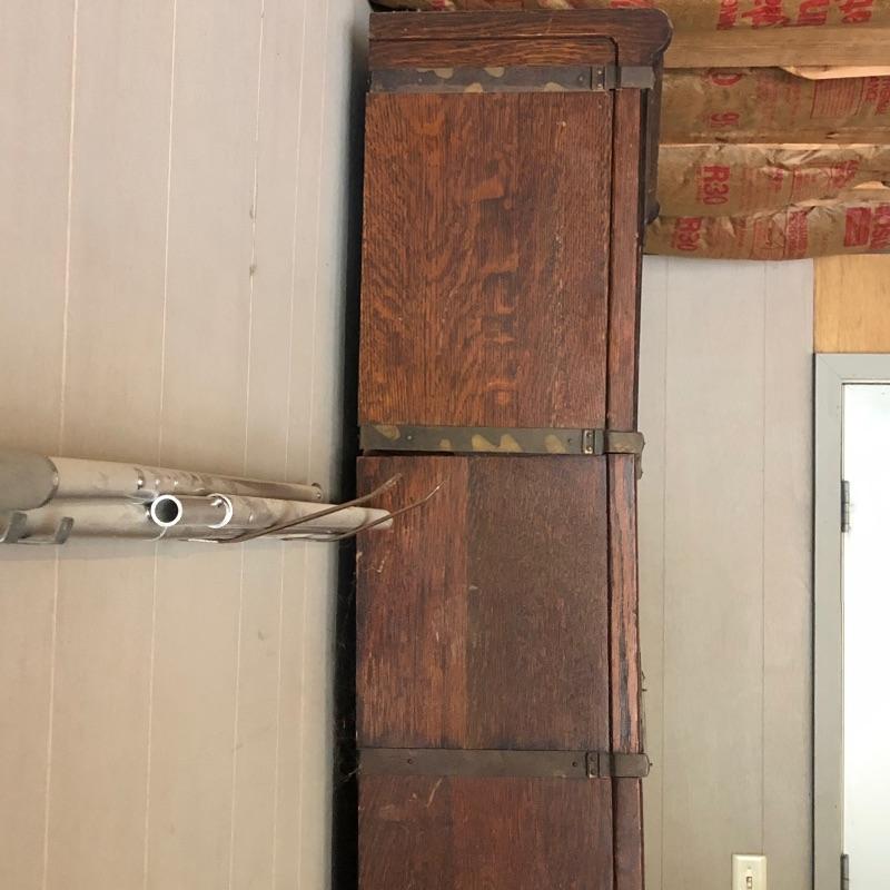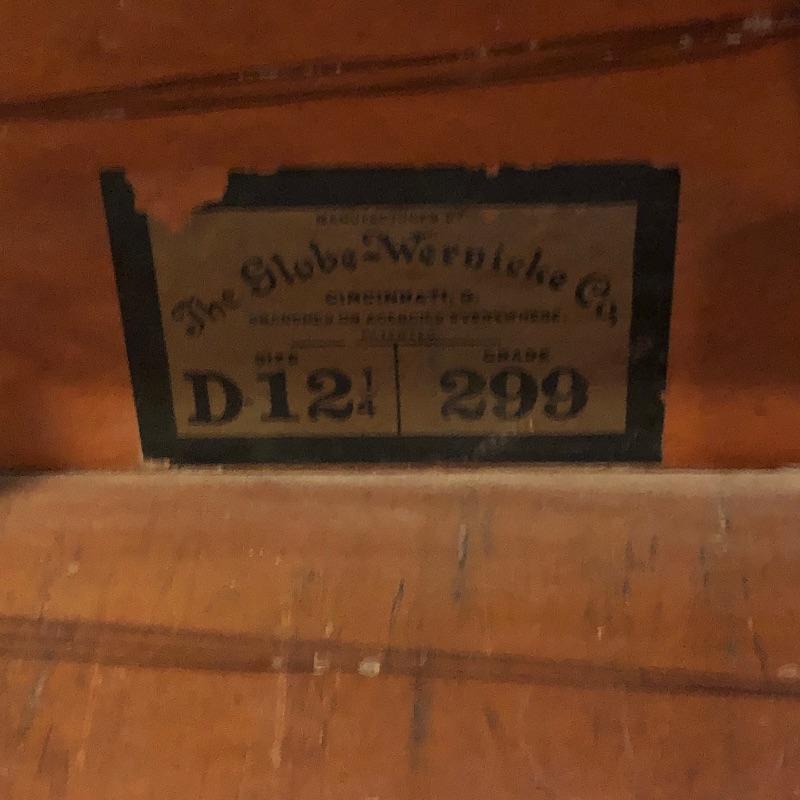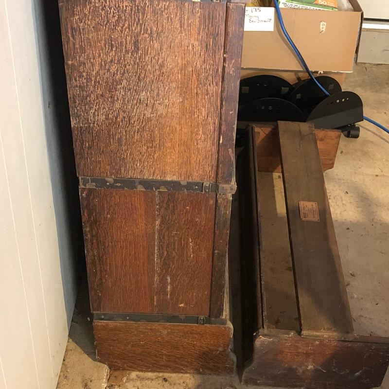Globe-Wernicke Lawyers book shelf with 6 components of shelves with pull up glass doors. These come apart to make as tall or as short as you want. Make two shorter bookcases by using the extra base that comes with this lot(although you would need a top to make it complete! Needs a little love since it was stored in the garage...glass is missing from bottom shelf and 2 knobs missing and wood is a bit blemished -see photos. An extra base is included. Dark colored wood stain on outside with lighter color inside. Shelf has blemishes throughout however with a bit of sanding and fresh stain this old beauty should shine again. The back of one unit has some of wood missing but easily hidden as it is on back. Other items next to shelves are not included in this lot. Piece measures 34” x 11” x 94”. Local pickup only.