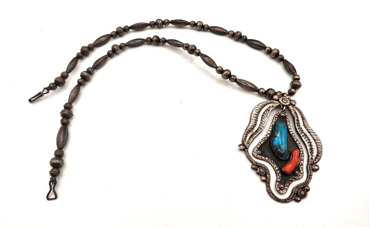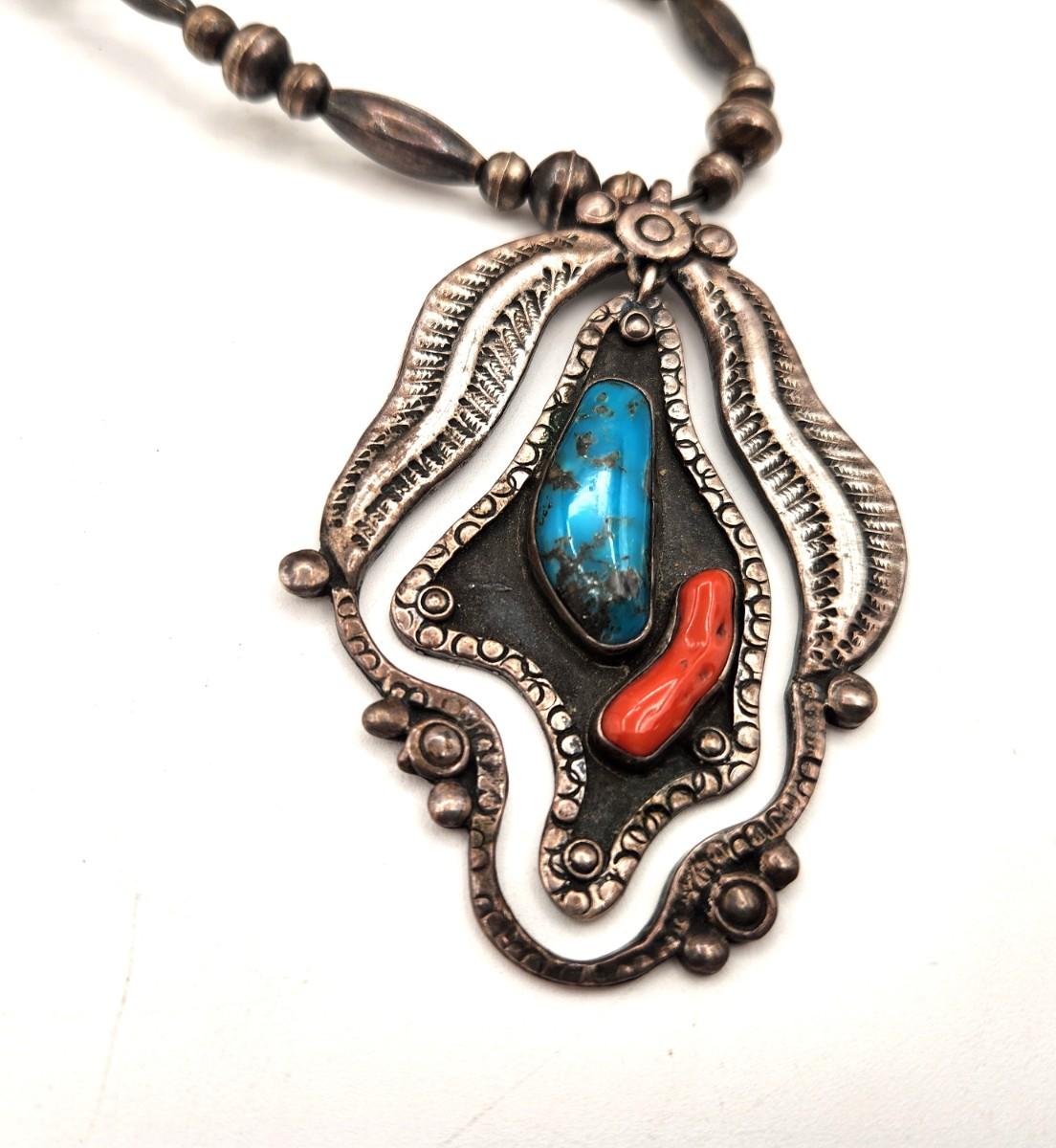This necklace is likely Native American (definitely an artisan piece) but as it is unsigned I must list as Southwest style. Unmarked but tests Sterling - 22" long not counting the pendant - pendant is 3.25" long. Set with natural turquoise and carnelian. A beautiful piece!